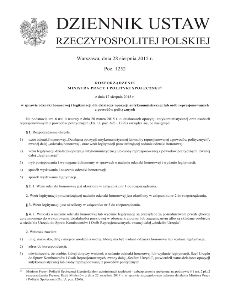 DZIENNIK USTAW RZECZYPOSPOLITEJ POLSKIEJ Warszawa, dnia 28 sierpnia 2015 r. Poz. 1252 Rozporządzenie Ministra Pracy i Polityki społecznej 1) z dnia 17 sierpnia 2015 r. w sprawie odznaki honorowej i legitymacji dla działaczy opozycji antykomunistycznej lub osób represjonowanych z powodów politycznych Na podstawie art. 6 ust. 4 ustawy z dnia 20 marca 2015 r. o działaczach opozycji antykomunistycznej oraz osobach represjonowanych z powodów politycznych (Dz. U. poz. 693 i 1220) zarządza się, co następuje: § 1. Rozporządzenie określa: 1) wzór odznaki honorowej „Działacza opozycji antykomunistycznej lub osoby represjonowanej z powodów politycznych”, zwanej dalej „odznaką honorową”, oraz wzór legitymacji potwierdzającej nadanie odznaki honorowej; 2) wzór legitymacji działacza opozycji antykomunistycznej lub osoby represjonowanej z powodów politycznych, zwanej dalej „legitymacją”; 3) tryb postępowania i wymagane dokumenty w sprawach o nadanie odznaki honorowej i wydanie legitymacji; 4) sposób wydawania i noszenia odznaki honorowej; 5) sposób wydawania legitymacji. § 2. 1. Wzór odznaki honorowej jest określony w załączniku nr 1 do rozporządzenia. 2. Wzór legitymacji potwierdzającej nadanie odznaki honorowej jest określony w załączniku nr 2 do rozporządzenia. § 3. Wzór legitymacji jest określony w załączniku nr 3 do rozporządzenia. § 4. 1. Wnioski o nadanie odznaki honorowej lub wydanie legitymacji są przesyłane za pośrednictwem przedsiębiorcy uprawnionego do wykonywania działalności pocztowej w obrocie krajowym lub zagranicznym albo są składane osobiście w siedzibie Urzędu do Spraw Kombatantów i Osób Represjonowanych, zwanej dalej „siedzibą Urzędu”. 2. Wniosek zawiera: 1) imię, nazwisko, datę i miejsce urodzenia osoby, której ma być nadana odznaka honorowa lub wydana legitymacja; 2) adres do korespondencji; 3) oświadczenie, że osobie, której dotyczy wniosek o nadanie odznaki honorowej lub wydanie legitymacji, Szef Urzędu do Spraw Kombatantów i Osób Represjonowanych, zwany dalej „Szefem Urzędu”, potwierdził status działacza opozycji antykomunistycznej lub osoby represjonowanej z powodów politycznych. 1) Minister Pracy i Polityki Społecznej kieruje działem administracji rządowej – zabezpieczenie społeczne, na podstawie § 1 ust. 2 pkt 2 rozporządzenia Prezesa Rady Ministrów z dnia 22 września 2014 r. w sprawie szczegółowego zakresu działania Ministra Pracy i Polityki Społecznej (Dz. U. poz. 1260). Dziennik Ustaw –2– Poz. 1252 3. Do wniosku o wydanie legitymacji dołącza się aktualną fotografię wnioskodawcy. 4. Do wniosku o nadanie odznaki honorowej zmarłemu działaczowi opozycji antykomunistycznej lub osobie represjonowanej z powodów politycznych wnioskujący członek rodziny dołącza oświadczenie potwierdzające istnienie między nimi stosunku pokrewieństwa lub powinowactwa ze wskazaniem jego stopnia. § 5. 1. Odznaka honorowa wraz z legitymacją potwierdzającą jej nadanie i legitymacja są przesyłane wnioskodawcy za pośrednictwem przedsiębiorcy uprawnionego do wykonywania działalności pocztowej w obrocie krajowym i zagranicznym. 2. Na żądanie wnioskodawcy odznaka honorowa wraz z legitymacją potwierdzającą jej nadanie lub legitymacja mogą być odebrane przez wnioskodawcę lub inną osobę pisemnie upoważnioną przez niego do odbioru w siedzibie Urzędu. 3. W szczególnie uzasadnionych przypadkach odznakę honorową wraz z legitymacją potwierdzającą jej nadanie lub legitymację może wręczyć Szef Urzędu. § 6. 1. W przypadku utraty albo zniszczenia odznaki honorowej, legitymacji potwierdzającej jej nadanie lub legitymacji nieodpłatnie wydaje się ich wtórny egzemplarz. 2. Wniosek o wydanie egzemplarza wtórnego, poza danymi określonymi w § 4 ust. 2, zawiera oświadczenie wnioskodawcy o utracie albo zniszczeniu odznaki honorowej, legitymacji potwierdzającej jej nadanie lub legitymacji. § 7. Odznakę honorową nosi się na lewej stronie piersi, po orderach i odznaczeniach, jeżeli są noszone jednocześnie. § 8. Rozporządzenie wchodzi w życie z dniem 31 sierpnia 2015 r. Minister Pracy i Polityki Społecznej: wz. M. Bucior Dziennik Ustaw –3– Poz. 1252 Załączniki do rozporządzenia Ministra Pracy i Polityki Społecznej z dnia 17 sierpnia 2015 r. (poz. 1252) Załącznik nr 1 WZÓR ODZNAKI HONOROWEJ „DZIAŁACZA OPOZYCJI ANTYKOMUNISTYCZNEJ UB OS BY REPRESJONOWANEJ Z POWODÓW O ITYCZNYCH” LUB OSOBY REPRESJONOWANEJ Z POWODÓW POLITYCZNYCH” skala 1:1 skala 2:1 1. Odznaka o kształcie koła, wykonana z metalu, o średnicy 25 mm. 2. Tło pola środkowego srebrne oksydowane, na nim znajdują się daty „1956” i „1989”, w kolorze srebrnym, częściowo nałożone na siebie i lekko przesunięte względem siebie w płaszczyźnie poziomej. 3. Poniżej znajduje się stylizowana flaga Polski, pokryta emalią białą i czerwoną. 4. Wokół pola środkowego jest umieszczony w srebrnym (o barwie jaśniejszej od barwy pola środkowego) oksydowanym otoku wklęsły majuskułowy napis, w kolorze pola środkowego, „ZA ZASŁUGI DLA NIEPODLEGŁOŚCI”. 5. Tło pola środkowego jest wklęsłe w stosunku do pozostałych elementów odznaki. 6. Druga strona odznaki gładka, z zapięciem. Dziennik Ustaw –4– Poz. 1252 Załącznik nr 2 WZÓR LEGITYMACJI POTWIERDZAJĄCEJ NADANIE ODZNAKI HONOROWEJ „DZIAŁACZA OPOZYCJI ANTYKOMUNISTYCZNEJ LUB OSOBY REPRESJONOWANEJ Z POWODÓW POLITYCZNYCH” Legitymacja kartonowa, o wymiarach 104 mm × 151 mm Na pierwszej stronie znajduje się majuskułowy napis „URZĄD DO SPRAW KOMBATANTÓW I OSÓB REPRESJONOWANYCH”, poniżej wizerunek orła z godła Rzeczypospolitej Polskiej. Dziennik Ustaw –5– Poz. 1252 Na drugiej stronie znajduje się majuskułowy, wykonany pogrubioną czcionką, napis „LEGITYMACJA”, poniżej napis „Nr” i miejsce na wpisanie kolejnego numeru legitymacji, w lewym dolnym rogu znajduje się napis 