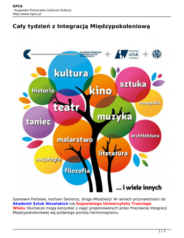 KPCK - Kujawsko Pomorskie Centrum Kultury http://www.kpck.pl Cały tydzień z Integracją Międzypokoleniową Szanowni Państwo, kochani Seniorzy, droga Młodzieży! W ramach przynależności do Akademii Sztuk Wszelakich lub Kujawskiego Uniwersytetu Trzeciego Wieku Słuchacze mogą korzystać z zajęć proponowanych przez Pracownię Integracji Międzypokoleniowej wg podanego poniżej harmonogramu: 1/3 KPCK - Kujawsko Pomorskie Centrum Kultury http://www.kpck.pl Darmowa pomoc prawna Poniedziałek 10.00-11.00 Sala nr 12 na parterze Karolina Muzyczka, tel. 52 585 15 01 Grupa Plastyczna Poniedziałek 11.00-16.00 Salon Hoffman (parter) Galeria Sztuki Ludowej i Nieprofesjonalnej tel. 52 585 15 01 Klub Gier Karcianych i Planszowych „Hetman” Poniedziałek 13.00-16.00 Antresola Salonu Hoffman Mateusz Grzębski, tel. 52 585 15 01 Klub Seniora „Złota Jesień” Poniedziałek 15.30-19.30 Restauracja „Tango”, ul. Wojska Polskiego 23 Teresa Macioszek, tel. 660 482 111 Kinowy Klub Dyskusyjny „KAKADU” Wtorek 10.00 Kawiarnia Cefe Kino, ul. Długa 32 Mateusz Grzębski, tel. 52 585 15 01 Zespół Wokalny „Tercja” Wtorek 11.00-13.00 Antresola Salonu Hoffman Teresa Macioszek, tel. 660 482 111 Grupa Tańca Nowoczesnego „noWa” Wtorek 11.00-13.00 Szkoła Tańca „Bohema”, ul. Dworcowa 51 Małgorzata Wójcik, tel. 52 585 15 01 Teatr Form Różnych „Nasza Klasa” Wtorek 13.00-15.00 Salon Hoffman (parter) Teresa Wądzińska-Szpecht, tel. 52 585 15 01 Chór Kameralny „Belcanto” 2/3 KPCK - Kujawsko Pomorskie Centrum Kultury http://www.kpck.pl Środa 10.20-12.20 Antresola Salonu Hoffman Łukasz Hermanowicz, tel. 52 585 15 01 Klub Pracy Twórczej „Pipsztyk” Środa 13.00-16.00 Salon Hoffman (parter) Dominika Darbownik, tel. 52 585 15 01 Klub Seniora „Uniwerek” Środa 15.00-17.00 (co 2 tygodnie) Ogród Zimowy lub Antresola Salonu Hoffman Irena Glinka, tel. 52 372 78 06 Zespół Wokalny „Niespodzianka” Czwartek 11.00-13.00 Antresola Salonu Hoffman Urszula Wargin, tel. 693 818 271 Grupa Tańca Nowoczesnego „noWa” Czwartek 11.00-13.00 Szkoła Tańca „Bohema”, ul. Dworcowa 51 Małgorzata Wójcik, tel. 52 585 15 01 Koło Polskiego Towarzystwa Turystyczno-Krajoznawczego nr 18 Piątek 10.00-12.00 Sala nr 12 na parterze lub Antresola Salonu Hoffman Alicja Porażka, tel. 52 361 80 62 Teresa Płaczkowska, tel. 52 582 69 80 Julian Waszak, [email protected], tel. 52 585 15 01 Zapraszamy do polubienia PIMu na Facebooku! 3/3 Powered by TCPDF (www.tcpdf.org)