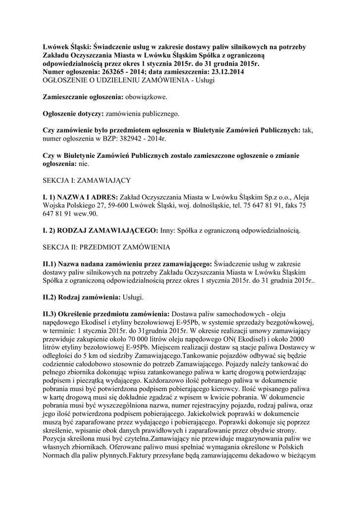 Lwówek Śląski: Świadczenie usług w zakresie dostawy paliw silnikowych na potrzeby Zakładu Oczyszczania Miasta w Lwówku Śląskim Spółka z ograniczoną odpowiedzialnością przez okres 1 stycznia 2015r. do 31 grudnia 2015r. Numer ogłoszenia: 263265 - 2014; data zamieszczenia: 23.12.2014 OGŁOSZENIE O UDZIELENIU ZAMÓWIENIA - Usługi Zamieszczanie ogłoszenia: obowiązkowe. Ogłoszenie dotyczy: zamówienia publicznego. Czy zamówienie było przedmiotem ogłoszenia w Biuletynie Zamówień Publicznych: tak, numer ogłoszenia w BZP: 382942 - 2014r. Czy w Biuletynie Zamówień Publicznych zostało zamieszczone ogłoszenie o zmianie ogłoszenia: nie. SEKCJA I: ZAMAWIAJĄCY I. 1) NAZWA I ADRES: Zakład Oczyszczania Miasta w Lwówku Śląskim Sp.z o.o., Aleja Wojska Polskiego 27, 59-600 Lwówek Śląski, woj. dolnośląskie, tel. 75 647 81 91, faks 75 647 81 91 wew.90. I. 2) RODZAJ ZAMAWIAJĄCEGO: Inny: Spółka z ograniczoną odpowiedzialnością. SEKCJA II: PRZEDMIOT ZAMÓWIENIA II.1) Nazwa nadana zamówieniu przez zamawiającego: Świadczenie usług w zakresie dostawy paliw silnikowych na potrzeby Zakładu Oczyszczania Miasta w Lwówku Śląskim Spółka z ograniczoną odpowiedzialnością przez okres 1 stycznia 2015r. do 31 grudnia 2015r.. II.2) Rodzaj zamówienia: Usługi. II.3) Określenie przedmiotu zamówienia: Dostawa paliw samochodowych - oleju napędowego Ekodisel i etyliny bezołowiowej E-95Pb, w systemie sprzedaży bezgotówkowej, w terminie: 1 stycznia 2015r. do 31grudnia 2015r. W okresie realizacji umowy zamawiający przewiduje zakupienie około 70 000 litrów oleju napędowego ON( Ekodisel) i około 2000 litrów etyliny bezołowiowej E-95Pb. Miejscem realizacji dostaw są stacje paliwa Dostawcy w odległości do 5 km od siedziby Zamawiającego.Tankowanie pojazdów odbywać się będzie codziennie całodobowo stosownie do potrzeb Zamawiającego. Pojazdy należy tankować do pełnego zbiornika dokonując wpisu zatankowanego paliwa w kartę drogową potwierdzając podpisem i pieczątką wydającego. Każdorazowo ilość pobranego paliwa w dokumencie pobrania musi być potwierdzona podpisem pobierającego kierowcy. Ilość wpisanego paliwa w kartę drogową musi się dokładnie zgadzać z wpisem w kwicie pobrania. W dokumencie pobrania musi być wyszczególniona nazwa, numer rejestracyjny pojazdu, rodzaj paliwa, oraz jego ilość potwierdzona podpisem pobierającego. Jakiekolwiek poprawki w dokumencie muszą być zaparafowane przez wydającego i pobierającego. Poprawki dokonuje się poprzez skreślenie, wpisanie obok danych prawidłowych i zaparafowanie przez obydwie strony. Pozycja skreślona musi być czytelna.Zamawiający nie przewiduje magazynowania paliw we własnych zbiornikach. Oferowane paliwo musi spełniać wymagania określone w Polskich Normach dla paliw płynnych.Faktury przesyłane będą zamawiającemu dekadowo w bieżącym miesiącu wraz z kopią dokumentów pobranych produktów.Dostawca przyjmuje 30 dniowy termin płatności faktury licząc od dnia otrzymania faktury przez Zamawiającego. Zamawiający przewiduje udzielenie zamówień uzupełniających, o których mowa w art. 67 ust. 1 pkt 6 Ustawy do wysokości 50% wartości zamówienia podstawowego i podlegających na powtórzeniu tego samego rodzaju zamówień.. II.4) Wspólny Słownik Zamówień (CPV): 09.13.41.00-8, 09.13.21.00-4. SEKCJA III: PROCEDURA III.1) TRYB UDZIELENIA ZAMÓWIENIA: Przetarg nieograniczony III.2) INFORMACJE ADMINISTRACYJNE Zamówienie dotyczy projektu/programu finansowanego ze środków Unii Europejskiej: nie SEKCJA IV: UDZIELENIE ZAMÓWIENIA IV.1) DATA UDZIELENIA ZAMÓWIENIA: 23.12.2014. IV.2) LICZBA OTRZYMANYCH OFERT: 2. IV.3) LICZBA ODRZUCONYCH OFERT: 1. IV.4) NAZWA I ADRES WYKONAWCY, KTÓREMU UDZIELONO ZAMÓWIENIA: Spółdzielnia STW, ul. Kościuszki 1, 59-700 Bolesławiec, kraj/woj. dolnośląskie. IV.5) Szacunkowa wartość zamówienia (bez VAT): 276714,00 PLN. IV.6) INFORMACJA O CENIE WYBRANEJ OFERTY ORAZ O OFERTACH Z NAJNIŻSZĄ I NAJWYŻSZĄ CENĄ Cena wybranej oferty: 342882,18 Oferta z najniższą ceną: 342882,18 / Oferta z najwyższą ceną: 342882,18 Waluta: PLN.