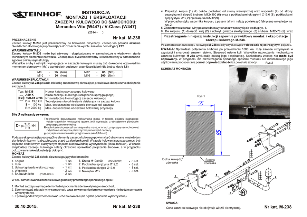 INSTRUKCJA MONTA¯U I EKSPLOATACJI ZACZEPU KULOWEGO DO SAMOCHODU: Mercedes Vito (W447) / V-Class (W447) (2014 - ®) Nr kat. M-238 PRZEZNACZENIE Zaczep kulowy M-238 jest przeznaczony do holowania przyczepy. Zaczep ten posiada aktualne Œwiadectwo Homologacji uprawniaj¹ce do oznaczenia wyrobu znakiem homologacji E20. WARUNKI MONTA¯U Zaczep kulowy M-238 mo¿e byæ u¿ywany i eksploatowany w samochodzie o w³aœciwym stanie technicznym elementów nadwozia. Zaczep musi byæ zamontowany i eksploatowany w samochodzie zgodnie z niniejsz¹ instrukcj¹. Wszystkie œruby i nakrêtki wystêpuj¹ce w zaczepie kulowym musz¹ byæ dokrêcone odpowiednim momentem obrotowym (Mo) o wartoœciach podanych w poni¿szej tabeli (dla œrub w klasie 8.8): 4. Przy³o¿yæ korpus (1) do boków pod³u¿nic od strony wewnêtrznej oraz wsporniki (4) od strony zewnêtrznej i skrêciæ œrubami M12x100 (6) wraz z podk³adkami okr¹g³ymi Ø13,0 (8), podk³adkami sprê¿ystymi Ø12,2 (7) i nakrêtkami M12 (9). W przypadku styku wspornika korpusu z pasem tylnym nale¿y powiêkszyæ fabryczne wyjêcie jak na rys. 2. 5. Zamontowaæ zderzak tylny po uprzednim wykonaniu w nim wyciêcia wed³ug rys. 1. 6. Do korpusu (1) dokrêciæ kulê (2) i uchwyt gniazda elektrycznego (3) œrubami M12x70 (5) wraz Przestrzeganie niniejszej instrukcji zapewnia prawid³owy monta¿ i eksploatacjê zaczepu kulowego M-238. Po zamontowaniu zaczepu kulowego M-238 nale¿y uzyskaæ wpis w dowodzie rejestracyjnym pojazdu. UWAGA: Sprawdzaæ po³¹czenia œrubowe po przejechaniu 1000 km. Kulê zawsze utrzymywaæ w czystoœci i smarowaæ smarem sta³ym. Stosowaæ os³onê kuli. Wszystkie uszkodzenia mechaniczne zaczepu kulowego M-238 wykluczaj¹ dalsz¹ jego eksploatacjê. Uszkodzony zaczep nie mo¿e byæ naprawiany. W przypadku nie przestrzegania opisanego sposobu monta¿u lub niew³aœciwego jego u¿ytkowania producent nie ponosi odpowiedzialnoœci za powsta³e szkody. Rys.2 SCHEMAT MONTA¯U: M8 25 (Nm) M12 85 (Nm) M10 50 (Nm) M16 - 200 (Nm) WARUNKI EKSPLOATACJI Zaczep kulowy M-238 posiada tabliczkê znamionow¹ okreœlaj¹c¹ prawid³owe i bezpieczne obci¹¿enie zaczepu, tj. : Typ: M-238 A50-X E20 55R-01 4396 D = 13,8 kN S = 100 kg R = 2500 kg Numer katalogowy zaczepu kulowego Klasa zaczepu kulowego (urz¹dzenia sprzêgaj¹cego) Nr œwiadectwa Homologacji zaczepu kulowego Teoretyczna si³a odniesienia dzia³aj¹ca na zaczep kulowy Max. dopuszczalne obci¹¿enie pionowe kuli zaczepu Max. dopuszczalne obci¹¿enie holowanej przyczepy Rys.1 55 Si³ê D wylicza siê ze wzoru: Podczas eksploatacji poszczególne elementy zaczepu kulowego powinny byæ utrzymane w nale¿ytym stanie technicznym i zabezpieczone przed dzia³aniem korozji. W czasie holowania przyczepa musi byæ z³¹czona dodatkowym elastycznym z³¹czem o odpowiedniej wytrzyma³oœci (linka, ³añcuch). W czasie eksploatacji zaczepu kulowego nale¿y okresowo sprawdzaæ po³¹czenia œrubowe, a w przypadku poluzowania nakrêtek nale¿y je dokrêciæ. MONTA¯ Zaczep kulowy M-238 sk³ada siê z nastêpuj¹cych elementów: - 1 szt. 6. Œruba M12x100 (PN/M-82101) 1. Korpus - 6 szt. - 1 szt. 2. Kula 7. Podk³adka sprê¿ysta Ø12,2 - 8 szt. - 1 szt. 3. Uchwyt gniazda elektrycznego - 8 szt. 8. Podk³adka okr¹g³a Ø13,0 - 2 szt. 4. Wspornik - 8 szt. 9. Nakrêtka M12 - 2 szt. 5. Œruba M12x70 (PN/M-82101) 9 7 8 5 Dolna krawêdŸ zderzaka 4 Œrodek zderzaka 5 8 7 9 1 W celu zamontowania zaczepu kulowego nale¿y przestrzegaæ poni¿szego opisu: 1. Monta¿ zaczepu wymaga demonta¿u i podcinania zderzaka tylnego samochodu. 2. Zdemontowaæ zderzak tylny samochodu wraz ze wzmocnieniem (wzmocnienie nie bêdzie ponownie wykorzystane). 3. Z prawej pod³u¿nicy zdemontowaæ ucho holownicze (nie bêdzie ponownie wykorzystane). 6 8 7 9 4 85 D= gx TxR kN T+R T-technicznie dopuszczalna maksymalna masa, w tonach, pojazdu ci¹gn¹cego (tak¿e ci¹gników holuj¹cych) ³¹cznie, jeœli wystêpuje, z obci¹¿eniem pionowym przyczepy z osiê centraln¹. R-technicznie dopuszczalna maksymalna masa, w tonach, przyczepy samochodowej z dyszlem ruchomym w p³aszczyŸnie pionowej lub naczepy. g- przyspieszenie ziemskie (przyjmowane jako 9,81 m/s2) 6 8 7 9 2 3 UWAGA: 30.10.2015. Nr kat. M-238 Cena zaczepu kulowego nie obejmuje wi¹zki elektrycznej. Nr kat. M-238 TOW BAR FOR Mercedes Vito (W447) / V-Class (W447) (2014 - ®) FITTING AND OPERATION MANUAL 4. Apply the towbar mainframe (1) to the inner sides of the stringers and supports (4) to the outer sides and screw using bolts M12x100 (6) with a round washers Ø13,0 (8), spring washers Ø12,2 (7) and nuts M12 (9). In case of contact of cantilever's mainframe with back belt of the car, it is necessary to make fabric incision bigger according to the fig. 2. 5. Install the rear bumper after making cutouts acccording in the fig.1. 6. Attach the tow ball (2) and electrical socket plate (3) to the towbar mainframe (1) using bolts M12x70 ( 5) with round washers Ø13,0 (8), spring washers Ø12,2 (7) and nuts M12 (9). Cat. No.M-238 Obeying this instruction assures correct montage and the M-238 tow bar operating. DESTINATION Tow bar M-238 is designed for towing a trailer. This ball hook has a current certification of approval authorizing the product with E20 certification sign. FITTING CONDITIONS Tow bar M-238 can be used and operated in a car with proper technical conditions of body elements. Those parts cannot be mechanically damaged . The ball hook has to be installed and operated in a car according to this instruction . All bolts and nuts in ball hook have to be screwed down with proper torque (Mo) . Torque values are given below : M8 M10 - 25 (Nm) 50 (Nm) M12 M16 - After assembling of the tow bar M-238 you have to get entry in cars registration book. CAUTION : Check if all bolts and nuts are correctly tightened after 1000km. Keep tow ball clean, grease and cased. All mechanical damages of tow bar excludes its further exploitation . Damaged ball hook cannot be repaired. In case of