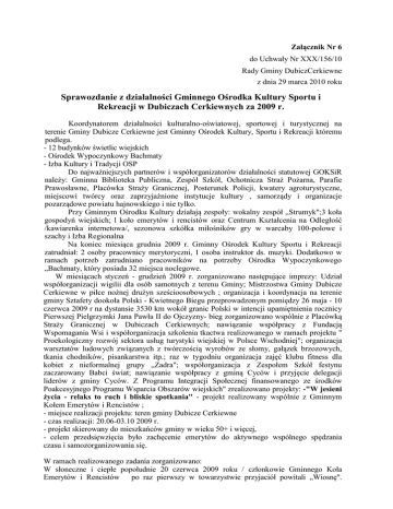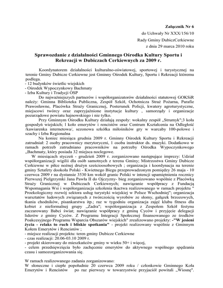 Załącznik Nr 6 do Uchwały Nr XXX/156/10 Rady Gminy DubiczCerkiewne z dnia 29 marca 2010 roku Sprawozdanie z działalności Gminnego Ośrodka Kultury Sportu i Rekreacji w Dubiczach Cerkiewnych za 2009 r. Koordynatorem działalności kulturalno-oświatowej, sportowej i turystycznej na terenie Gminy Dubicze Cerkiewne jest Gminny Ośrodek Kultury, Sportu i Rekreacji któremu podlega. - 12 budynków świetlic wiejskich - Ośrodek Wypoczynkowy Bachmaty - Izba Kultury i Tradycji OSP Do najważniejszych partnerów i współorganizatorów działalności statutowej GOKSiR należy: Gminna Biblioteka Publiczna, Zespół Szkół, Ochotnicza Straż Pożarna, Parafie Prawosławne, Placówka Straży Granicznej, Posterunek Policji, kwatery agroturystyczne, miejscowi twórcy oraz zaprzyjaźnione instytucje kultury , samorządy i organizacje pozarządowe powiatu hajnowskiego i nie tylko. Przy Gminnym Ośrodku Kultury działają zespoły: wokalny zespół „Strumyk";3 koła gospodyń wiejskich; l koło emerytów i rencistów oraz Centrum Kształcenia na Odległość /kawiarenka internetowa/, sezonowa szkółka miłośników gry w warcaby 100-polowe i szachy i Izba Regionalna Na koniec miesiąca grudnia 2009 r. Gminny Ośrodek Kultury Sportu i Rekreacji zatrudniał: 2 osoby pracownicy merytoryczni, 1 osoba instruktor ds. muzyki. Dodatkowo w ramach potrzeb zatrudniano pracowników na potrzeby Ośrodka Wypoczynkowego „Bachmaty, który posiada 32 miejsca noclegowe. W miesiącach styczeń - grudzień 2009 r. zorganizowano następujące imprezy: Udział współorganizacji wigilii dla osób samotnych z terenu Gminy; Mistrzostwa Gminy Dubicze Cerkiewne w piłce nożnej drużyn sześcioosobowych ; organizacja i koordynacja na terenie gminy Sztafety dookoła Polski - Kwietnego Biegu przeprowadzonym pomiędzy 26 maja - 10 czerwca 2009 r na dystansie 3530 km wokół granic Polski w intencji upamiętnienia rocznicy Pierwszej Pielgrzymki Jana Pawła II do Ojczyzny- bieg zorganizowano wspólnie z Placówką Straży Granicznej w Dubiczach Cerkiewnych; nawiązanie współpracy z Fundacją Wspomagania Wsi i współorganizacja szkolenia tkactwa realizowanego w ramach projektu " Proekologiczny rozwój sektora usług turystyki wiejskiej w Polsce Wschodniej"; organizacja warsztatów ludowych związanych z twórczością wyrobów ze słomy, gałązek brzozowych, tkania chodników, pisankarstwa itp.; raz w tygodniu organizacja zajęć klubu fitness dla kobiet z nieformalnej grupy „Zadra"; współorganizacja z Zespołem Szkół festynu zaczarowany Babci świat; nawiązanie współpracy z gminą Cyców i przyjęcie delegacji liderów z gminy Cyców. Z Programu Integracji Społecznej finansowanego ze środków Poakcesyjnego Programu Wsparcia Obszarów wiejskich" zrealizowano projekty: -"W jesieni życia - relaks to ruch i bliskie spotkania" - projekt realizowany wspólnie z Gminnym Kołem Emerytów i Rencistów ; - miejsce realizacji projektu: teren gminy Dubicze Cerkiewne - czas realizacji: 20.06-03.10 2009 r. - projekt skierowany do mieszkańców gminy w wieku 50+ i więcej, - celem przedsięwzięcia było zachęcenie emerytów do aktywnego wspólnego spędzania czasu i samozorganizowania się. W ramach realizowanego zadania zorganizowano: W słoneczne i ciepłe popołudnie 20 czerwca 2009 roku / członkowie Gminnego Koła Emerytów i Rencistów po raz pierwszy w towarzystwie przyjaciół powitali „Wiosnę". Miejscem czerwcowego spotkania był Ośrodek Wypoczynkowy Bachmaty, który bez problemu na miejscu ogniskowym pomieścił wszystkich uczestników imprezy miejscu do wspólnego biesiadowania przygotowano ognisko, przy którym seniorzy wspólnymi śpiewami przywołali wiosenną pannę. Piękna wiosenna pogoda, wspaniałe tereny i dobre humory sprawiły, że bawiono się wspaniale do późnego wieczoru. -12 wrzesień 2009 r. członkowie klubu seniora wyjechali na wycieczkę do Białowieży – hasło wycieczki „Poznaj swój kraj, poznaj swoje okolice". Okazało się że większość członków koła nie zna swoich stron. Sprawdziło się przysłowie „Cudze chwalicie a swego nie znacie". Tym razem koło spędziło dzień w przepięknym kompleksie parkowo - pałacowym w Białowieży . Zwiedzono m.in. Muzeum Przyrodniczo-Leśne z wieżą widokową, Szlak Dębów Królewskich, Rezerwat Pokazowy Zwierząt, Cerkiew p. w. Św. Mikołaj a Cudotwórcy. Nie zapomniano również o restauracji Carskiej. Przewodnikiem wycieczki była emerytowana nauczycielka ,mieszkanka Białowieży. Piękna pogoda, wspaniałe tereny i dobre humory sprawiły ze seniorzy z niechęcią wyjeżdżali z Białowieży.- 3 października 2009 r. uroczyście obchodzono Dzień Seniora. Emeryci i Renciści zaproszeni goście spotkali się w świetlicy wiejskiej w Wojnówce, by spędzić ze sobą parę miłych godzin. Wszystkich zebranych powitał Wójt Gminy Anatol Pawłowski , prezes Związku Emerytów i Rencistów Mikołaj Czykwin, koordynator Programu Integracji Społecznej finansowanego z Poakcesyjnego Programu Wsparcia Obszarów Wiejskich Pani Maria Pietryczyk. Zaproszeni goście złożyli seniorom najlepsze życzenia długich lat w zdrowiu, szczęściu i radości. Na przyjęciu organizatorzy zadbali o kawę , herbatę, napoje i smaczne ciasta. We własnym zakresie przygotowano zimne zakąski. Wszystko było pięknie udekorowane i bardzo smaczne. Zadbano również o sprawność ruchową uczestników balu. W takt melodii ludowych granych na koncercie przez kapelę z Dubin same nogi rwały się do tańca. W jednej sekundzie sala koncertowa zamieniła się w salę taneczną. Trudno było się dopatrzyć oznak upływu czasu. Zatańczyć z wdziękiem polkę czy oberka to o wiele trudniejsza sztuka niż tańce w dyskotece. Sala koncertowa wyglądała jak dobrze prowadzony gabinet rehabilitacyjny. Tyle na niej było rehabilitantów, że niejedna młoda osoba mogłaby pozazdrościć seniorom wigoru i umiejętności tańca. Ruch, śpiew i taniec -to najlepsza te