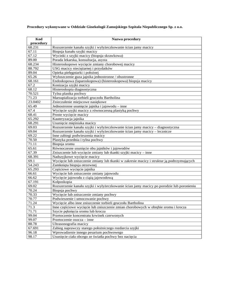 Procedury wykonywane w Oddziale Ginekologii Zamojskiego Szpitala Niepublicznego Sp. z o.o. Kod procedury 68.231 67.11 67.12 89.00 68.234 88.792 89.04 65.26 68.161 67.2 68.12 70.521 71.23 23.0402 65.49 67.4 68.41 65.292 68.291 69.03 69.04 69.22 70.50 71.11 65.61 67.39 68.391 69.1 54.243 65.293 66.61 66.62 67.191 69.02 70.24 70.33 70.77 71.24 71.3 71.71 99.04 99.07 88.78 67.691 96.18 98.17 Nazwa procedury Rozszerzenie kanału szyjki i wyłyżeczkowanie ścian jamy macicy Biopsja kanału szyjki macicy Wycinki z szyjki macicy (biopsja skrawkowa) Porada lekarska, konsultacja, asysta Histeroskopowe wycięcie zmiany chorobowej macicy USG macicy nieciężarnej i przydatków Opieka pielęgniarki i położnej Wyłuszczenie guza jajnika jednostronne / obustronne Endoskopowa (laparoskopowa) (histeroskopowa) biopsja macicy Konizacja szyjki macicy Histeroskopia diagnostyczna Tylna plastka pochwy Marsupializacja torbieli gruczołu Bartholina Znieczulenie miejscowe nasiękowe Jednostronne usunięcie jajnika i jajowodu – inne Wycięcie szyjki macicy z równoczesną plastyką pochwy Proste wycięcie macicy Kauteryzacja jajnika Usunięcie mięśniaka macicy Rozszerzenie kanału szyjki i wyłyżeczkowanie ścian jamy macicy – diagnostyczna Rozszerzenie kanału szyjki i wyłyżeczkowanie ścian jamy macicy – lecznicze Inne zabiegi podwieszenia macicy Plastyka przednia i tylna pochwy Biopsja sromu Równoczesne usunięcie obu jajników i jajowodów Zniszczenie lub wycięcie zmiany lub tkanki szyjki macicy – inne Nadszyjkowe wycięcie macicy Wycięcie lub zniszczenie zmiany lub tkanki w zakresie macicy i struktur ją podtrzymujących Zamknięta biopsja otrzewnej Częściowe wycięcie jajnika Wycięcie lub zniszczenie zmiany jajowodu Wycięcie jajowodu z ciążą jajowodową Kolposkopia Rozszerzenie kanału szyjki i wyłyżeczkowanie ścian jamy macicy po porodzie lub poronieniu Biopsja pochwy Wycięcie lub zniszczenie zmiany pochwy Podwieszenie i umocowanie pochwy Wycięcie albo inne zniszczenie torbieli gruczołu Bartholina Inne częściowe wycięcie lub zniszczenie zmian chorobowych w obrębie sromu i krocza Szycie pęknięcia sromu lub krocza Przetoczenie koncentratu krwinek czerwonych Przetoczenie osocza – inne Ultrasonografia macicy Zabieg naprawczy starego położniczego rozdarcia szyjki Wprowadzenie innego pesarium pochwowego Usunięcie ciała obcego ze światła pochwy bez nacięcia