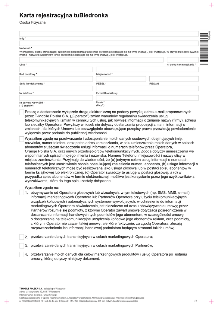 Karta rejestracyjna tuBiedronka TMPL001 Osoba Fizyczna Imię * Nazwisko * W przypadku osoby prowadzącej działalność gospodarczą także inne określenia składające się na firmę (nazwę), jeśli występują. W przypadku spółki cywilnej imiona i nazwiska wspólników i inne określenia składające się na firmę (nazwę), jeśli występują. Ulica * nr domu / nr mieszkania * Kod pocztowy * Miejscowość * Seria i nr dokumentu * PESEL * Nr telefonu * E-mail Kontaktowy Nr seryjny Karty SIM * (19 znaków) Hasło * (8 cyfr) REGON Proszę o dostarczanie wyłącznie drogą elektroniczną na podany powyżej adres e-mail proponowanych przez T-Mobile Polska S.A. („Operator”) zmian warunków regulaminu świadczenia usług telekomunikacyjnych i zmian w cenniku tych usług, jak również informacji o zmianie nazwy (firmy), adresu lub siedziby Operatora. Powyższy wniosek nie dotyczy dostarczania propozycji zmian i informacji o zmianach, dla których Umowa lub bezwzględnie obowiązujące przepisy prawa przewidują powiadomienie wyłącznie przez podanie do publicznej wiadomości. Wyraziłem zgodę na przetwarzanie i udostępnianie moich danych osobowych obejmujących imię, nazwisko, numer telefonu oraz pełen adres zamieszkania, w celu umieszczenia moich danych w spisach abonentów służącym świadczeniu usługi informacji o numerach telefonów przez Operatora, Orange Polska S.A. oraz innych przedsiębiorców telekomunikacyjnych. Zgoda dotyczy umieszczenia we wspomnianych spisach mojego imienia i nazwiska, Numeru Telefonu, miejscowości i nazwy ulicy w miejscu zamieszkania. Przyjmuję do wiadomości, że (a) jedynym celem usług informacji o numerach telefonicznych jest umożliwienie osobie poszukującej znalezienia numeru abonenta, (b) usługa informacji o numerach telefonicznych może być realizowana jako usługa głosowa lub w postaci spisu abonentów w formie książkowej lub elektronicznej, (c) Operator świadczy tę usługę w postaci głosowej, a (d) w przypadku spisu abonentów w formie elektronicznej, możliwe jest korzystanie przez jego użytkowników z wyszukiwarek, które do tego spisu zostały dołączone. Wyraziłem zgodę na: 1. otrzymywanie od Operatora głosowych lub wizualnych, w tym tekstowych (np. SMS, MMS, e-mali), informacji marketingowych Operatora lub Partnerów Operatora przy użyciu telekomunikacyjnych urządzeń końcowych i automatycznych systemów wywołujących; w odniesieniu do informacji marketingowych Operatora oświadczenie jest niezależne od czasu obowiązywania umowy; przez Partnerów rozumie się podmioty, z którymi Operator zawarł umowę dotyczącą pośredniczenia w dostarczaniu informacji handlowych tych podmiotów jego abonentom, w szczególności umowę o dostarczanie na telekomunikacyjne urządzenia końcowe jego abonentów reklam, oraz podmioty, z którymi Operator nie zawarł takiej umowy, ale które faktycznie, za zgodą Operatora, zlecają rozpowszechnienie ich informacji handlowej podmiotom będącym stronami takich umów; 2. przetwarzanie danych transmisyjnych w celach marketingowych Operatora; 3. przetwarzanie danych transmisyjnych w celach marketingowych Partnerów; 4. przetwarzanie moich danych dla celów marketingowych produktów i usług Operatora po ustaniu umowy, której dotyczy niniejszy dokument. T-MOBILE POLSKA S.A. z siedzibą w Warszawie Adres: ul. Marynarska 12, 02-674 Warszawa Internet: www.t-mobile.pl / www.heyah.pl Spółka zarejestrowana w Sądzie Rejonowym dla m.st. Warszawy w Warszawie. XIII Wydział Gospodarczy Krajowego Rejestru Sądowego nr KRS 0000391193 | NIP 526-10-40-567 | Regon 011417295 | Kapitał zakładowy 471 mln złotych, kapitał wpłacony w całości. 1/2 Akceptuję warunki świadczenia usług telekomunikacyjnych określone w "Regulaminie Świadczenia Usług Telekomunikacyjnych Przedpłaconych w Usłudze tuBieronka". Przyjąłem do wiadomości, że: Operator (T-Mobile Polska S.A. z siedzibą w Warszawie, ul. Marynarska 12, 02-674 Warszawa) jest administratorem danych osobowych Użytkowników w rozumieniu przepisów o ochronie danych osobowych. Operator samodzielnie, lub poprzez podmioty przez niego upoważnione przetwarza dane osobowe Użytkownika, związane ze świadczonymi Usługami Telekomunikacyjnymi. Każda dana Użytkownika z chwilą rejestracji staje się daną osobową. Dane te przetwarzane są w celach związanych ze sprzedażą produktów i świadczeniem Usług Telekomunikacyjnych, w celach związanych z windykacją należności, w celach zapewnienia realizacji przez uprawnione organy zadań i obowiązków na rzecz obronności, bezpieczeństwa państwa oraz bezpieczeństwa i porządku publicznego, dochodzenia roszczeń wynikających z Umowy oraz realizacji obowiązków wynikających z prowadzenia działalności gospodarczej przez Operatora jak również, w przypadku gdy przetwarzanie to nie narusza praw i wolności osoby, której dane dotyczą, w celu marketingu własnych produktów i usług. W zakresie określonym w przepisach prawa dane osobowe mogą być przekazywane i udostępniane uprawnionym osobom, organom lub sądom. Użytkownikowi przysługuje prawo dostępu do treści dotyczących go danych osobowych i ich poprawiania. Podanie Operatorowi danych osobowych jest dobrowolne. Oświadczam, że wskazane powyżej dane są aktualne i prawdziwe. Jednocześnie przyjmuję do wiadomości, że jedynie poprawnie i kompletnie wypełniona karta jest podstawą uruchomienia procesu rejestracji Użytkownika. miejscowość, data * podpis Użytkownika * Dokument, na podstawie którego potwierdzono powyższe dane (wypełnia Operator) dowód osobisty paszport prawo jazdy potwierdzenie woli i danych osoby niepełnoletniej przez jej przedstawiciela ustawowego Uwaga! Wypełnioną czytelnie kartę należy dostarczyć do Punktu Sprzedaży T-Mobile lub wysłać na adres: T-Mobile Polska S.A., ul. Marynarska 12, 02-674 Warszawa. Nieprawidłowe wypełnienie formularza uniemożliwi zarejestrowanie danych Użyt