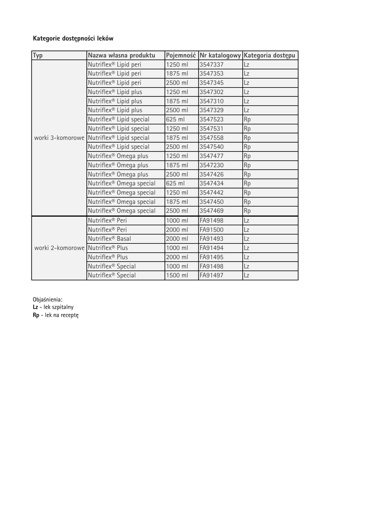 Kategorie dostępności leków Typ Nazwa własna produktu Nutriflex® Lipid peri Nutriflex® Lipid peri Nutriflex® Lipid peri Nutriflex® Lipid plus Nutriflex® Lipid plus Nutriflex® Lipid plus Nutriflex® Lipid special Nutriflex® Lipid special worki 3-komorowe Nutriflex® Lipid special Nutriflex® Lipid special Nutriflex® Omega plus Nutriflex® Omega plus Nutriflex® Omega plus Nutriflex® Omega special Nutriflex® Omega special Nutriflex® Omega special Nutriflex® Omega special Nutriflex® Peri Nutriflex® Peri Nutriflex® Basal worki 2-komorowe Nutriflex® Plus Nutriflex® Plus Nutriflex® Special Nutriflex® Special Objaśnienia: Lz - lek szpitalny Rp - lek na receptę Pojemność 1250 ml 1875 ml 2500 ml 1250 ml 1875 ml 2500 ml 625 ml 1250 ml 1875 ml 2500 ml 1250 ml 1875 ml 2500 ml 625 ml 1250 ml 1875 ml 2500 ml 1000 ml 2000 ml 2000 ml 1000 ml 2000 ml 1000 ml 1500 ml Nr katalogowy 3547337 3547353 3547345 3547302 3547310 3547329 3547523 3547531 3547558 3547540 3547477 3547230 3547426 3547434 3547442 3547450 3547469 FA91498 FA91500 FA91493 FA91494 FA91495 FA91498 FA91497 Kategoria dostępu Lz Lz Lz Lz Lz Lz Rp Rp Rp Rp Rp Rp Rp Rp Rp Rp Rp Lz Lz Lz Lz Lz Lz Lz