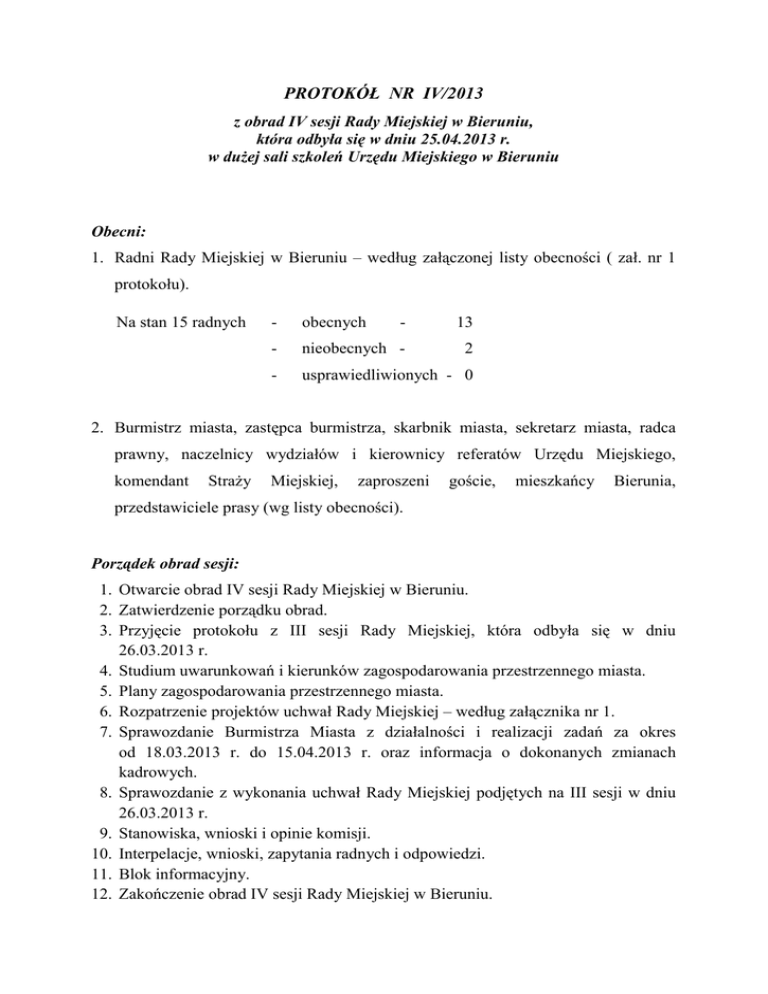 PROTOKÓŁ NR IV/2013 z obrad IV sesji Rady Miejskiej w Bieruniu, która odbyła się w dniu 25.04.2013 r. w dużej sali szkoleń Urzędu Miejskiego w Bieruniu Obecni: 1. Radni Rady Miejskiej w Bieruniu – według załączonej listy obecności ( zał. nr 1 protokołu). Na stan 15 radnych - obecnych - 13 - nieobecnych - 2 - usprawiedliwionych - 0 2. Burmistrz miasta, zastępca burmistrza, skarbnik miasta, sekretarz miasta, radca prawny, naczelnicy wydziałów i kierownicy referatów Urzędu Miejskiego, komendant Straży Miejskiej, zaproszeni goście, mieszkańcy Bierunia, przedstawiciele prasy (wg listy obecności). Porządek obrad sesji: 1. Otwarcie obrad IV sesji Rady Miejskiej w Bieruniu. 2. Zatwierdzenie porządku obrad. 3. Przyjęcie protokołu z III sesji Rady Miejskiej, która odbyła się w dniu 26.03.2013 r. 4. Studium uwarunkowań i kierunków zagospodarowania przestrzennego miasta. 5. Plany zagospodarowania przestrzennego miasta. 6. Rozpatrzenie projektów uchwał Rady Miejskiej – według załącznika nr 1. 7. Sprawozdanie Burmistrza Miasta z działalności i realizacji zadań za okres od 18.03.2013 r. do 15.04.2013 r. oraz informacja o dokonanych zmianach kadrowych. 8. Sprawozdanie z wykonania uchwał Rady Miejskiej podjętych na III sesji w dniu 26.03.2013 r. 9. Stanowiska, wnioski i opinie komisji. 10. Interpelacje, wnioski, zapytania radnych i odpowiedzi. 11. Blok informacyjny. 12. Zakończenie obrad IV sesji Rady Miejskiej w Bieruniu. -2- Ad. 1 Przewodniczący rady Przemysław Major, działając na podstawie art. 20 ust. 1 ustawy o samorządzie gminnym z dnia 8 marca 1990 r., otworzył obrady IV sesji Rady Miejskiej w Bieruniu. Na podstawie § 9 ust. 1 Regulaminu obrad Rady Miejskiej stwierdził, że liczba obecnych na sali radnych pozwala na prawomocne obradowanie i podejmowanie uchwał. Następnie przywitał radnych Bierunia, burmistrza miasta Bernarda Pustelnika, zastępcę burmistrza Leszka Kryczka, projektantów studium, sekretarza miasta Jerzego Stoka, radców prawnych Martę Kotania i Adama Zuga, naczelników wydziałów: GPN Krystynę Trzońską, FN Sylwię Krenzel, GK Jana Stockiego, kierownika referatu OŚRL Grzegorza Plewnioka, komendanta Straży Miejskiej Mariana Walę, oraz mieszkańców Bierunia i przedstawicieli prasy, którzy przybyli na sesję. Ad. 2. Przewodniczący rady odnosząc się do porządku obrad IV sesji Rady Miejskiej w Bieruniu, który radni otrzymali wraz z materiałami i projektami uchwał zapytał, czy są uwagi oraz wnioski do tego porządku. Burmistrz wniósł o wprowadzenie do porządku obrad projektów uchwał: - w sprawie zmiany Wieloletniej Prognozy Finansowej wraz z prognozą kwoty długu i spłat zobowiązań Miasta Bierunia na lata 2013-2028, - w sprawie zmian do uchwały nr III/5/2013 Rady Miejskiej w Bieruniu z dnia 26 marca 2013 r. w sprawie ustalenia wzoru deklaracji o wysokości opłaty za gospodarowanie odpadami komunalnymi, składanej przez właścicieli nieruchomości położonych na terenie gminy Bieruń, oraz zmianę załącznika do uchwały w sprawie zmian w uchwale nr XVII.2.2012 Rady Miejskiej w Bieruniu z dnia 20 grudnia 2012 r. w sprawie budżetu miasta Bierunia na 2013 rok. Uzasadnił potrzebę proponowanych zmian. -3- Przewodniczący rady zaproponował, aby w bloku informacyjnym przyjąć „Sprawozdanie z realizacji współpracy gminy Bieruń z organizacjami pozarządowymi za 2012 rok”. Przewodniczący rady, wobec braku dalszych uwag, poddał kolejno pod głosowanie: - wniosek burmistrza o poszerzenie porządku obrad o projekt uchwały dotyczącej Wieloletniej Prognozy Finansowej i zmianę załącznika w uchwale dotyczącej zmian w budżecie. Za przyjęciem wniosku oddano: 13 głosów za - wniosek burmistrza o wprowadzenie do porządku obrad uchwały dotyczącej zmian deklaracji w zakresie odpadów komunalnych Za przyjęciem wniosku oddano: 13 głosów za - wprowadzenie do porządku obrad „Sprawozdania z realizacji współpracy gminy Bieruń z organizacjami pozarządowymi za 2012 rok” Za przyjęciem wniosku oddano: 13 głosów za Przewodniczący rady poddał pod głosowanie porządek obrad IV sesji Rady Miejskiej z przegłosowanymi zmianami. W wyniku głosowania, w którym udział brało 13 radnych oddano: 13głosów za Porządek obrad ze zmianami został przyjęty jednogłośnie. Ad. 3. Przewodniczący rady poddał pod głosowanie treść Protokołu Nr III/2013 z sesji Rady Miejskiej, która odbyła się w dniu 26.03.2013 r. W wyniku głosowania, za przyjęciem protokołu, w którym udział brało 13 radnych oddano: -4- 13 głosów za Protokół Nr III/2013 został przyjęty jednogłośnie. Ad. 4. Przewodniczący rady poinformował, że po prawie 4 latach finalizowana jest praca nad studium. Radni otrzymali projekt uchwały w sprawie uchwalenia aktualizacji studium uwarunkowań i kierunków zagospodarowania przestrzennego miasta Bierunia w wersji elektronicznej i papierowej. Projekt tej uchwały oraz uwagi mieszkańców, które w trakcie procedury wpływały były omawiane na poszczególnych posiedzeniach Komisji Gospodarki Miejskiej. Zgodnie z ustawą z dnia 27.03.2003 r. o planowaniu i zagospodarowaniu przestrzennym burmistrz przedstawia Radzie Miejskiej do uchwalenia studium wraz z listą nieuwzględnionych uwag. Zwrócił się do radcy prawnego o opinię i stanowisko w zakresie głosowania nad rozstrzygnięciami ujętymi w załączniku nr 4 do projektu uchwały, a w szczególności nad wnioskami mieszkańców, które wpływały, jako wnioski dotyczące jednego terenu i obszaru. Czy należy głosować każdy indywidualnie zgodnie ze stanowiskiem prawnym, czy też można uwagi jednorodne poddać pod głosowanie w jednym bloku. Radca prawny zwrócił uwagę, że temat ten wywołuje rozbieżności, różne są stanowiska, ale przeważające stanowisko jest takie, że jeżeli uwagi są tożsame prawo dopuszcza głosowanie blokiem nad tymi uwagami. Z naszej strony konsultowaliśmy takie rozstrzygnięcie. S