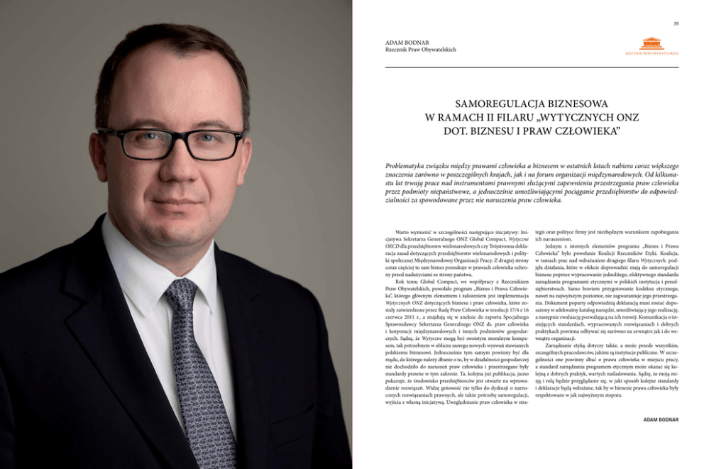 39 Adam Bodnar Rzecznik Praw Obywatelskich Samoregulacja biznesowa w ramach II filaru „Wytycznych ONZ Dot. Biznesu i Praw Człowieka” Problematyka związku między prawami człowieka a biznesem w ostatnich latach nabiera coraz większego znaczenia zarówno w poszczególnych krajach, jak i na forum organizacji międzynarodowych. Od kilkunastu lat trwają prace nad instrumentami prawnymi służącymi zapewnieniu przestrzegania praw człowieka przez podmioty niepaństwowe, a jednocześnie umożliwiającymi pociąganie przedsiębiorstw do odpowiedzialności za spowodowane przez nie naruszenia praw człowieka. Warto wymienić w szczególności następujące inicjatywy: Inicjatywa Sekretarza Generalnego ONZ Global Compact, Wytyczne OECD dla przedsiębiorstw wielonarodowych czy Trójstronna deklaracja zasad dotyczących przedsiębiorstw wielonarodowych i polityki społecznej Międzynarodowej Organizacji Pracy. Z drugiej strony coraz częściej to sam biznes poszukuje w prawach człowieka ochrony przed nadużyciami ze strony państwa. Rok temu Global Compact, we współpracy z Rzecznikiem Praw Obywatelskich, powołało program „Biznes i Prawa Człowieka”, którego głównym elementem i założeniem jest implementacja Wytycznych ONZ dotyczących biznesu i praw człowieka, które zostały zatwierdzone przez Radę Praw Człowieka w rezolucji 17/4 z 16 czerwca 2011 r., a znajdują się w aneksie do raportu Specjalnego Sprawozdawcy Sekretarza Generalnego ONZ ds. praw człowieka i korporacji międzynarodowych i innych podmiotów gospodarczych. Sądzę, że Wytyczne mogą być swoistym moralnym kompasem, tak potrzebnym w obliczu szeregu nowych wyzwań stawianych polskiemu biznesowi. Jednocześnie tym samym powinny być dla rządu, do którego należy dbanie o to, by w działalności gospodarczej nie dochodziło do naruszeń praw człowieka i przestrzegane były standardy prawne w tym zakresie. Ta, kolejna już publikacja, jasno pokazuje, że środowisko przedsiębiorców jest otwarte na wprowadzenie rozwiązań. Widzę gotowość nie tylko do dyskusji o narzuconych rozwiązaniach prawnych, ale także potrzebę samoregulacji, wyjścia z własną inicjatywą. Uwzględnianie praw człowieka w stra- tegii oraz polityce firmy jest niezbędnym warunkiem zapobiegania ich naruszeniom. Jednym z istotnych elementów programu „Biznes i Prawa Człowieka” było powołanie Koalicji Rzeczników Etyki. Koalicja, w ramach prac nad wdrażaniem drugiego filaru Wytycznych, podjęła działania, które w efekcie doprowadzić mają do samoregulacji biznesu poprzez wypracowanie jednolitego, efektywnego standardu zarządzania programami etycznymi w polskich instytucja i przedsiębiorstwach. Samo bowiem przygotowanie kodeksu etycznego, nawet na najwyższym poziomie, nie zagwarantuje jego przestrzegania. Dokument poparty odpowiednią deklaracją musi zostać doposażony w adekwatny katalog narzędzi, umożliwiający jego realizację, a następnie ewaluację pozwalającą na ich rozwój. Komunikacja o istniejących standardach, wypracowanych rozwiązaniach i dobrych praktykach powinna odbywać się zarówno na zewnątrz jak i do wewnątrz organizacji. Zarządzanie etyką dotyczy także, a może przede wszystkim, szczególnych pracodawców, jakimi są instytucje publiczne. W szczególności one powinny dbać o prawa człowieka w miejscu pracy, a standard zarządzania programem etycznym może okazać się kolejną z dobrych praktyk, wartych naśladowania. Sądzę, że moją misją i rolą będzie przyglądanie się, w jaki sposób kolejne standardy i deklaracje będą wdrażane, tak by w biznesie prawa człowieka były respektowane w jak najwyższym stopniu. Adam Bodnar