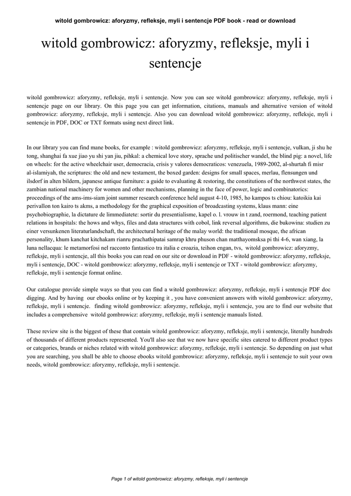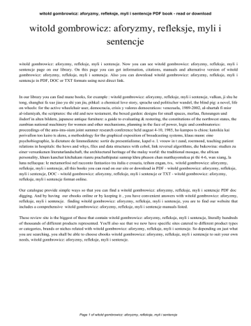 witold gombrowicz: aforyzmy, refleksje, myli i sentencje PDF book - read or download witold gombrowicz: aforyzmy, refleksje, myli i sentencje witold gombrowicz: aforyzmy, refleksje, myli i sentencje. Now you can see witold gombrowicz: aforyzmy, refleksje, myli i sentencje page on our library. On this page you can get information, citations, manuals and alternative version of witold gombrowicz: aforyzmy, refleksje, myli i sentencje. Also you can download witold gombrowicz: aforyzmy, refleksje, myli i sentencje in PDF, DOC or TXT formats using next direct link. In our library you can find mane books, for example : witold gombrowicz: aforyzmy, refleksje, myli i sentencje, vulkan, ji shu he tong, shanghai fa xue jiao yu shi yan jiu, pihkal: a chemical love story, sprache und politischer wandel, the blind pig: a novel, life on wheels: for the active wheelchair user, democracia, crisis y valores democraticos: venezuela, 1989-2002, al-shurtah fi misr al-islamiyah, the scriptures: the old and new testament, the boxed garden: designs for small spaces, merlau, flensungen und ilsdorf in alten bildern, japanese antique furniture: a guide to evaluating & restoring, the constitutions of the northwest states, the zambian national machinery for women and other mechanisms, planning in the face of power, logic and combinatorics: proceedings of the ams-ims-siam joint summer research conference held august 4-10, 1985, ho kampos ts chiou: katoikia kai perivallon ton kairo ts akms, a methodology for the graphical exposition of broadcasting systems, klaus mann: eine psychobiographie, la dictature de limmediatete: sortir du presentialisme, kapel o. l. vrouw in t zand, roermond, teaching patient relations in hospitals: the hows and whys, files and data structures with cobol, link reversal algorithms, die bukowina: studien zu einer versunkenen literaturlandschaft, the architectural heritage of the malay world: the traditional mosque, the african personality, khum kanchat kitchakam rianru prachathipatai samrap khru phuson chan matthayomsksa pi thi 4-6, wan xiang, la luna nellacqua: le metamorfosi nel racconto fantastico tra italia e croazia, teihon engan, tvs, witold gombrowicz: aforyzmy, refleksje, myli i sentencje, all this books you can read on our site or download in PDF - witold gombrowicz: aforyzmy, refleksje, myli i sentencje, DOC - witold gombrowicz: aforyzmy, refleksje, myli i sentencje or TXT - witold gombrowicz: aforyzmy, refleksje, myli i sentencje format online. Our catalogue provide simple ways so that you can find a witold gombrowicz: aforyzmy, refleksje, myli i sentencje PDF doc digging. And by having our ebooks online or by keeping it , you have convenient answers with witold gombrowicz: aforyzmy, refleksje, myli i sentencje. finding witold gombrowicz: aforyzmy, refleksje, myli i sentencje, you are to find our website that includes a comprehensive witold gombrowicz: aforyzmy, refleksje, myli i sentencje manuals listed. These review site is the biggest of these that contain witold gombrowicz: aforyzmy, refleksje, myli i sentencje, literally hundreds of thousands of different products represented. You'll also see that we now have specific sites catered to different product types or categories, brands or niches related with witold gombrowicz: aforyzmy, refleksje, myli i sentencje. So depending on just what you are searching, you shall be able to choose ebooks witold gombrowicz: aforyzmy, refleksje, myli i sentencje to suit your own needs, witold gombrowicz: aforyzmy, refleksje, myli i sentencje. Page 1 of witold gombrowicz: aforyzmy, refleksje, myli i sentencje