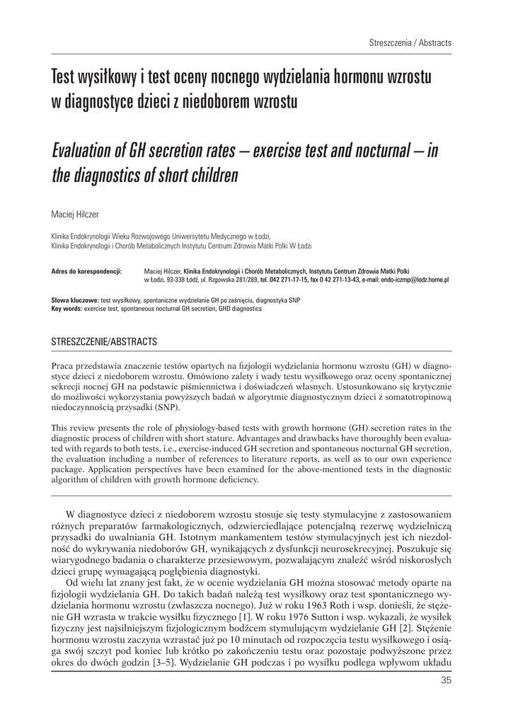 Streszczenia / Abstracts Test wysiłkowy i test oceny nocnego wydzielania hormonu wzrostu w diagnostyce dzieci z niedoborem wzrostu Evaluation of GH secretion rates – exercise test and nocturnal – in the diagnostics of short children Maciej Hilczer Klinika Endokrynologii Wieku Rozwojowego Uniwersytetu Medycznego w Łodzi, Klinika Endokrynologii i Chorób Metabolicznych Instytutu Centrum Zdrowia Matki Polki W Łodzi Adres do korespondencji: Maciej Hilczer, Klinika ������������������������������������������������������������������ Endokrynologii i Chorób Metabolicznych, Instytutu Centrum �������������������� Zdrowia Matki Polki w Łodzi, 93-338 Łódź, ul. Rzgowska 281/289, tel. ����� 042 271-17-15, ������������������� fax 0�� 42 271-13-43, ���������������������� e-mail: [email protected] ����������������������� Słowa kluczowe: test wysiłkowy, spontaniczne wydzielanie GH po zaśnięciu, diagnostyka SNP Key words: exercise test, spontaneous nocturnal GH secretion, GHD diagnostics Streszczenie/Abstracts Praca przedstawia znaczenie testów opartych na fizjologii wydzielania hormonu wzrostu (GH) w diagnostyce dzieci z niedoborem wzrostu. Omówiono zalety i wady testu wysiłkowego oraz oceny spontanicznej sekrecji nocnej GH na podstawie piśmiennictwa i doświadczeń własnych. Ustosunkowano się krytycznie do możliwości wykorzystania powyższych badań w algorytmie diagnostycznym dzieci z somatotropinową niedoczynnością przysadki (SNP). This review presents the role of physiology-based tests with growth hormone (GH) secretion rates in the diagnostic process of children with short stature. Advantages and drawbacks have thoroughly been evaluated with regards to both tests, i.e., exercise-induced GH secretion and spontaneous nocturnal GH secretion, the evaluation including a number of references to literature reports, as well as to our own experience package. Application perspectives have been examined for the above-mentioned tests in the diagnostic algorithm of children with growth hormone deficiency. W diagnostyce dzieci z niedoborem wzrostu stosuje się testy stymulacyjne z zastosowaniem różnych preparatów farmakologicznych, odzwierciedlające potencjalną rezerwę wydzielniczą przysadki do uwalniania GH. Istotnym mankamentem testów stymulacyjnych jest ich niezdolność do wykrywania niedoborów GH, wynikających z dysfunkcji neurosekrecyjnej. Poszukuje się wiarygodnego badania o charakterze przesiewowym, pozwalającym znaleźć wśród niskorosłych dzieci grupę wymagającą pogłębienia diagnostyki. Od wielu lat znany jest fakt, że w ocenie wydzielania GH można stosować metody oparte na fizjologii wydzielania GH. Do takich badań należą test wysiłkowy oraz test spontanicznego wydzielania hormonu wzrostu (zwłaszcza nocnego). Już w roku 1963 Roth i wsp. donieśli, że stężenie GH wzrasta w trakcie wysiłku fizycznego [1]. W roku 1976 Sutton i wsp. wykazali, że wysiłek fizyczny jest najsilniejszym fizjologicznym bodźcem stymulującym wydzielanie GH [2]. Stężenie hormonu wzrostu zaczyna wzrastać już po 10 minutach od rozpoczęcia testu wysiłkowego i osiąga swój szczyt pod koniec lub krótko po zakończeniu testu oraz pozostaje podwyższone przez okres do dwóch godzin [3–5]. Wydzielanie GH podczas i po wysiłku podlega wpływom układu 35 Endokrynol. Ped., vol. 9/2009, Suplement nr 1 adrenergicznego, cholinergicznego i opioidowego, ale fizjologiczne mechanizmy wpływające na wydzielanie tego hormonu nie są do końca poznane [6, 7]. Buckler w roku 1973 zaproponował pierwszy protokół wystandaryzowanego testu wysiłkowego dla dzieci, polegającego na 10-minutowym pedałowaniu na stacjonarnym rowerze. Próbkę krwi do oznaczeń GH pobierano w czasie 25 minut po zakończeniu testu [8]. Wadą takiego testu jest fakt, że nie nadaje się on do stosowania u bardzo małych dzieci. W roku 1984 de San Lazaro i wsp. opublikowali wyniki testu wysiłkowego przeprowadzonego przy użyciu bieżni na grupie 59 dzieci w wieku od 3 do 17 lat [9]. Test trwał od 7 do 10 minut w zależności od możliwości dziecka i polegał na intensywnym marszu na przemian z biegiem. Po wysiłku następował okres od 7 do 10 minut odpoczynku. Pobranie próbki krwi następowało 5, 15 i 25 minut po wysiłku. Za prawidłowe uznano wartości GH przekraczające 15 mU/l. U 10 dzieci wartości GH były poniżej 15 mU/l, a u siedmiorga dzieci z tej grupy rozpoznanie SNP potwierdzono w testach stymulacyjnych. U 44 dzieci w 5 minucie po zakończeniu testu wartości GH były powyżej 15 mU/l. Warto podkreślić, że z tej grupy 44 dzieci już w 15 minucie po zakończeniu testu wysiłkowego stwierdzono obniżenie stężenia GH poniżej przyjętej wartości progowej u 10 dzieci, a w 25 minucie u 18 dzieci (40,9% z grupy 44 dzieci z prawidłowym wyjściowym stężeniem GH). Stąd wniosek autorów, że optymalne jest pobierania próbki krwi do oznaczeń GH w 5 minucie po zakończeniu testu wysiłkowego. Zaletą przeprowadzania testu jest niski koszt (jedno oznaczenie GH) oraz możliwość wykonania w trybie ambulatoryjnym. Jednak opisuje się szereg wad: różnie przyjmowane protokoły badań (test przy użyciu bieżni, ergometru rowerowego, bieganie po schodach), brak możliwości nakłonienia dziecka do podjęcia wysiłku właściwego do potrzeb testu. Wysiłek powinien być wystarczająco intensywny, aby wywołać pewne niedotlenienie i musi być odpowiednio większy u dzieci wyjątkowo sprawnych fizycznie i wytrenowanych. Reasumując, problemem staje się standaryzacja takiego testu w stosunku do wieku pacjenta, składu masy ciała, aktywności fizycznej [10]. Hindmarsh i Swift [11] oc