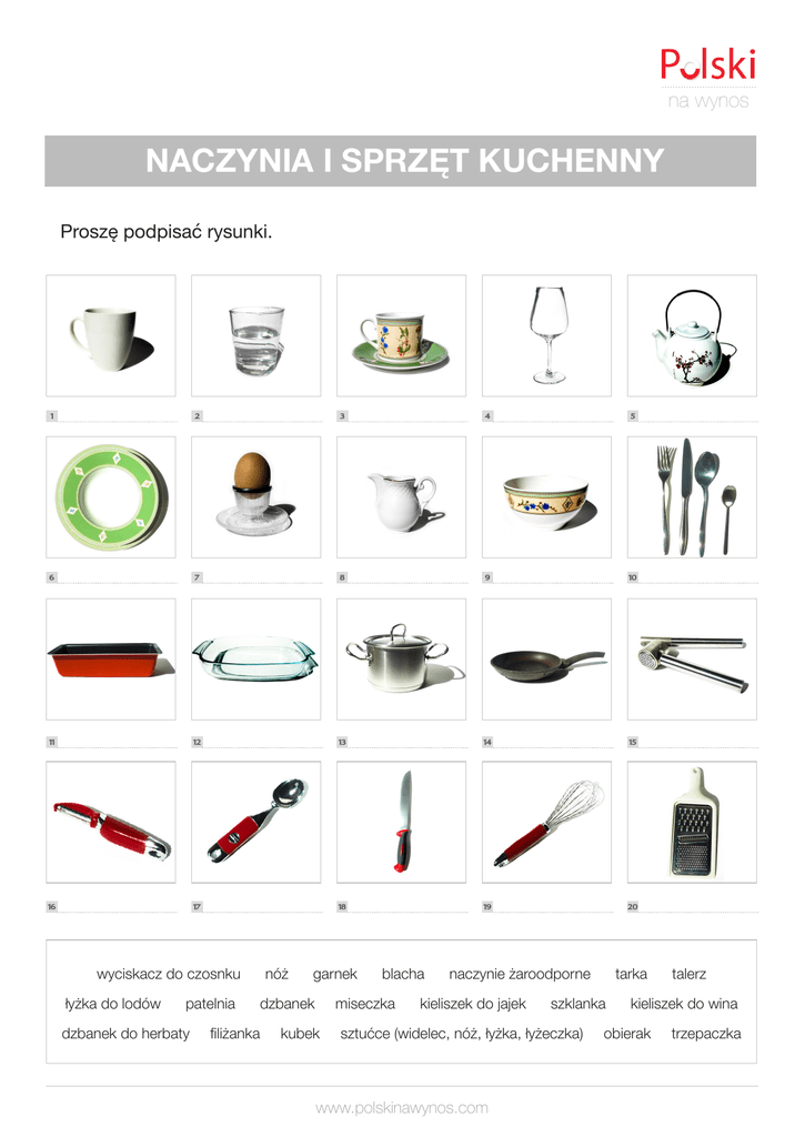 na wynos NACZYNIA I SPRZĘT KUCHENNY Proszę podpisać rysunki. 1 2 3 4 5 6 7 8 9 10 11 12 13 14 15 16 17 18 19 20 wyciskacz do czosnku łyżka do lodów patelnia dzbanek do herbaty nóż garnek dzbanek filiżanka blacha miseczka kubek naczynie żaroodporne kieliszek do jajek szklanka sztućce (widelec, nóż, łyżka, łyżeczka) www.polskinawynos.com tarka talerz kieliszek do wina obierak trzepaczka