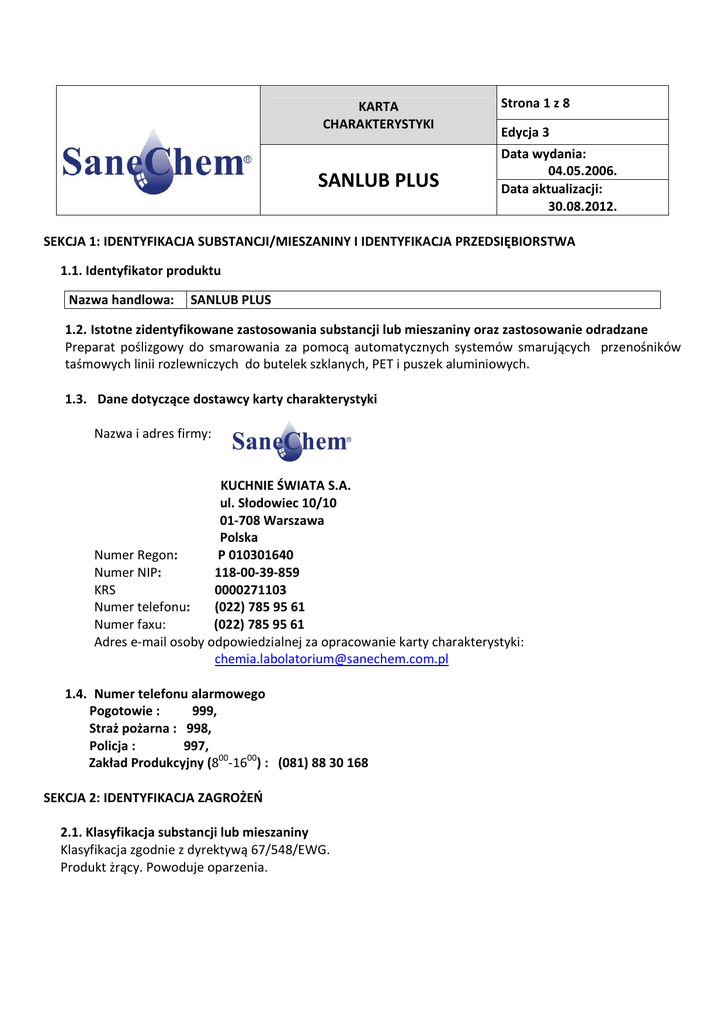 KARTA CHARAKTERYSTYKI SANLUB PLUS Strona 1 z 8 Edycja 3 Data wydania: 04.05.2006. Data aktualizacji: 30.08.2012. SEKCJA 1: IDENTYFIKACJA SUBSTANCJI/MIESZANINY I IDENTYFIKACJA PRZEDSIĘBIORSTWA 1.1. Identyfikator produktu Nazwa handlowa: SANLUB PLUS 1.2. Istotne zidentyfikowane zastosowania substancji lub mieszaniny oraz zastosowanie odradzane Preparat poślizgowy do smarowania za pomocą automatycznych systemów smarujących przenośników taśmowych linii rozlewniczych do butelek szklanych, PET i puszek aluminiowych. 1.3. Dane dotyczące dostawcy karty charakterystyki Nazwa i adres firmy: KUCHNIE ŚWIATA S.A. ul. Słodowiec 10/10 01-708 Warszawa Polska Numer Regon: P 010301640 Numer NIP: 118-00-39-859 KRS 0000271103 Numer telefonu: (022) 785 95 61 (022) 785 95 61 Numer faxu: Adres e-mail osoby odpowiedzialnej za opracowanie karty charakterystyki: [email protected] 1.4. Numer telefonu alarmowego Pogotowie : 999, Straż pożarna : 998, Policja : 997, Zakład Produkcyjny (800-1600) : (081) 88 30 168 SEKCJA 2: IDENTYFIKACJA ZAGROŻEŃ 2.1. Klasyfikacja substancji lub mieszaniny Klasyfikacja zgodnie z dyrektywą 67/548/EWG. Produkt żrący. Powoduje oparzenia. KARTA CHARAKTERYSTYKI SANLUB PLUS Strona 2 z 8 Edycja 3 Data wydania: 04.05.2006. Data aktualizacji: 30.08.2012. 2.2. Elementy oznakowania Znak i symbol ostrzegawczy: C - ŻRĄCY Zwroty R wskazujące rodzaj zagrożenia: R 34 – Powoduje oparzenia, Zwroty S określające warunki bezpiecznego stosowania: S 26 – Zanieczyszczone oczy przemyć natychmiast dużą ilością wody i zasięgnąć porady lekarza, S 27/28 – W przypadku zanieczyszczenia skóry natychmiast zdjąć całą zanieczyszczoną odzież i przemyć zanieczyszczoną skórę dużą ilością wody, S 36/37/39 – Nosić odpowiednią odzież ochronną i okulary lub ochronę twarzy, S 45 – W przypadku awarii lub jeżeli źle się poczujesz, niezwłocznie zasięgnij porady lekarza – jeżeli to możliwe, pokaż etykietę. 2.3. Inne zagrożenia Brak danych. SEKCJA 3: SKŁAD / INFORMACJA O SKŁADNIKACH 3.1. Substancje Nie dotyczy. 3.2. Mieszaniny Nr CAS Nr WE Nr indeksowy Zawartość [% wag.] Klasyfikacja wg dyrektywy 67/548/EWG Klasyfikacja wg rozporządzenia 1272/2008 (CLP) Diamina alkilowa 7173-62-8 230-528-9 brak danych <9 Xn, C, N R22, R35, R50 - Alkiloamina 112-90-3 204-015-5 brak danych <1 Xn, C, N R22, R35, R50 - Alkilowy eter kwasu karboksylowego 57635-48-0 polimer brak danych <6 Xi, R38, R41 - Kwas 2hydroksypropionowy 598-82-3 209-954-4 brak danych <5 Xi, R38, R41 Eye Dam. 1, H318 Skin Irrit. 2, H315 68439-50-9 polimer brak danych <5 Xn, Xi, N R22, R41, R50 Acute Tox.; 4;H302 Eye Dam. 1, H318 Aquatic Acute 1; H400 Nazwa substancji / nr rejestracyjny Eter alkilowo poliglikolowy Opis zwrotów R i H podano w pkt. 16. KARTA CHARAKTERYSTYKI SANLUB PLUS Strona 3 z 8 Edycja 3 Data wydania: 04.05.2006. Data aktualizacji: 30.08.2012. SEKCJA 4: ŚRODKI PIERWSZEJ POMOCY 4.1. Opis środków pierwszej pomocy Narażenie przez drogi oddechowe: Wyprowadzić poszkodowanego z miejsca narażenia, zapewnić spokój, świeże powietrze. W razie dolegliwości zasięgnąć porady lekarskiej. Narażenie przez kontakt ze skórą: Usunąć zwilżone części odzieży. Oblane części ciała natychmiast przemyć dużą ilością bieżącej wody. W razie potrzeby zapewnić pomoc lekarską. Narażenie przez kontakt z oczami: Chronić oczy przed kontaktem z wyrobem gotowym. Podczas kontaktu może wystąpić poważne podrażnienie. Oczy płukać co najmniej 15 minut dużą ilością chłodnej wody, przy szeroko rozwartych powiekach. Unikać silnego strumienia wody ze względu na mechaniczne uszkodzenie rogówki. Niezabrudzone oko chronić. Niezwłocznie zapewnić pomoc okulisty. Narażenie przez przewód pokarmowy: Natychmiast wypłukać jamę ustną a następnie wypić dużą ilość wody. Poza tym nie podawać nic doustnie. Natychmiast zapewnić pomoc lekarską. Nie wywoływać wymiotów. 4.2. Najważniejsze ostre i opóźnione objawy oraz skutki narażenia Skutki zdrowotne narażenia ostrego: poparzenia skóry oraz uszkodzenia wzroku. 4.3. Wskazania dotyczące wszelkiej natychmiastowej pomocy lekarskiej i szczególnego postępowania z poszkodowanym Jeżeli poszkodowany jest nieprzytomny, należy w razie konieczności udrożnić drogi oddechowe, ułożyć go w pozycji bocznej ustalonej i niezwłocznie zapewnić pomoc lekarską. SEKCJA 5: POSTĘPOWANIE W PRZYPADKU POŻARU 5.1. Środki gaśnicze Mieszanina nie jest palna w związku z powyższym nie podtrzymuje reakcji spalania. Pojemniki z mieszaniną nie objęte pożarem usunąć z zagrożonego terenu. Pożar w obecności mieszaniny gasić środkami odpowiednimi dla grup pożarów, tzn. A – pożary ciał stałych, pochodzenia organicznego, przy spalaniu których obok innych zjawisk powstaje zjawisko żarzenia np. drewno, papier, tworzywa sztuczne, i inne. (pożary tej grupy można gasić: pianą gaśniczą, proszkiem gaśniczym, wodą), B – pożary cieczy palnych i substancji stałych topiących się wskutek ciepła wytwarzającego się przy pożarze np. benzyna, alkohole, aceton, oleje. (pożary tej grupy można gasić: pianą gaśniczą, dwutlenkiem węgla, proszkiem gaśniczym), C – pożary gazów np. metan, acetylen, propan (pożary tej grupy można gasić: dwutlenkiem węgla, proszkiem gaśniczym), D – pożary metali np. magnez, sód, potas, uran. (gaśnice proszkowe). 5.2. Szczególne zagrożenia związane z substancją lub mieszaniną Brak danych. 5.3. Informacje dla straży pożarnej Strażacy uczestniczący w akcji ratowniczo – gaśniczej muszą bezwzględnie być wyposażeni w odzież ochronną, środki ochrony indywidualnej, w tym aparaty ochrony dróg oddechowych. KARTA CHARAKTERYSTYKI SANLUB PLUS Strona 4 z 8 Edycja 3 Data wydania: 04.05.2006. Data aktualizacji: 30.08.2012. SEKCJA 6: POSTĘPOWANIE W PRZYPADKU NIEZAMIERZONEGO UWOLNIENIA DO ŚRODOWISKA 6.1. Indywidualne środki ostrożności, wyposażenie ochronne i procedu