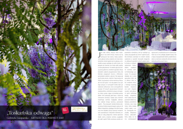 fot. © TimeMachine J est taka roślina, pnącze, która wzbu- powiednio oświetlona, tak by wydobyć jej ograniczeń, a wyobraźnia jest w stanie prze- dza w nas wiele emocji, można się nią walory, by pojawiły się cienie i tajemniczość. nieść nas w inny odległy zakątek świata. Cóż Dla kontrastu aranżacje na stołach zostały z tego, że pogoda była fatalna, padał deszcz, wykonane w sposób niezwykle elegancki, skoro w namiocie zaświeciło słońce a kwiaty tostanów niemal spada nam na głowę, a nie- na szklanych wysokich rurkach upięte zosta- rozkwitły pełnią swych barw. zwykłe pnącza oplatają nie tylko ściany czy ły kwiaty w różnych pergole ale również nas. Kwiat dziki, piękny odcieniach o niezwykłej barwie. To właśnie glicynia, któ- dołem rą znamy głównie z włoskich ogrodów. Kiedy na aranżacji zielo- dostałam zadanie przygotowania ślubu dla no-fioletowego po- klientów związanych mocno z Włochami, szycia. To poszycie pomyślałam właśnie o glicynii. Tak rozpoczął składało się z wielu się żmudny proces „importu” tego kwiatu do gatunków roślin, ale Polski. Co prawda on rośnie również w Polsce w efekcie miło ro- ale nie tak bujnie i nie tak pięknie. By użyć bić wrażenie mchu, tego pnącza w scenografii trzeba było go z którego wyrastają właściwie odtworzyć, nieco scenograficznie bardzo oszukać. W starych opuszczonych domach sne rurki i dopiero znajdowaliśmy wieloletnie pnącza winogro- wysoko nad głowa- na, różne, grube, wijące się bardziej proste, mi gości rozkwitają dzikie. One posłużyły jako baza i stelaż do kwiaty. stworzenia aranżacji. Upięte przy ścianach niem całości był od- weselnego namiotu wyglądały odświęt- powiedni dobór wy- nie, nabrały innego wymiaru, powstawał kładziny, oświetlenie ogród… Przy pnączach stanęły drzewa aka- namiotu, oraz masa cji, których listki przypominają te z glicynii. W świec, która dodała efekcie dopięliśmy spadające do dołu kwiaty całości ciepła i uro- „Toskańska odwaga” oraz inne dodatki, tak by stworzyć wrażenie ku. Scenografia nie- tych prawdziwych. Wszystkie elementy zo- zwykła, nietypowa. stały ze sobą połączone, niemal splecione Znowu udowodni- Gabriela Gasparska - ARTSIZE DLA PERFECT DAY dzięki czemu wnętrze namiotu wyglądało liśmy sobie, że nie jak rajski ogród. Dzika aranżacja została od- ma fot. © TimeMachine zachwycać bez końca. Kiedy podnie- siemy głowę mamy wrażenie, że masa kwia- fioletu, osadzone nowocze- Uzupełnie- aranżacyjnych