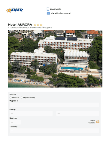61 852 45 72 [email protected] Hotel AURORA Chorwacja / Dalmacja Południowa / Podgora Dojazd: Autobus Dojazd własny Wyjazd z: Osoby: Noclegi: Dzień wyjazdu Terminy: Pokój: Wyżywienie: Najtańsza oferta Styczniowe Rabaty zniżka 20% cena katalogowa do 6 marca 2017: 7224,00 zł do 6 marca 2017: 2167,20 zł do 17 sierpnia 2017: 0,00 zł do 17 sierpnia 2017: 5056,80 zł Suma: 7224,00 zł Suma: 7224,00 zł Opis oferty Miejscowość Atuty bliskość Opinieplaży bliskość centrum aperitif bar, bar przy basenie pokoje z widokiem na morze lub góry winda basen z tarasem słonecznym brodzik dla dzieci bezpłatna klimatyzacja bezpłatny Internet WiFi Położenie Położony na Riwierze Makarskiej w miejscowości Podgora, komfortowy hotel z basenem. Doskonałe miejsce na wypoczynek w jednej z najbardziej malowniczych miejscowości tego regionu. Jasny żwirek na plaży, turkusowozielony kolor morza, ukwiecona promenada z kolorowymi łódkami w porcie to tylko niektóre z atutów przyciągających turystów do wymarzonych wakacji w Hotelu Aurora! Basen z tarasem słonecznym, bar, brodzik dla dzieci i piękna plaża to idealny sposób na spędzenie niezapomnianych chwil! Zakwaterowanie Pokoje dwuosobowe z możliwością dostawki z widokiem na morze lub na góry. Dostępne opcje zakwaterowania pokój 2 osobowy pokój 2 osobowy z możliwością dostawki Dostępne opcje wyżywienia śniadania i obiadokolacje w formie bufetu Pakiet KOMFORT gwarancja wyboru miejsca w autokarze napoje w autokarze w cenie (6 x do wyboru: kawa, herbata, zimny napój 0,2l) cena: 50 zł/os Pakiet PRESTIGE gwarancja wyboru miejsca w autokarze napoje w autokarze w cenie (6 x do wyboru: kawa, herbata, zimny napój 0,2l) pierwszeństwo wejścia na pokład autokaru nadbagaż 5 kg w cenie suchy prowiant na drogę powrotną cena: 100 zł/os Karta Dużej Rodziny www.oskar.com.pl/zalaczniki/karta_duzej_rodziny Warunki promocji FIRST MINUTE www.oskar.com.pl/zalaczniki/warunki_promocji Ubezpieczenie Warunki ubezpieczenia Bezpieczne Podróże Signal Iduna dokument do pobrania www.oskar.com.pl/zalaczniki/owu Warunki ubezpieczenia Kosztów Imprezy Turystycznej Signal Iduna dokument do pobrania www.oskar.com.pl/zalaczniki/owurg Turystyczny Fundusz Gwarancyjny W związku z powołaniem do życia w dniu 26.11.2016 Turystycznego Funduszu Gwarancyjnego każdy klient Biura Podróży Oskar zobowiązany jest do zapłaty kwoty w wysokości 10zł/os. przy każdorazowej rezerwacji imprezy turystycznej (obowiązuje od dnia 26.11.2016). Kwota przeznaczona na Turystyczny Fundusz Gwarancyjny zostanie automatycznie doliczona do wartości rezerwacji (w momencie jej dokonania). Wyjątkiem są imprezy turystyczne odbywające się w krajach posiadających granicę z Rzeczpospolitą Polską. Składka nie jest przychodem biura. Udogodnienia Widok na morze Klimatyzacja Regulowane fotele Tacki Multimedia Nowoczesna flota Zawodowy kierowca Pasy bezpieczeństwa Toaleta w autokarze Podnóżki Dla rodzin z dziećmi Wi-Fi Basen kryty Winda Bez paszportu Blisko plaży Basen odkryty Restauracja hotelowa Region nadmorski Program ramowy Dzień 1 Wyjazd z Polski zgodnie z rozkładem jazdy autokarów. Przejazd przez Czechy, Słowację, Węgry. Dzień 2 Przyjazd do Podgory w godzinach przedpołudniowych. Czas wolny. Zakwaterowanie od godz. 12:00. Dzień 3-15 Pobyt na miejscu. Możliwość korzystania z dodatkowych wycieczek fakultatywnych, np. Dubrownik, Split i Trogir, Park Narodowy Krka, Jeziora Plitvickie, Medugorije + Mostar, Rejs statkiem na Hvar i Brac - Fish Picnic, Park Przyrody Biokovo. Dzień 16 Wykwaterowanie do godziny 09:00. Czas wolny. Wyjazd do Polski w godzinach popołudniowych (ok. godz. 15:00). Przejazd przez Węgry, Słowację, Czechy. Dzień 17 Przyjazd do Polski. Orientacyjne godziny powrotu do poszczególnych miast zgodnie z rozkładem jazdy autokarów. Cena obejmuje przejazd autokarem klasy LUX (klimatyzacja, cafe - bar, DVD, WC) zakwaterowanie: 14 noclegów w Hotelu AURORA opiekę pilota w czasie podróży opieka rezydenta na miejscu wyżywienie HB: śniadania i obiadokolacje ubezpieczenie KL 10000 euro, NNW 10000 zł, bagaż (utrata 500 zł) Cena nie obejmuje Dopłaty wymagane na miejscu opłata klimatyczna 15 euro/os; dzieci do 12 lat płacą 50% - płatne u pilota w autokarze Dopłaty opcjonalne ubezpieczenie od chorób przewlekłych i nowotworowych KL 20000 euro, NNW 10000 zł, bagaż (utrata 500 zł): 240 zł/os ubezpieczenie od kosztów rezygnacji: 3,5% wartości rezerwacji Informacje dodatkowe dokumenty: paszport lub dowód osobisty (zgodnie z obowiązującymi przepisami) zaleca się wyrobienie karty EKUZ Chcesz wiedzieć szybciej? Polub nas na facebooku OSKAR Sp. z o.o. pl.Wolności 2/4c, 61-738 Poznań Potrzebujesz pomocy? Zadzwoń lub napisz: 61 852 45 72 [email protected] Zadzwoń Projekt i wdrożenie: Simply User