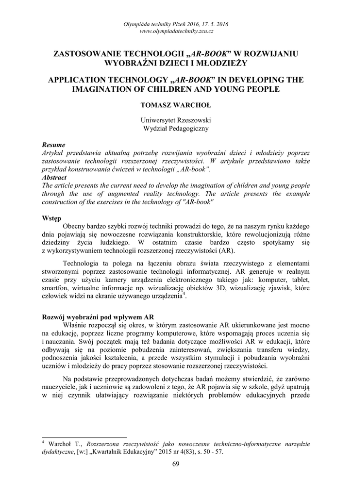 Olympiáda techniky Plzeņ 2016, 17. 5. 2016 www.olympiadatechniky.zcu.cz ZASTOSOWANIE TECHNOLOGII „AR-BOOK” W ROZWIJANIU WYOBRAŹNI DZIECI I MŁODZIEŻY APPLICATION TECHNOLOGY „AR-BOOK” IN DEVELOPING THE IMAGINATION OF CHILDREN AND YOUNG PEOPLE TOMASZ WARCHOŁ Uniwersytet Rzeszowski Wydział Pedagogiczny Resume Artykuł przedstawia aktualną potrzebę rozwijania wyobraźni dzieci i młodzieży poprzez zastosowanie technologii rozszerzonej rzeczywistości. W artykule przedstawiono także przykład konstruowania ćwiczeń w technologii „AR-book‖. Abstract The article presents the current need to develop the imagination of children and young people through the use of augmented reality technology. The article presents the example construction of the exercises in the technology of "AR-book" Wstęp Obecny bardzo szybki rozwój techniki prowadzi do tego, że na naszym rynku każdego dnia pojawiają się nowoczesne rozwiązania konstruktorskie, które rewolucjonizują różne dziedziny życia ludzkiego. W ostatnim czasie bardzo często spotykamy się z wykorzystywaniem technologii rozszerzonej rzeczywistości (AR). Technologia ta polega na łączeniu obrazu świata rzeczywistego z elementami stworzonymi poprzez zastosowanie technologii informatycznej. AR generuje w realnym czasie przy użyciu kamery urządzenia elektronicznego takiego jak: komputer, tablet, smartfon, wirtualne informacje np. wizualizację obiektów 3D, wizualizację zjawisk, które człowiek widzi na ekranie używanego urządzenia4. Rozwój wyobraźni pod wpływem AR Właśnie rozpoczął się okres, w którym zastosowanie AR ukierunkowane jest mocno na edukację, poprzez liczne programy komputerowe, które wspomagają proces uczenia się i nauczania. Swój początek mają też badania dotyczące możliwości AR w edukacji, które odbywają się na poziomie pobudzenia zainteresowań, zwiększania transferu wiedzy, podnoszenia jakości kształcenia, a przede wszystkim stymulacji i pobudzania wyobraźni uczniów i młodzieży do pracy poprzez stosowanie rozszerzonej rzeczywistości. Na podstawie przeprowadzonych dotychczas badań możemy stwierdzić, że zarówno nauczyciele, jak i uczniowie są zadowoleni z tego, że AR pojawia się w szkole, gdyż upatrują w niej czynnik ułatwiający rozwiązanie niektórych problemów edukacyjnych przede Warchoł T., Rozszerzona rzeczywistość jako nowoczesne techniczno-informatyczne narzędzie dydaktyczne, [w:] „Kwartalnik Edukacyjny‖ 2015 nr 4(83), s. 50 - 57. 4 69 Olympiáda techniky Plzeņ 2016, 17. 5. 2016 www.olympiadatechniky.zcu.cz wszystkim można mieć nadzieję, że AR rozwija wyobraźnię uczniów, która według ich oceny jest mocno zaniedbana5. Badania w zakresie rozwoju wyobraźni pokazują, że uczniowie potrzebują rozwoju wyobraźni przestrzennej, bo pozwala im rozwijać projektowanie struktur technicznych, w planowaniu przestrzeni na wykonywanie prac, czy budowli. Następnym ważnym elementem jest także wyobraźnia konstrukcyjna, która stanowi dla ucznia istotny składnik w zakresie projektowania i konstruowania, różnych obiektów. Te dwa rodzaje wyobraźni w badaniach uzyskały najwyższy wskaźnik, dlatego można wnioskować, że są one współcześnie bardzo ważne dla rozwoju zdolności psychicznych uczniów. W badaniach wskazano także na wyobraźnię kinetyczną i operacyjną, jednak ich wskaźniki były znacznie niższe. AR pozwala także na rozwój i tego typu wyobraźni, gdyż umożliwia tworzenie odpowiednich zestawów ruchów i wykonywanie operacji odpowiednio zaprogramowanych przez projektantów. Możemy na podstawie tego skróconego raportu badań z zakresu rozwoju wyobraźni pod wpływem rozszerzonej rzeczywistości stwierdzić, że jest to technologia, która ma w sobie potencjał do dalszego rozwoju i zastosowania w edukacji. Technologia AR-book Na podstawie wyników badań przedstawionych w powyższym podrozdziale opracowano pierwszą część AR-book. Jest to aplikacja przeznaczona zarówno na smartfony, jak i komputery, telewizory z modułem kamery i przeglądarki internetowe. Powstała z połączenia dwóch podstawowych komponentów oprogramowania Unity 3D i bibliotek Vufori. Pierwszy z wymienionych komponentów Unity3D jest programem komputerowym służącym do tworzenia gier komputerowych na platformy Windows i Mac. Jednak jego zastosowania już nie tylko ograniczają się do takiej roli, bo coraz częściej przy użyciu właśnie tego oprogramowania i implementacji Vufori tworzy się zaawansowane środowiska AR. Implementacja Vufori jest jednym z najistotniejszych elementów, gdyż to właśnie na podstawie tych bibliotek można używać kamerę zainstalowaną w urządzeniu, a co więcej biblioteki te pozwalają także na dodanie do środowiska AR tzw. cel (target), czyli miejsc, w których będą wyświetlać się zaprojektowane w dalszym etapie modele, symulacje czy inne elementy, które programista zaimplementuje. Biblioteki te mają wiele zalet, gdyż bardzo mocno rozwijają możliwości AR. Jest to spowodowane tym, że pozwalają na wyświetlenie obiektów na dowolnym zdjęciu, obrazie, powierzchni. Jest to zależne tylko i wyłącznie od kreatywności konstruktora. W przypadku dawnych aplikacji istniało duże ograniczenie spowodowane tym, iż miejsca, w których miały wyświetlać się elementy musiały mieć odpowiednią konstrukcję przedstawiona na rysunku poniżej. 5 Warchoł T., Badanie możliwości edukacyjnych rozszerzonej rzeczywistości – sprawozdanie z badań [w:] „Edukacja – Technika – Informatyka‖, Wyd. UR, Rzeszów Nr 1/2016, s. 126. 70 Olympiáda techniky Plzeņ 2016, 17. 5. 2016 www.olympiadatechniky.zcu.cz Rys.1. Konstrukcja markera6. Aktualnie poprzez wspomniane wyżej komponenty możemy tworzyć dowolne markery. Właśnie na potrzeby dzieci w wieku wczesnoszkolnych został zaprojektowany ARbook, w którym prócz zwykłej książki, dziecko dzięki zainstalowaniu aplikacji na swoim smartfonie, 