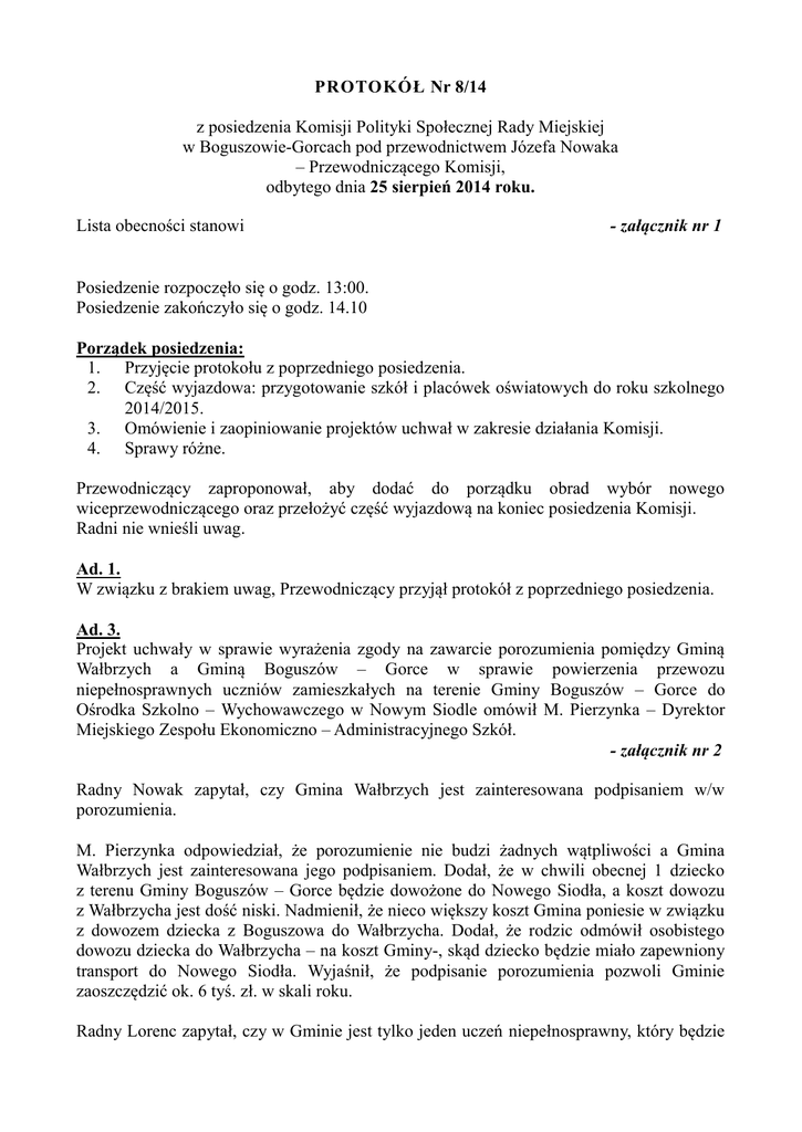 PROTOKÓŁ Nr 8/14 z posiedzenia Komisji Polityki Społecznej Rady Miejskiej w Boguszowie-Gorcach pod przewodnictwem Józefa Nowaka – Przewodniczącego Komisji, odbytego dnia 25 sierpień 2014 roku. Lista obecności stanowi - załącznik nr 1 Posiedzenie rozpoczęło się o godz. 13:00. Posiedzenie zakończyło się o godz. 14.10 Porządek posiedzenia: 1. Przyjęcie protokołu z poprzedniego posiedzenia. 2. Część wyjazdowa: przygotowanie szkół i placówek oświatowych do roku szkolnego 2014/2015. 3. Omówienie i zaopiniowanie projektów uchwał w zakresie działania Komisji. 4. Sprawy różne. Przewodniczący zaproponował, aby dodać do porządku obrad wybór nowego wiceprzewodniczącego oraz przełożyć część wyjazdową na koniec posiedzenia Komisji. Radni nie wnieśli uwag. Ad. 1. W związku z brakiem uwag, Przewodniczący przyjął protokół z poprzedniego posiedzenia. Ad. 3. Projekt uchwały w sprawie wyrażenia zgody na zawarcie porozumienia pomiędzy Gminą Wałbrzych a Gminą Boguszów – Gorce w sprawie powierzenia przewozu niepełnosprawnych uczniów zamieszkałych na terenie Gminy Boguszów – Gorce do Ośrodka Szkolno – Wychowawczego w Nowym Siodle omówił M. Pierzynka – Dyrektor Miejskiego Zespołu Ekonomiczno – Administracyjnego Szkół. - załącznik nr 2 Radny Nowak zapytał, czy Gmina Wałbrzych jest zainteresowana podpisaniem w/w porozumienia. M. Pierzynka odpowiedział, że porozumienie nie budzi żadnych wątpliwości a Gmina Wałbrzych jest zainteresowana jego podpisaniem. Dodał, że w chwili obecnej 1 dziecko z terenu Gminy Boguszów – Gorce będzie dowożone do Nowego Siodła, a koszt dowozu z Wałbrzycha jest dość niski. Nadmienił, że nieco większy koszt Gmina poniesie w związku z dowozem dziecka z Boguszowa do Wałbrzycha. Dodał, że rodzic odmówił osobistego dowozu dziecka do Wałbrzycha – na koszt Gminy-, skąd dziecko będzie miało zapewniony transport do Nowego Siodła. Wyjaśnił, że podpisanie porozumienia pozwoli Gminie zaoszczędzić ok. 6 tyś. zł. w skali roku. Radny Lorenc zapytał, czy w Gminie jest tylko jeden uczeń niepełnosprawny, który będzie dowożony do Ośrodka Szkolno – Wychowawczego w Nowym Siodle. M. Pierzynka odpowiedział, że do Nowego Siodła będzie dowożone tylko jedno, niesłyszące dziecko. Radny Wysocki zapytał, czy niepełnosprawne dziecko będzie zabierane z domu. M. Pierzynka odpowiedział, że dziecko będzie zabierane ze wskazanego miejsca a następnie dowożone do Wałbrzycha, na ul. Konopnickiej, skąd zostanie zawiezione do Nowego Siodła. Wyjaśnił, że gdyby autobus jadący z Wałbrzycha odbierał dziecko z Boguszowa, byłby to bardzo duży koszt dla Gminy. Ponad to jest jeszcze wiele dzieci niepełnosprawnych, które będą dowożone do innych placówek. Nadmienił, że w roku 2013 było to prawie 40 dzieci. Radny Wysocki zapytał, ile dzieci jest dowożonych z Wałbrzycha do Nowego Siodła. M. Pierzynka odpowiedział, że do Ośrodka Szkolno – Wychowawczego w Nowym Siodle jest dowożonych 12 dzieci z Wałbrzycha. Radny Wysocki zapytał, jaki byłby dodatkowy koszt w przypadku gdyby autobus z Wałbrzycha przyjeżdżał i odbierał niepełnosprawne dziecko z Boguszowa – Gorc i dowoził je do Nowego Siodła. M. Pierzynka odpowiedział, że w skali roku byłoby to koszt ok. 18 tyś. zł. Radny Wysocki zapytał ile dzieci niepełnosprawnych z terenu Gminy jest dowożonych do szkół specjalnych. M. Pierzynka odpowiedział, że jest to ok. 40 dzieci. Radny Wysocki stwierdził, że takie rozwiązanie kwestii dowozu niepełnosprawnego dziecka jest krzywdzące zarówno dla rodzica jak i dla samego dziecka. Dodał, że lepiej byłoby aby autobus jadący z Wałbrzycha odbierał dziecko z Boguszowa i zawiózł je do Nowego Siodła. M. Pierzynka odpowiedział, że w związku z tym, iż rodzic nie wyraził zgody na dowóz osobisty, zostanie podpisana umowa z osobą, która będzie dowozić dziecko z Boguszowa do Wałbrzycha, a później je odbierać i odwozić pod dom. Wyjaśnił, że takie rozwiązanie będzie mniej kosztowne niż odbiór dziecka przez autobus jadący z Wałbrzycha. Radny Wysocki zapytał, czy osobę przewożącą typuje Gmina. M. Pierzynka odpowiedział, że tą osobę będzie opłacała Gmina. Radny Wysocki zapytał jaki jest koszt za 1 km. M. Pierzynka odpowiedział, że od 2,50 zł. wzwyż. Radny Wysocki zapytał, czy nie byłoby taniej i korzystniej dla dziecka, aby bus z Wałbrzycha przyjeżdżał i je odbierał spod domu, zawoził do Nowego Siodła a następnie odwoził pod dom. M. Pierzynka wyjaśnił, że korzystniej pod względem finansowym będzie dowozić dziecko z Boguszowa do Wałbrzycha. Radny Wysocki stwierdził, że rozwiązanie proponowane przez M. Pierzynkę nie jest korzystne dla niepełnosprawnego dziecka. M. Pierzynka zauważył, że w związku z faktem, iż rodzic odmówił dowozu dziecka do Wałbrzycha, należało znaleźć inne rozwiązanie, najbardziej korzystne dla obu stron. Dodał, że dzienny koszt dowozu dziecka będzie wynosił 40 zł. Radny Wysocki stwierdził, że jest przeciwny takiemu rozwiązaniu. Dodał, że dla niepełnosprawnego dziecka nie jest dobrym rozwiązaniem aby jeździło samo komunikacją miejską. M. Pierzynka zauważył, że dziecko nie będzie wożone z Boguszowa do Wałbrzycha komunikacją miejską, tylko będzie zabierane spod domu i dowożone prywatnym samochodem do Wałbrzycha, a w Wałbrzychu wsiądzie do busa przystosowanego do osób niepełnosprawnych, który zawiezie je, wraz z innymi niepełnosprawnymi dziećmi. Radny Wysocki zapytał, czy dzieci niepełnosprawne jadące busem, muszą mieć innego niż kierowca opiekuna. M. Pierzynka odpowiedział, że nie ma takiego wymogu. I. Dzilińska – Sekretarz Miasta, dodała, że rozwiązanie omawiane przez M. Pierzynkę nie ma na celu oszczędzać na niepełnosprawnym dziecku. Wyjaśniła, że pomimo faktu, iż należy szukać oszczędności, to dziecko i zapewn