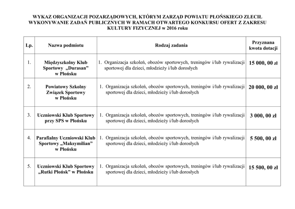 WYKAZ ORGANIZACJI POZARZĄDOWYCH, KTÓRYM ZARZĄD POWIATU PŁOŃSKIEGO ZLECIŁ WYKONYWANIE ZADAŃ PUBLICZNYCH W RAMACH OTWARTEGO KONKURSU OFERT Z ZAKRESU KULTURY FIZYCZNEJ w 2016 roku Rodzaj zadania Przyznana kwota dotacji Lp. Nazwa podmiotu 1. Międzyszkolny Klub Sportowy „Durasan” w Płońsku 1. Organizacja szkoleń, obozów sportowych, treningów i/lub rywalizacji 15 000, 00 zł sportowej dla dzieci, młodzieży i/lub dorosłych 2. Powiatowy Szkolny Związek Sportowy w Płońsku 1. Organizacja szkoleń, obozów sportowych, treningów i/lub rywalizacji 20 000, 00 zł sportowej dla dzieci, młodzieży i/lub dorosłych 3. Uczniowski Klub Sportowy przy SPS w Płońsku 1. Organizacja szkoleń, obozów sportowych, treningów i/lub rywalizacji sportowej dla dzieci, młodzieży i/lub dorosłych 3 000, 00 zł 4. Parafialny Uczniowski Klub 1. Organizacja szkoleń, obozów sportowych, treningów i/lub rywalizacji sportowej dla dzieci, młodzieży i/lub dorosłych Sportowy „Maksymilian” w Płońsku 5 500, 00 zł 5. Uczniowski Klub Sportowy „Rutki Płońsk” w Płońsku 1. Organizacja szkoleń, obozów sportowych, treningów i/lub rywalizacji 15 500, 00 zł sportowej dla dzieci, młodzieży i/lub dorosłych 6. Płońskie Stowarzyszenie Brydża Sportowego „Impas” w Płońsku 1. Organizacja szkoleń, obozów sportowych, treningów i/lub rywalizacji sportowej dla dzieci, młodzieży i/lub dorosłych 1 500, 00zł 7. Towarzystwo Przyjaciół Dzieci, Oddział MiejskoPowiatowy w Płońsku 2. Promocja zdrowego stylu życia poprzez zajęcia i/lub imprezy sportowo-rekreacyjne 4 500, 00 zł 8. Płońska Akademia Futbolu w Płońsku 1. Organizacja szkoleń, obozów sportowych, treningów i/lub rywalizacji sportowej dla dzieci, młodzieży i/lub dorosłych młodzieży i/lub dorosłych 4 000, 00 zł 9. Płońskie Towarzystwo Siatkówki „PTS Płońsk” w Płońsku 1. Organizacja szkoleń, obozów sportowych, treningów i/lub rywalizacji sportowej dla dzieci, młodzieży i/lub dorosłych 5 000, 00 zł 10. Budowlani Boxing Team Płońsk w Płońsku 1. Organizacja szkoleń, obozów sportowych, treningów i/lub rywalizacji sportowej dla dzieci, młodzieży i/lub dorosłych 6 500, 00 zł 2. Promocja zdrowego stylu życia poprzez zajęcia i/lub imprezy Fundacja Profilaktyki, sportowo-rekreacyjne Resocjalizacji oraz Pomocy Rodzinom Zagrożonym Wykluczeniem Społecznym „Radość Dzieciom” w Raciążu 4 500, 00 zł 11.