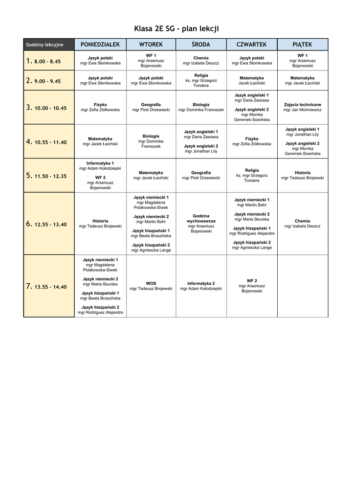 Klasa 2E SG - plan lekcji Godziny lekcyjne PONIEDZIAŁEK WTOREK ŚRODA CZWARTEK PIĄTEK 1. 8.00 - 8.45 Język polski mgr Ewa Słomkowska WF 1 mgr Arseniusz Bojanowski Chemia mgr Izabela Deszcz Język polski mgr Ewa Słomkowska WF 1 mgr Arseniusz Bojanowski 2. 9.00 - 9.45 Język polski mgr Ewa Słomkowska Język polski mgr Ewa Słomkowska Religia ks. mgr Grzegorz Tondera Matematyka Jacek Łaciński Matematyka mgr Jacek Łaciński 3. 10.00 - 10.45 4. 10.55 - 11.40 Fizyka mgr Zofia Ziółkowska Matematyka mgr Jacek Łaciński Informatyka 1 mgr Adam Kołodziejski 5. 11.50 - 12.35 WF 2 mgr Arseniusz Bojanowski Geografia mgr Piotr Drzewiecki Biologia mgr Dominika Franoszek Matematyka mgr Jacek Łaciński Biologia mgr Dominika Franoszek Język angielski 1 mgr Daria Zawiasa Język angielski 2 mgr Jonathan Lily Geografia mgr Piotr Drzewiecki Język niemiecki 1 mgr Magdalena Polakowska-Siwek 6. 12.55 - 13.40 Historia mgr Tadeusz Brojewski Język niemiecki 2 mgr Martin Bahr Język hiszpański 1 mgr Beata Brzezińska Język angielski 1 mgr Daria Zawiasa Język angielski 2 mgr Monika Geremek-Sowińska Fizyka mgr Zofia Ziółkowska Religia ks. mgr Grzegorz Tondera Godzina wychowawcza mgr Arseniusz Bojanowski Język niemiecki 2 mgr Maria Skurska Język hiszpański 1 mgr Rodriguez Alejandro Język hiszpański 2 mgr Agnieszka Lange Język niemiecki 1 mgr Magdalena Polakowska-Siwek 7. 13.55 - 14.40 Język hiszpański 1 mgr Beata Brzezińska Język hiszpański 2 mgr Rodriguez Alejandro WOS mgr Tadeusz Brojewski Język angielski 1 mgr Jonathan Lily Język angielski 2 mgr Monika Geremek-Sowińska Historia mgr Tadeusz Brojewski Język niemiecki 1 mgr Martin Bahr Język hiszpański 2 mgr Agnieszka Lange Język niemiecki 2 mgr Maria Skurska Zajęcia techniczne mgr Jan Michniewicz Informatyka 2 mgr Adam Kołodziejski WF 2 mgr Arseniusz Bojanowski Chemia mgr Izabela Deszcz