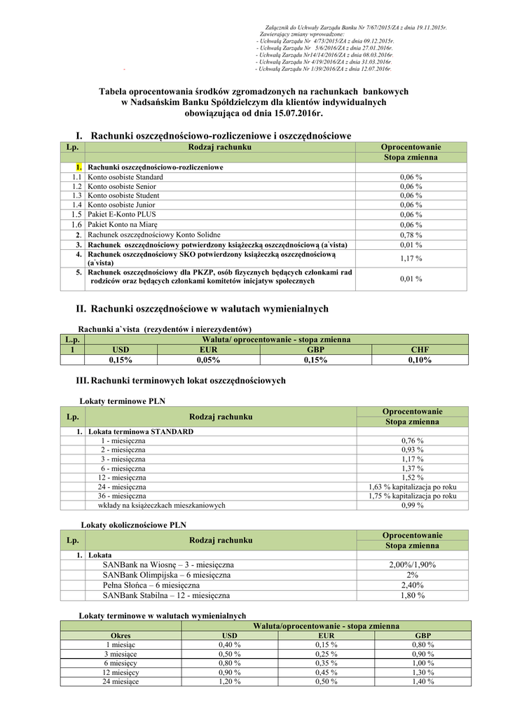 Załącznik do Uchwały Zarządu Banku Nr 7/67/2015/ZA z dnia 19.11.2015r. Zawierający zmiany wprowadzone: - Uchwałą Zarządu Nr 4/73/2015/ZA z dnia 09.12.2015r. - Uchwałą Zarządu Nr 5/6/2016/ZA z dnia 27.01.2016r. - Uchwałą Zarządu Nr14/14/2016/ZA z dnia 08.03.2016r. - Uchwałą Zarządu Nr 4/19/2016/ZA z dnia 31.03.2016r. - Uchwałą Zarządu Nr 1/39/2016/ZA z dnia 12.07.2016r. - Tabela oprocentowania środków zgromadzonych na rachunkach bankowych w Nadsańskim Banku Spółdzielczym dla klientów indywidualnych obowiązująca od dnia 15.07.2016r. I. Rachunki oszczędnościowo-rozliczeniowe i oszczędnościowe Lp. Rodzaj rachunku 1. 1.1 1.2 1.3 1.4 1.5 1.6 2. 3. 4. 5. Oprocentowanie Stopa zmienna Rachunki oszczędnościowo-rozliczeniowe Konto osobiste Standard Konto osobiste Senior Konto osobiste Student Konto osobiste Junior Pakiet E-Konto PLUS Pakiet Konto na Miarę Rachunek oszczędnościowy Konto Solidne Rachunek oszczędnościowy potwierdzony książeczką oszczędnościową (a’vista) Rachunek oszczędnościowy SKO potwierdzony książeczką oszczędnościową (a’vista) Rachunek oszczędnościowy dla PKZP, osób fizycznych będących członkami rad rodziców oraz będących członkami komitetów inicjatyw społecznych 0,06 % 0,06 % 0,06 % 0,06 % 0,06 % 0,06 % 0,78 % 0,01 % 1,17 % 0,01 % II. Rachunki oszczędnościowe w walutach wymienialnych Rachunki a`vista (rezydentów i nierezydentów) L.p. Waluta/ oprocentowanie - stopa zmienna 1 USD EUR GBP 0,15% 0,05% 0,15% CHF 0,10% III. Rachunki terminowych lokat oszczędnościowych Lokaty terminowe PLN Lp. Oprocentowanie Stopa zmienna Rodzaj rachunku 1. Lokata terminowa STANDARD 1 - miesięczna 2 - miesięczna 3 - miesięczna 6 - miesięczna 12 - miesięczna 24 - miesięczna 36 - miesięczna wkłady na książeczkach mieszkaniowych 0,76 % 0,93 % 1,17 % 1,37 % 1,52 % 1,63 % kapitalizacja po roku 1,75 % kapitalizacja po roku 0,99 % Lokaty okolicznościowe PLN Lp. Oprocentowanie Stopa zmienna Rodzaj rachunku 1. Lokata SANBank na Wiosnę – 3 - miesięczna SANBank Olimpijska – 6 miesięczna Pełna Słońca – 6 miesięczna SANBank Stabilna – 12 - miesięczna 2,00%/1,90% 2% 2,40% 1,80 % Lokaty terminowe w walutach wymienialnych Waluta/oprocentowanie - stopa zmienna Okres 1 miesiąc 3 miesiące 6 miesięcy 12 miesięcy 24 miesiące USD 0,40 % 0,50 % 0,80 % 0,90 % 1,20 % EUR 0,15 % 0,25 % 0,35 % 0,45 % 0,50 % GBP 0,80 % 0,90 % 1,00 % 1,30 % 1,40 % IV. Produkty wycofane z oferty Banku Rachunki oszczędnościowo-rozliczeniowe i oszczędnościowe Rodzaj rachunku 1. 1.1 1.2 1.3 Oprocentowanie Stopa zmienna Rachunki oszczędnościowo-rozliczeniowe E-Konto osobiste Rachunek oszczędnościowy Konto osobiste ZYSK Konto osobiste VIP 0,06 % 1,91 % 0,06 % Rachunki terminowych lokat oszczędnościowych - STANDARD dla osób fizycznych Rodzaj rachunku 1. 9- miesięczna Oprocentowanie Stopa zmienna 1,49 % Rachunki terminowych lokat oszczędnościowych – okolicznościowych Lp. Rodzaj rachunku 1. Lokata SANBank z Zajączkiem 2. 3. 4. 5. 6. 7. 8. 9. 10. 11. 12. 13. 14. 15. 16. 17. 18. 19. 20. Lokata Noworoczna Lokata Dobry Zysk Lokata SANBank Lider Lokata SANBank e-Zysk Lokata SANBank Max Lokata SANBank Gwiazdka Lokata SANBank Gwiazdka Plus Lokata SANBank e-Zysk Plus Lokata SANBank z uśmiechem Lokata SANBank Brązowa Lokata Mikołajkowa Lokata SANBank Walentynkowa Lokata SANBank Wielkanocna Lokata SANBank Profit Lokata SANBank Profit Lokata SANBank Prestige Lokata SANBank Express Lokata SANBank Trafiony Zysk Lokata SANBank Mocno Pracująca 21. 22. 23. 24. 25. 26. 27. 28. 29. 30. 31. 32. 33. 34. 35. 36. 37. 38. 39. 40. 41. 42. Lokata Jubileuszowa Lokata Oszczędzaj z Jubilatem Lokata Zysk dla Ciebie Lokata Lato z Bankiem Lokata Jesień z Polskim Bankiem Lokata Słoneczna Plus Lokata Świąteczna Lokata Wiosenna Lokata Szybki Zysk Lokata Jesień z Polskim Bankiem Lokata SANBank MAX Lokata SANBank na wakacje Lokata SANBank Srebrna Lokata SANBank Bogata Lokata SANBank Kapitalna Lokata SANBank Kapitalna Lokata SANBank Pewny Zysk Lokata SANBank Celująca Lokata SANBank e-Celująca Lokata SANBank Optymalna Lokata SANBank Diamentowa Lokata SANBank e-Diamentowa Okres obowiązywania oferty od Lokaty 2 - miesięczne 2012-03-11 Lokaty 3 - miesięczne 2007-12-03 2007-08-20 2011-09-07 2012-03-15 2012-03-29 2012-11-27 2012-11-27 2013-04-15 2013-04-15 2013-09-02 2013-12-02 2014-02-11 2014-04-01 2014-05-15 2015-03-11 2015-05-18 2015-08-04 2015-10-20 2016-02-01 do 2013-04-15 Oprocentowanie Stopa stała / zmienna 4,00% 2008-01-31 2007-09-30 2012-02-06 2013-04-12 2012-06-15 2012-12-31 2012-12-31 2013-06-07 2013-06-07 2014-02-11 2013-12-31 2014-03-27 2014-05-12 2015-03-10 2015-05-18 2015-08-03 2015-10-19 2016-01-30 2016-03-10 3,35% 3,35% 3,35%/5,75% 3,35%/4,20% 3,35%/5,50% 5,80% 6,00% 3,90% 3,80% 2,50% 3,5%/3,7% 3,00%/3,20% 2,90%/3,00% 2,80%/2,90% 2,40%/2,90% 2,20%/2,40% 2,20%/2,00% 2,0%/1,80% 1,90 % / 1,70 % 2007-02-05 2007-12-31 2008-04-30 2008-09-15 2008-11-30 2009-08-31 2010-01-31 2010-05-31 2010-09-15 2010-12-20 2012-06-15 2013-09-02 2014-02-11 2014-05-12 2015-03-10 2015-05-18 2015-07-07 2015-08-17 2015-11-19 2015-10-19 2015-12-12 2015-12-12 3,55%/3,10% 3,55% 3,55% 3,55%/5,10% 3,55% 3,55% 3,55%/4,60% 3,55% 3,55% 3,55% 3,55%/5,50% 3,30% 2,70% 3,10%/3,40% 3,00%/3,10% 2,50%/3,10% 2,40%/2,60% 2,30%/2,45% 2,35% 2,15%/2,30% 2,20%/2,10% 2,25% Lokaty 6 - miesięczne 2006-12-01 2007-07-11 2008-01-30 2008-06-12 2008-10-08 2009-07-13 2009-12-07 2010-04-08 2010-07-29 2010-10-20 2012-04-12 2013-06-08 2013-09-02 2014-02-11 2014-05-15 2015-03-11 2015-05-18 2015-07-08 2015-07-08 2015-08-18 2015-10-20 2015-10-20 43. 44. 45. 46. Lokata SANBank Zimowa Lokata SANBank Tradycyjna Lokata Kwitnący Zysk Lokata SANBank e-Zimowa 47. 48. 49. 50. 51. 52. 53. 54. 55. 56. 57. 58. 59. 60. Lokata Jesień z Polskim Bankiem Lokata Słońce przez cały rok Autolokata Lokata Magia Świąt Lokata SANBank Premium Lokata SANBank Plus Autolokata SANBank Lokata SANBank Złota Lokata SANBank Złota