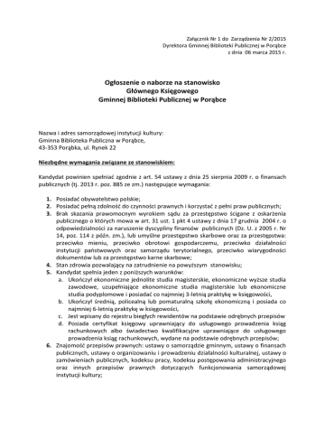 Załącznik Nr 1 do Zarządzenia Nr 2/2015 Dyrektora Gminnej Biblioteki Publicznej w Porąbce z dnia 06 marca 2015 r. Ogłoszenie o naborze na stanowisko Głównego Księgowego Gminnej Biblioteki Publicznej w Porąbce Nazwa i adres samorządowej instytucji kultury: Gminna Biblioteka Publiczna w Porąbce, 43-353 Porąbka, ul. Rynek 22 Niezbędne wymagania związane ze stanowiskiem: Kandydat powinien spełniad zgodnie z art. 54 ustawy z dnia 25 sierpnia 2009 r. o finansach publicznych (tj. 2013 r. poz. 885 ze zm.) następujące wymagania: 1. Posiadad obywatelstwo polskie; 2. Posiadad pełną zdolnośd do czynności prawnych i korzystad z pełni praw publicznych; 3. Brak skazania prawomocnym wyrokiem sądu za przestępstwo ścigane z oskarżenia publicznego o których mowa w art. 31 ust. 1 pkt 4 ustawy z dnia 17 grudnia 2004 r. o odpowiedzialności za naruszenie dyscypliny finansów publicznych (Dz. U. z 2005 r. Nr 14, poz. 114 z późn. zm.), lub umyślne przestępstwo skarbowe oraz za przestępstwa: przeciwko mieniu, przeciwko obrotowi gospodarczemu, przeciwko działalności instytucji paostwowych oraz samorządu terytorialnego, przeciwko wiarygodności dokumentów lub za przestępstwo karne skarbowe; 4. Stan zdrowia pozwalający na zatrudnienie na powyższym stanowisku; 5. Kandydat spełnia jeden z poniższych warunków: a. Ukooczył ekonomiczne jednolite studia magisterskie, ekonomiczne wyższe studia zawodowe, uzupełniające ekonomiczne studia magisterskie lub ekonomiczne studia podyplomowe i posiadad co najmniej 3-letnią praktykę w księgowości, b. Ukooczył średnią, policealną lub pomaturalną szkołę ekonomiczną i posiada co najmniej 6-letnią praktykę w księgowości, c. Jest wpisany do rejestru biegłych rewidentów na podstawie odrębnych przepisów d. Posiada certyfikat księgowy uprawniający do usługowego prowadzenia ksiąg rachunkowych albo świadectwo kwalifikacyjne uprawniające do usługowego prowadzenia ksiąg rachunkowych, wydane na podstawie odrębnych przepisów; 6. Znajomośd przepisów prawnych: ustawy o samorządzie gminnym, ustawy o finansach publicznych, ustawy o organizowaniu i prowadzeniu działalności kulturalnej, ustawy o zamówieniach publicznych, kodeksu pracy, kodeksu postępowania administracyjnego oraz innych przepisów prawnych dotyczących funkcjonowania samorządowej instytucji kultury; Wymagania dodatkowe związane z zatrudnieniem na stanowisko, na które przeprowadzany jest nabór: 1. Umiejętnośd obsługi komputera (Word, Excel, Internet), programów księgowych oraz sprzętu biurowego; 2. Znajomośd gospodarki finansowej instytucji kultury, dyscypliny finansów publicznych, planu kont, księgowości i klasyfikacji budżetowej; 3. Znajomośd przepisów z zakresu ubezpieczeo społecznych i prawa podatkowego; 4. Umiejętnośd pracy w zespole, odpowiedzialnośd, sumiennośd i rzetelnośd, dobra organizacja czasu pracy; 5. Umiejętnośd organizacji pracy; 6. Dyspozycyjnośd, komunikatywnośd, kreatywnośd i odpornośd na stres. Zakres obowiązków wykonywanych na stanowisku głównego księgowego: 1. Prowadzenie rachunkowości Gminnej Biblioteki Publicznej w Porąbce zgodnie z obowiązującymi przepisami; 2. Wykonywanie dyspozycji środkami pieniężnymi z rachunku instytucji kultury; 3. Sporządzanie niezbędnych dla bieżącego zarządzania przez Dyrektora instytucji kultury sprawozdao kwartalnych o realizacji planu finansowego; 4. Przygotowywanie projektów budżetu instytucji kultury oraz harmonogramu wydatków oraz współpraca z Dyrektorem przy ustalaniu planu finansowego instytucji kultury; 5. Naliczania wynagrodzeo pracowniczych, zaliczek podatkowych, składek na ubezpieczenie społeczne i zdrowotne, potrąceo oraz terminowości ich przekazywania; 6. Nadzorowanie, przygotowanie i realizacja umów o pracę i umów cywilnoprawnych i prowadzenie ich obsługi księgowej; 7. Dokonywanie wstępnej kontroli zgodności operacji gospodarczych i finansowych z planem finansowym instytucji kultury, kompletności i rzetelności dokumentów dotyczących operacji gospodarczych i finansowych; 8. Prowadzenie ewidencji księgowej wyposażenia, sprzętu oraz innych wartości rzeczowych, środków trwałych ich umorzenia zgodnie z obowiązującymi przepisami; 9. Opracowanie dokumentów regulujących organizację rachunkowości w instytucjach kultury; 10. Znajomośd planu kont, instrukcji obiegu dokumentów, instrukcji kasowej, instrukcji inwentaryzacji i innych zarządzeo wewnętrznych regulujących funkcjonowanie gospodarki finansowej instytucji kultury; 11. Obliczanie podatku dochodowego od osób prawnych oraz sporządzanie deklaracji tego podatku; 12. Obliczanie podatku dochodowego od osób fizycznych oraz sporządzanie deklaracji tego podatku; 13. Obsługa programu przeznaczonego do sporządzania, rozliczania i przesyłania drogą elektroniczną dokumentacji do ZUS i Urzędu Skarbowego; 14. Rozliczanie pozyskanych środków finansowych (w tym unijnych) na cele statutowe Gminnej Biblioteki Publicznej; 15. Wykonywanie innych nie wymienionych wyżej zadao, które z mocy prawa lub przepisów wewnętrznych wydanych przez Dyrektora jednostki należą do obowiązków Głównego Księgowego. Wymagane dokumenty: 1. 2. 3. 4. 5. CV; Kopia dokumentu potwierdzającego obywatelstwo polskie (dowód osobisty); List motywacyjny; Kserokopie świadectw pracy; Potwierdzone za zgodnośd z oryginałem kserokopie dyplomów potwierdzających wykształcenie i kwalifikacje; 6. Kwestionariusz osobowy dla osoby ubiegającej się o zatrudnienie; 7. Aktualne oświadczenie kandydata o korzystaniu z pełni praw publicznych; 8. Aktualne zaświadczenie o niekaralności z Krajowego Rejestru Karnego lub oświadczenie o braku skazania prawomocnym wyrokiem sądu za przestępstwo ścigane z oskarżenia publicznego lub umyślne przestępstwo skarbowe oraz za przestępstwa: przeciwko mieniu, przeciwko obrotowi gospodarczemu, przeciwko działalności instytucji paostwowych oraz samorządu 