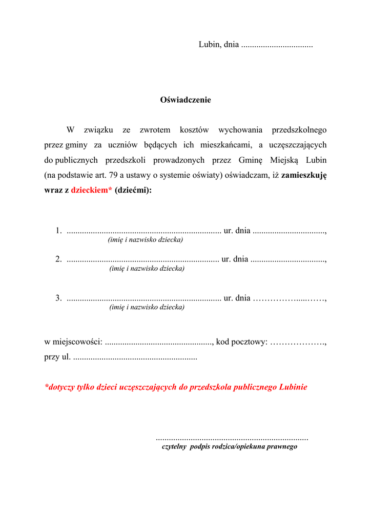 Lubin, dnia ................................. Oświadczenie W związku ze zwrotem kosztów wychowania przedszkolnego przez gminy za uczniów będących ich mieszkańcami, a uczęszczających do publicznych przedszkoli prowadzonych przez Gminę Miejską Lubin (na podstawie art. 79 a ustawy o systemie oświaty) oświadczam, iż zamieszkuję wraz z dzieckiem* (dziećmi): 1. ....................................................................... ur. dnia ................................., (imię i nazwisko dziecka) 2. ...................................................................... ur. dnia .................................., (imię i nazwisko dziecka) 3. ....................................................................... ur. dnia …………….....……, (imię i nazwisko dziecka) w miejscowości: ................................................., kod pocztowy: ………………., przy ul. ......................................................... *dotyczy tylko dzieci uczęszczających do przedszkola publicznego Lubinie ...................................................................... czytelny podpis rodzica/opiekuna prawnego