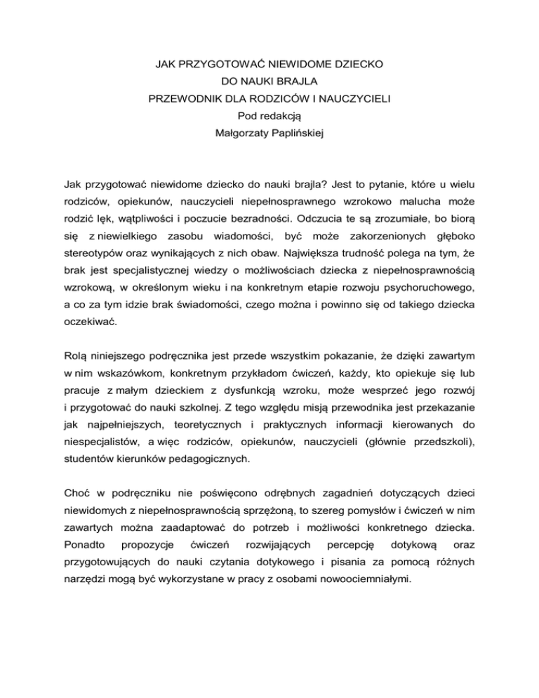 JAK PRZYGOTOWAĆ NIEWIDOME DZIECKO DO NAUKI BRAJLA PRZEWODNIK DLA RODZICÓW I NAUCZYCIELI Pod redakcją Małgorzaty Paplińskiej Jak przygotować niewidome dziecko do nauki brajla? Jest to pytanie, które u wielu rodziców, opiekunów, nauczycieli niepełnosprawnego wzrokowo malucha może rodzić lęk, wątpliwości i poczucie bezradności. Odczucia te są zrozumiałe, bo biorą się z niewielkiego zasobu wiadomości, być może zakorzenionych głęboko stereotypów oraz wynikających z nich obaw. Największa trudność polega na tym, że brak jest specjalistycznej wiedzy o możliwościach dziecka z niepełnosprawnością wzrokową, w określonym wieku i na konkretnym etapie rozwoju psychoruchowego, a co za tym idzie brak świadomości, czego można i powinno się od takiego dziecka oczekiwać. Rolą niniejszego podręcznika jest przede wszystkim pokazanie, że dzięki zawartym w nim wskazówkom, konkretnym przykładom ćwiczeń, każdy, kto opiekuje się lub pracuje z małym dzieckiem z dysfunkcją wzroku, może wesprzeć jego rozwój i przygotować do nauki szkolnej. Z tego względu misją przewodnika jest przekazanie jak najpełniejszych, teoretycznych i praktycznych informacji kierowanych do niespecjalistów, a więc rodziców, opiekunów, nauczycieli (głównie przedszkoli), studentów kierunków pedagogicznych. Choć w podręczniku nie poświęcono odrębnych zagadnień dotyczących dzieci niewidomych z niepełnosprawnością sprzężoną, to szereg pomysłów i ćwiczeń w nim zawartych można zaadaptować do potrzeb i możliwości konkretnego dziecka. Ponadto propozycje ćwiczeń rozwijających percepcję dotykową oraz przygotowujących do nauki czytania dotykowego i pisania za pomocą różnych narzędzi mogą być wykorzystane w pracy z osobami nowoociemniałymi. Nie można mówić o nauce brajla jako nauczaniu i uczeniu się tylko znaków brajlowskich bez powiązania z innymi obszarami, których opanowanie pośrednio lub bezpośrednio wpływa na naukę czytania i pisania brajlem. Trzeba pamiętać, że umiejętność czytania i pisania brajlem jest możliwa także dzięki nabyciu przez dziecko kompetencji w zakresie analizy i syntezy słuchowej, czy w ogóle pewnej dojrzałości w zakresie percepcji słuchowej i słuchu fonematycznego oraz mowy. Z tego względu dużo miejsca w podręczniku poświęcono całościowemu przygotowaniu niewidomego dziecka do nauki czytania i pisania brajlem. Podręcznik składa się z ośmiu rozdziałów: 1. Brajl i czytanie dotykowe – słów kilka do rodziców i nauczycieli 2. Zanim dziecko pójdzie do szkoły – wsparcie niewidomego dziecka w wieku przedszkolnym w poszczególnych obszarach rozwoju 3. Propozycje zestawów ćwiczeń przygotowujących niewidome dziecko do podjęcia nauki szkolnej 4. Jak przygotować dziecko niewidome do nauki brajla 5. O potrzebie nauczania niewidomych dzieci rysunku 6. Jak uczyć niewidome dziecko czytania wypukłego rysunku i rysowania – wskazówki dla nauczycieli i rodziców 7. Katalog pomocy rozwijających percepcję dotykową i wspomagających naukę brajla – jak zrobić i ciekawie wykorzystać pomoce dydaktyczne 8. Literatura dla rodziców i nauczycieli przydatna w pracy z małym niewidomym dzieckiem (dostępna w języku polskim). Przewodnik wskazuje, jak wśród gąszczu informacji i zjawisk znaleźć drogę harmonijnego rozwoju dziecka. Zatem do Ciebie Rodzicu, Nauczycielu, Studencie kierunków pedagogicznych skierowany jest ten przewodnik. (Jak przygotować niewidome dziecko do nauki brajla - ze wstępu)