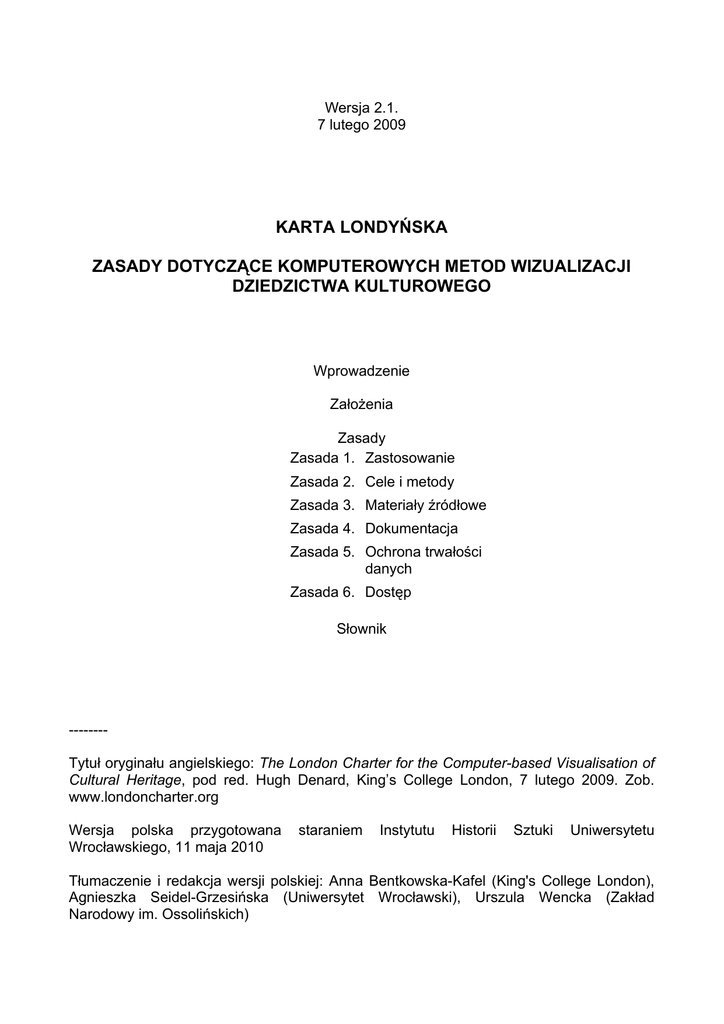 Wersja 2.1. 7 lutego 2009 KARTA LONDYŃSKA ZASADY DOTYCZĄCE KOMPUTEROWYCH METOD WIZUALIZACJI DZIEDZICTWA KULTUROWEGO Wprowadzenie Założenia Zasady Zasada 1. Zastosowanie Zasada 2. Cele i metody Zasada 3. Materiały źródłowe Zasada 4. Dokumentacja Zasada 5. Ochrona trwałości danych Zasada 6. Dostęp Słownik -------Tytuł oryginału angielskiego: The London Charter for the Computer-based Visualisation of Cultural Heritage, pod red. Hugh Denard, King’s College London, 7 lutego 2009. Zob. www.londoncharter.org Wersja polska przygotowana Wrocławskiego, 11 maja 2010 staraniem Instytutu Historii Sztuki Uniwersytetu Tłumaczenie i redakcja wersji polskiej: Anna Bentkowska-Kafel (King's College London), Agnieszka Seidel-Grzesińska (Uniwersytet Wrocławski), Urszula Wencka (Zakład Narodowy im. Ossolińskich) Wprowadzenie Metody komputerowej wizualizacji są obecnie szeroko stosowane zarówno w naukowym badaniu zabytków, jak też w dziedzinie ochrony i popularyzacji wiedzy o dziedzictwie kulturowym. W tej sytuacji wydaje się konieczne sformułowanie zasad, które przyczyniłyby się – tak w aspekcie intelektualnym, jak i technicznym – do podniesienia naukowej rangi cyfrowych wizualizacji zabytków, aby były one traktowane tak samo jak tradycyjne metody badań i formy prezentacji ich wyników. Jednocześnie zasady te powinny odzwierciedlać istotne właściwości metod i technik wizualizacji komputerowych. W licznych opracowaniach i dokumentach, w tym AHDS Guides to Good Practice for CAD (2002) 1 i Virtual Reality (2002) 2 oraz w ramach takich inicjatyw, jak Virtual Archaeology Special Interest Group (VASIG) 3 i Cultural Virtual Reality Organisation (CVRO) 4 podkreśla się warunek naukowej rzetelności w stosowaniu wizualizacji komputerowych oraz postuluje dbałość o wybór stosownej formy prezentowania wyników badań, odzwierciedlającej rzeczywisty stan wiedzy historycznej. Kwestią zasadniczą jest czytelne rozróżnianie między faktami potwierdzonymi źródłowo, a hipotezami oraz różnicowanie stopnia prawdopodobieństwa formułowanych tez. Karta Londyńska stanowi próbę wypracowania konsensusu wokół tych zagadnień. Niezbędne jest więc szerokie poparcie tej inicjatywy przez właściwe środowiska naukowe oraz ich gotowość do przyjęcia proponowanych rozwiązań. Podstawowym celem Karty jest więc promowanie wizualizacji dziedzictwa kulturowego opartej na przesłankach naukowych, tak w stosowaniu, jak i ewaluacji metod komputerowych, a tym samym działanie na rzecz uznania tego typu badań, a także sposobów upowszechniania ich wyników. Autorzy Karty Londyńskiej zdają sobie sprawę, że zakres dostępnych metod wizualizacji komputerowych i ich wykorzystywania w badaniach naukowych stale się rozszerza. Dlatego intencją Karty nie jest narzucanie specyficznych celów i metod badawczych, ale sformułowanie ogólnych zasad stosowania wizualizacji komputerowych w badaniach i popularyzacji wiedzy o dziedzictwie kulturowym, które przyczynią się do zwiększenia wiarygodności historycznej, spójności merytorycznej i przejrzystości przyjętych metod interpretacyjnych oraz uzyskiwanych dzięki nim wyników. Karta Londyńska dotyczy zagadnień z zakresu badań nad zabytkami i upowszechniania wiedzy o dziedzictwie kulturowym w środowiskach akademickich i muzealniczych oraz w edukacji i obszarze działań komercyjnych. Dotyczy zatem tych dziedzin przemysłu 1 Harrison Eiteljorg II, Kate Fernie, Jeremy Huggett et al., “CAD: A Guide to Good Practice”, Arts and Humanities Data Service (AHDS): Archaeology Data Service, 2002 <http://ads.ahds.ac.uk/project/goodguides/cad/> (4 styczeń 2010). [Wszystkie noty pochodzą od polskiego redaktora]. 2 “Creating and Using Virtual Reality: a Guide for the Arts and Humanities”, red. Kate Fernie i Julian D. Richards, Arts and Humanities Data Service (AHDS), 2002, <http://vads.ahds.ac.uk/guides/vr_guide/> (4 styczeń 2010). 3 Zob. <Scientific Credibility and Authentication in Cultural Virtual Reality and Virtual Archaeology> (4 styczeń 2010). 4 Frischer et al., "From CVR to CVRO. The Past, Present, and Future of Cultural Virtual Reality," by B. Frischer, F. Niccolucci, N. Ryan, J. Barcelò, Proceedings of VAST 2000, pod red. F. Niccolucci, British Archaeological Reports 834 (ArcheoPresss, Oxford, 2002) s. 7-18, <http://www.cvrlab.org/research/images/CVR%20to%20CVRO.pdf> (23 luty 2010). 2 rozrywkowego, które znajdują inspirację w dziedzictwie kulturowym lub korzystają z rekonstrukcji zabytków; nie dotyczy natomiast wizualizacji komputerowych stosowanych dla celów artystycznych, na przykład w sztuce współczesnej, w modzie czy wzornictwie. Ponieważ cele uzasadniające korzystanie z metod wizualizacji komputerowej w obrębie różnych dyscyplin znacząco się od siebie różnią, pierwsza zasada Karty Londyńskiej – "Zastosowanie" - podkreśla konieczność opracowywania szczegółowych zaleceń, odpowiadającym potrzebom danej dyscypliny. Założenia Karta Londyńska proponuje sformułowanie zasad stosowania metod wizualizacji komputerowych i ich wyników w dziedzinie badań naukowych i popularyzacji wiedzy o dziedzictwie kulturowym w celu: - wypracowywania standardów wizualizacji, które zostałyby zaakceptowane przez zainteresowane środowiska badaczy i użytkowników; - upowszechniania intelektualnej i technicznej dyscypliny w dziedzinie cyfrowych wizualizacji dziedzictwa kulturowego; - gwarantowania, że procesy wizualizacji komputerowych i ich wyniki będą prawidłowo rozumiane i oceniane przez odbiorców ; - umożliwiania wiarygodnego wykorzystania wizualizacji komputerowych w analizie, interpretacji i zarządzaniu dobrami dziedzictwa kulturowego; - promowania dbałości o budowanie i stosowanie strategii dotyczących zapewnienia stałego dostępu do danych; - stwarzania stabilnych podstaw, które umożliwią specjalistom różnych dyscyplin określenie szczegółowych zaleceń dotyczących wdrażania Kar