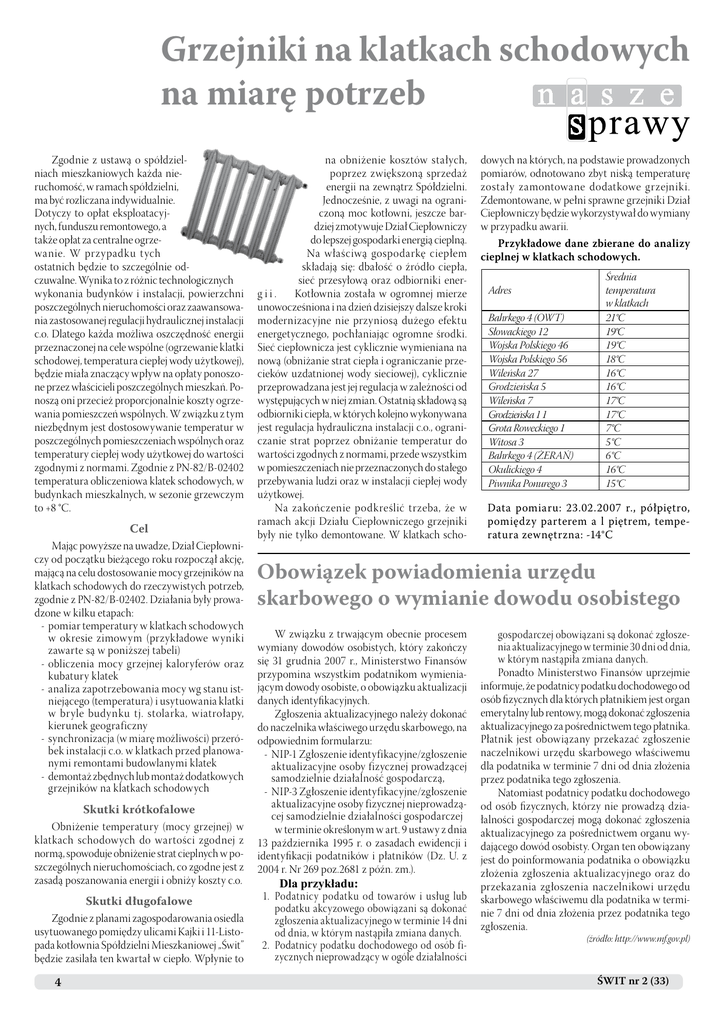 Grzejniki na klatkach schodowych na miarę potrzeb Zgodnie z ustawą o spółdzielniach mieszkaniowych każda nieruchomość, w ramach spółdzielni, ma być rozliczana indywidualnie. Dotyczy to opłat eksploatacyjnych, funduszu remontowego, a także opłat za centralne ogrzewanie. W przypadku tych ostatnich będzie to szczególnie odczuwalne. Wynika to z różnic technologicznych wykonania budynków i instalacji, powierzchni poszczególnych nieruchomości oraz zaawansowania zastosowanej regulacji hydraulicznej instalacji c.o. Dlatego każda możliwa oszczędność energii przeznaczonej na cele wspólne (ogrzewanie klatki schodowej, temperatura ciepłej wody użytkowej), będzie miała znaczący wpływ na opłaty ponoszone przez właścicieli poszczególnych mieszkań. Ponoszą oni przecież proporcjonalnie koszty ogrzewania pomieszczeń wspólnych. W związku z tym niezbędnym jest dostosowywanie temperatur w poszczególnych pomieszczeniach wspólnych oraz temperatury ciepłej wody użytkowej do wartości zgodnymi z normami. Zgodnie z PN-82/B-02402 temperatura obliczeniowa klatek schodowych, w budynkach mieszkalnych, w sezonie grzewczym to +8 °C. Cel Mając powyższe na uwadze, Dział Ciepłowniczy od początku bieżącego roku rozpoczął akcję, mającą na celu dostosowanie mocy grzejników na klatkach schodowych do rzeczywistych potrzeb, zgodnie z PN-82/B-02402. Działania były prowadzone w kilku etapach: - pomiar temperatury w klatkach schodowych w okresie zimowym (przykładowe wyniki zawarte są w poniższej tabeli) - obliczenia mocy grzejnej kaloryferów oraz kubatury klatek - analiza zapotrzebowania mocy wg stanu istniejącego (temperatura) i usytuowania klatki w bryle budynku tj. stolarka, wiatrołapy, kierunek geograficzny - synchronizacja (w miarę możliwości) przeróbek instalacji c.o. w klatkach przed planowanymi remontami budowlanymi klatek - demontaż zbędnych lub montaż dodatkowych grzejników na klatkach schodowych Skutki krótkofalowe Obniżenie temperatury (mocy grzejnej) w klatkach schodowych do wartości zgodnej z normą, spowoduje obniżenie strat cieplnych w poszczególnych nieruchomościach, co zgodne jest z zasadą poszanowania energii i obniży koszty c.o. Skutki długofalowe Zgodnie z planami zagospodarowania osiedla usytuowanego pomiędzy ulicami Kajki i 11-Listopada kotłownia Spółdzielni Mieszkaniowej „Świt” będzie zasilała ten kwartał w ciepło. Wpłynie to 4 na obniżenie kosztów stałych, poprzez zwiększoną sprzedaż energii na zewnątrz Spółdzielni. Jednocześnie, z uwagi na ograniczoną moc kotłowni, jeszcze bardziej zmotywuje Dział Ciepłowniczy do lepszej gospodarki energią cieplną. Na właściwą gospodarkę ciepłem składają się: dbałość o źródło ciepła, sieć przesyłową oraz odbiorniki energii. Kotłownia została w ogromnej mierze unowocześniona i na dzień dzisiejszy dalsze kroki modernizacyjne nie przyniosą dużego efektu energetycznego, pochłaniając ogromne środki. Sieć ciepłownicza jest cyklicznie wymieniana na nową (obniżanie strat ciepła i ograniczanie przecieków uzdatnionej wody sieciowej), cyklicznie przeprowadzana jest jej regulacja w zależności od występujących w niej zmian. Ostatnią składową są odbiorniki ciepła, w których kolejno wykonywana jest regulacja hydrauliczna instalacji c.o., ograniczanie strat poprzez obniżanie temperatur do wartości zgodnych z normami, przede wszystkim w pomieszczeniach nie przeznaczonych do stałego przebywania ludzi oraz w instalacji ciepłej wody użytkowej. Na zakończenie podkreślić trzeba, że w ramach akcji Działu Ciepłowniczego grzejniki były nie tylko demontowane. W klatkach scho- dowych na których, na podstawie prowadzonych pomiarów, odnotowano zbyt niską temperaturę zostały zamontowane dodatkowe grzejniki. Zdemontowane, w pełni sprawne grzejniki Dział Ciepłowniczy będzie wykorzystywał do wymiany w przypadku awarii. Przykładowe dane zbierane do analizy cieplnej w klatkach schodowych. Adres Bahrkego 4 (OWT) Słowackiego 12 Wojska Polskiego 46 Wojska Polskiego 56 Wileńska 27 Grodzieńska 5 Wileńska 7 Grodzieńska 1 1 Grota Roweckiego 1 Witosa 3 Bahrkego 4 (ŻERAŃ) Okulickiego 4 Piwnika Ponurego 3 Średnia temperatura w klatkach 21°C 19°C 19°C 18°C 16°C 16°C 17°C 17°C 7°C 5°C 6°C 16°C 15°C Data pomiaru: 23.02.2007 r., półpiętro, pomiędzy parterem a l piętrem, temperatura zewnętrzna: -14°C Obowiązek powiadomienia urzędu skarbowego o wymianie dowodu osobistego W związku z trwającym obecnie procesem wymiany dowodów osobistych, który zakończy się 31 grudnia 2007 r., Ministerstwo Finansów przypomina wszystkim podatnikom wymieniającym dowody osobiste, o obowiązku aktualizacji danych identyfikacyjnych. Zgłoszenia aktualizacyjnego należy dokonać do naczelnika właściwego urzędu skarbowego, na odpowiednim formularzu: - NIP-1 Zgłoszenie identyfikacyjne/zgłoszenie aktualizacyjne osoby fizycznej prowadzącej samodzielnie działalność gospodarczą, - NIP-3 Zgłoszenie identyfikacyjne/zgłoszenie aktualizacyjne osoby fizycznej nieprowadzącej samodzielnie działalności gospodarczej w terminie określonym w art. 9 ustawy z dnia 13 października 1995 r. o zasadach ewidencji i identyfikacji podatników i płatników (Dz. U. z 2004 r. Nr 269 poz.2681 z późn. zm.). Dla przykładu: 1. Podatnicy podatku od towarów i usług lub podatku akcyzowego obowiązani są dokonać zgłoszenia aktualizacyjnego w terminie 14 dni od dnia, w którym nastąpiła zmiana danych. 2. Podatnicy podatku dochodowego od osób fizycznych nieprowadzący w ogóle działalności gospodarczej obowiązani są dokonać zgłoszenia aktualizacyjnego w terminie 30 dni od dnia, w którym nastąpiła zmiana danych. Ponadto Ministerstwo Finansów uprzejmie informuje, że podatnicy podatku dochodowego od osób fizycznych dla których płatnikiem jest organ emerytalny lub rentowy, mogą dokonać zgłoszenia aktualizacyjnego za pośrednict