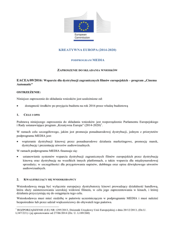 KREATYWNA EUROPA (2014-2020) PODPROGRAM MEDIA ZAPROSZENIE DO SKŁADANIA WNIOSKÓW EACEA/09/2016: Wsparcie dla dystrybucji zagranicznych filmów europejskich – program „Cinema Automatic” OSTRZEŻENIE: Niniejsze zaproszenie do składania wniosków jest uzależnione od: 1. dostępność środków po przyjęciu budżetu na rok 2016 przez władzę budżetową CELE I OPIS Podstawą niniejszego zaproszenia do składania wniosków jest rozporządzenie Parlamentu Europejskiego i Rady ustanawiające program „Kreatywna Europa” (2014-2020)1. W ramach celu szczegółowego, jakim jest promocja ponadnarodowej dystrybucji, jednym z priorytetów podprogramu MEDIA jest: wspieranie dystrybucji kinowej przez ponadnarodowe działania marketingowe, promocję marek, dystrybucję i prezentację utworów audiowizualnych. W ramach podprogramu MEDIA finansuje się: ustanowienie systemów wsparcia dystrybucji zagranicznych filmów europejskich przez dystrybucję kinową oraz dystrybucję na wszelkich innych platformach, a także wsparcia dla międzynarodowej sprzedaży; w szczególności dla przygotowania napisów, dubbingu oraz opisu dźwiękowego utworów audiowizualnych. 2. KWALIFIKUJĄCY SIĘ WNIOSKODAWCY Wnioskodawcą mogą być wyłącznie europejscy dystrybutorzy kinowi prowadzący działalność handlową, która służy zainteresowaniu szerokiej widowni filmem, w celu jego zaprezentowania w kinach, i której działania przyczyniają się do osiągnięcia tego celu. Wnioskodawca musi mieć siedzibę w państwie uczestniczącym w podprogramie MEDIA i musi należeć bezpośrednio lub przez udział większościowy do obywateli tego państwa. 1 ROZPORZĄDZENIE (UE) NR 1295/2013, Dziennik Urzędowy Unii Europejskiej z dnia 20/12/2013, (Dz.U. L347/221) i jej sprostowanie od 27/06/2014 (Dz. U. L189/260) Wnioski pochodzące z niżej wymienionych państw są kwalifikowalne, o ile spełnione są warunki, o których mowa w art. 8 rozporządzenia ustanawiającego program „Kreatywna Europa”, a Komisja rozpoczęła z danym państwem negocjacje: − państwa członkowskie UE; − państwa przystępujące i kandydujące do Unii oraz potencjalne państwa kandydujące korzystające ze strategii przedakcesyjnej, zgodnie z ogólnymi zasadami i warunkami ich uczestnictwa w programach unijnych ustanowionymi odpowiednimi umowami ramowymi, decyzjami rady stowarzyszenia lub podobnymi umowami; − państwa EFTA będące członkami EOG, zgodnie z postanowieniami Porozumienia EOG; − Konfederacja Szwajcarska, na podstawie umowy dwustronnej, która zostanie zawarta z tym państwem; − Państwa objęte Europejską Polityką Sąsiedztwa, zgodnie z procedurami ustalonymi wspólnie z tymi państwami po zawarciu umów ramowych dotyczących ich uczestnictwa w programach unijnych. Program jest także otwarty dla dwustronnych lub wielostronnych działań w ramach współpracy, ukierunkowanych na wybrane państwa lub regiony w oparciu o dodatkowe środki wpłacone przez te państwa lub regiony oraz uregulowania szczególne, które mają być ustalone z tymi państwami lub regionami. Program umożliwia współpracę i wspólne działania z państwami, które nie biorą w nim udziału, oraz z organizacjami międzynarodowymi działającymi w sektorze kultury i sektorze kreatywnym, takimi jak UNESCO, Rada Europy, Organizacja Współpracy Gospodarczej i Rozwoju lub Światowa Organizacja Własności Intelektualnej w oparciu o wspólnie wniesiony wkład na realizację celów programu. Wnioski pochodzące z państw nienależących do UE mogą zostać wybrane, pod warunkiem że w dniu przyjęcia decyzji o przyznaniu finansowania podpisane już będą umowy określające warunki udziału tych państw w programie ustanowionym wyżej przywołanym rozporządzeniem. 3. DZIAŁANIA KWALIFIKOWALNE Program Cinema Automatic jest realizowany dwuetapowo: 1. Stworzenie funduszu w wysokości proporcjonalnej do liczby płatnych biletów wstępu sprzedanych w okresie referencyjnym (2015 r.) dla zagranicznych filmów europejskich w państwach uczestniczących w podprogramie MEDIA; wysokość funduszu jest ograniczona stałym pułapem na jeden film i korygowana w zależności od państwa. 2. Inwestycja: środki funduszu stworzonego według tych zasad przez dane przedsiębiorstwo muszą być zainwestowane w następujące działania: moduł 1: udział w produkcji zagranicznych filmów europejskich; moduł 2: nabycie praw do dystrybucji – np. za pomocą gwarancji minimalnych - zagranicznych filmów europejskich; lub moduł 3: koszty edycji (kopie, dubbing i napisy), koszty promocji i reklamy zagranicznych filmów europejskich. Wnioski dotyczące inwestycji należy przysyłać do Agencji w terminach określonych w tabeli poniżej. Moduł Daty realizacji projektu 1. Koprodukcja Umowę produkcji należy podpisać nie wcześniej niż 1.8.2016. Umowę dystrybucji należy podpisać nie wcześniej niż 1.8.2016. 2. Gwarancja minimalna 3. Koszty promocji i reklamy Premiera kinowa filmu w danym państwie może się odbyć najwcześniej 1.8.2016, a najpóźniej 1.8.2018. Termin przedstawienia projektu Okres inwestycji kwalifikowalności kosztów W ciągu 3 miesięcy od podpisania Od 1.8.2016 do umowy koprodukcji, najpóźniej do 1.2.2019. 1.8.2017. W ciągu 3 miesięcy od podpisania Od 1.8.2016 do umowy lub umowy licencji 1.2.2019. (akceptowana jest zarówno umowa skrócona, jak i pełna), najpóźniej do 1.8.2017. Najpóźniej w dniu premiery filmu w Od 1.2.2016 do danym państwie, do 1.8.2017. 1.8.2019. Maksymalny czas trwania działania wynosi 30 miesięcy w przypadku modułów 1 i 2 oraz 42 miesiące w przypadku modułu 3. Film musi być w większości wyprodukowany przez producenta lub producentów mających siedzibę w państwach uczestniczących w podprogramie MEDIA, przy czym znaczna część ekipy realizującej film musi pochodzić z tych państw. Film musi być nowo wyprodukowanym utworem fabularnym, animowanym lub dokumentalnym trwającym ponad 60 minut i