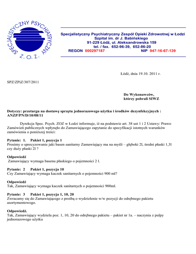 _________________________________________________________ Specjalistyczny Psychiatryczny Zespół Opieki Zdrowotnej w Łodzi Szpital im. dr J. Babińskiego 91-229 Łódź, ul. Aleksandrowska 159 tel. / fax. 652-96-39, 652-86-20 REGON 000297187 NIP 947-16-67-139 _________________________________________________________ Łódź, dnia 19.10. 2011 r. SPZ/ZPiZ/307/2011 Do Wykonawców, którzy pobrali SIWZ Dotyczy: przetargu na dostawę sprzętu jednorazowego użytku i środków dezynfekcyjnych : ANZP/PN/D/10/08/11 Dyrekcja Spec. Psych. ZOZ w Łodzi informuje, iż na podstawie art. 38 ust 1 i 2 Ustawy: Prawo Zamówień publicznych wpłynęło do Zamawiającego zapytanie do specyfikacji istotnych warunków zamówienia o poniższej treści: Pytanie: 1. Pakiet 1, pozycja 1 Prosimy o sprecyzowanie jaki basen sanitarny Zamawiający ma na myśli – głęboki 2l, średni płaski 1,3l czy duży płaski 2l ? Odpowiedź Zamawiający wymaga basenu płaskiego o pojemności 2 l. Pytanie: 2 Pakiet 1, pozycja 10 Czy Zamawiający wymaga kaczek sanitarnych o pojemności 900 ml? Odpowiedź Tak, Zamawiający wymaga kaczek sanitarnych o pojemności 900ml. Pytanie: 3 Pakiet 1, pozycja 1, 10, 20 Zwracamy się do Zamawiającego z prośbą o wydzielenie w/w pozycji do odrębnego pakietu asortymentowego. Odpowiedź. Tak, Zamawiający wydziela poz. 1, 10, 20 do odrębnego pakietu – pakiet nr 1a. – naczynia z pulpy jednorazowego użytku Jednocześnie Zamawiający informuję, iż dokonuje MODYFIKACJI Pakiet nr 1 wyłączając z Pakiet 1A w załączeniu. W związku z tym Zamawiający przedłuża termin składania ofert do dnia 21.10.2011 do godz. 11:30 Termin otwarcia ofert 21.10.2011 o godz. 12:00 L Asortyment p . 1. 2. 3. 4. 5. Kaczka z pulpy celulozowej - pojemność: 900 ml - wymiary: 192 x 113 x 128 mm - odporność na przesiąkanie: 4 godziny Basen płaski z pulpy celulozowej - pojemność: 2 litry - odporność na przesiąkanie: 4 godziny Pokrywa do basenu płaskiego z pulpy celulozowej j.m. Ilość Cena jedn. netto Wartość netto VAT (%) szt. 9150 8 szt. 14 500 8 szt. 14500 23 1000 8 1000 8 Miska nerkowata z pulpy celulozowej szt. - pojemność: 700 ml - odporność na przesiąkanie: 4 godziny Prostokątna miska ogólnego zastosowania z pulpy szt. celulozowej - pojemność 4 litry - nieprzepuszczalna, zachowująca szczelność przez co najmniej 2 godziny, przy użyciu ciepłej wody z detergentem - wymiary: 330 x 255 x 100 mm - dopuszczalna temperatura wody z detergentem: 45 C Wartość brutto
