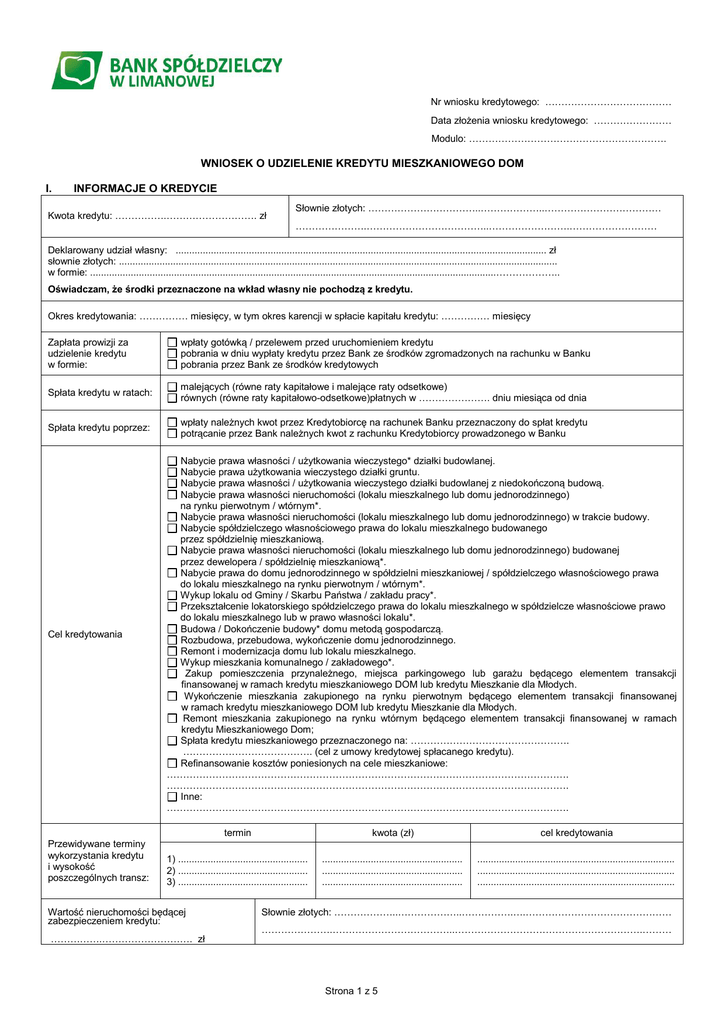 Nr wniosku kredytowego: ………………………………… Data złożenia wniosku kredytowego: …………………… Modulo: ……………………………………………………. WNIOSEK O UDZIELENIE KREDYTU MIESZKANIOWEGO DOM I. INFORMACJE O KREDYCIE Kwota kredytu: …………….………………………. zł Słownie złotych: ……………………………..………………..……………………………… ………………….………………………………..…………………….……………………… Deklarowany udział własny: ......................................................................................................................................... zł słownie złotych: .................................................................................................................................................................. w formie: ......................................................................................................................................................……………….. Oświadczam, że środki przeznaczone na wkład własny nie pochodzą z kredytu. Okres kredytowania: …………… miesięcy, w tym okres karencji w spłacie kapitału kredytu: …………… miesięcy Zapłata prowizji za udzielenie kredytu w formie: wpłaty gotówką / przelewem przed uruchomieniem kredytu pobrania w dniu wypłaty kredytu przez Bank ze środków zgromadzonych na rachunku w Banku pobrania przez Bank ze środków kredytowych Spłata kredytu w ratach: malejących (równe raty kapitałowe i malejące raty odsetkowe) równych (równe raty kapitałowo-odsetkowe)płatnych w …………………. dniu miesiąca od dnia Spłata kredytu poprzez: wpłaty należnych kwot przez Kredytobiorcę na rachunek Banku przeznaczony do spłat kredytu potrącanie przez Bank należnych kwot z rachunku Kredytobiorcy prowadzonego w Banku Cel kredytowania Przewidywane terminy wykorzystania kredytu i wysokość poszczególnych transz: Nabycie prawa własności / użytkowania wieczystego* działki budowlanej. Nabycie prawa użytkowania wieczystego działki gruntu. Nabycie prawa własności / użytkowania wieczystego działki budowlanej z niedokończoną budową. Nabycie prawa własności nieruchomości (lokalu mieszkalnego lub domu jednorodzinnego) na rynku pierwotnym / wtórnym*. Nabycie prawa własności nieruchomości (lokalu mieszkalnego lub domu jednorodzinnego) w trakcie budowy. Nabycie spółdzielczego własnościowego prawa do lokalu mieszkalnego budowanego przez spółdzielnię mieszkaniową. Nabycie prawa własności nieruchomości (lokalu mieszkalnego lub domu jednorodzinnego) budowanej przez dewelopera / spółdzielnię mieszkaniową*. Nabycie prawa do domu jednorodzinnego w spółdzielni mieszkaniowej / spółdzielczego własnościowego prawa do lokalu mieszkalnego na rynku pierwotnym / wtórnym*. Wykup lokalu od Gminy / Skarbu Państwa / zakładu pracy*. Przekształcenie lokatorskiego spółdzielczego prawa do lokalu mieszkalnego w spółdzielcze własnościowe prawo do lokalu mieszkalnego lub w prawo własności lokalu*. Budowa / Dokończenie budowy* domu metodą gospodarczą. Rozbudowa, przebudowa, wykończenie domu jednorodzinnego. Remont i modernizacja domu lub lokalu mieszkalnego. Wykup mieszkania komunalnego / zakładowego*. Zakup pomieszczenia przynależnego, miejsca parkingowego lub garażu będącego elementem transakcji finansowanej w ramach kredytu mieszkaniowego DOM lub kredytu Mieszkanie dla Młodych. Wykończenie mieszkania zakupionego na rynku pierwotnym będącego elementem transakcji finansowanej w ramach kredytu mieszkaniowego DOM lub kredytu Mieszkanie dla Młodych. Remont mieszkania zakupionego na rynku wtórnym będącego elementem transakcji finansowanej w ramach kredytu Mieszkaniowego Dom; Spłata kredytu mieszkaniowego przeznaczonego na: …………………………………………. …………………………………. (cel z umowy kredytowej spłacanego kredytu). Refinansowanie kosztów poniesionych na cele mieszkaniowe: ……………………………………………………………………………………………………………. ……………………………………………………………………………………………………………. Inne: ……………………………………………………………………………………………………………. termin kwota (zł) cel kredytowania 1) ................................................ 2) ................................................ 3) ................................................ .................................................... .................................................... .................................................... ......................................................................... ......................................................................... ......................................................................... Wartość nieruchomości będącej zabezpieczeniem kredytu: …………….………………………. zł Słownie złotych: ………………..………………..…………….….……………………………………… ………………….………………………………..………………………………………………….……… Strona 1 z 5 Adres nieruchomości będącej zabezpieczeniem kredytu: Prawne zabezpieczenie spłaty kredytu: hipoteka na nieruchomości; przelew praw (cesja) z umowy ubezpieczenia nieruchomości od ognia i innych zdarzeń losowych w ramach oferty dostępnej w Banku * / oferty dostępnej poza Bankiem *; wskazanie Banku jako uposażonego na wypadek śmierci w umowie ubezpieczenia na życie kredytobiorcy w ramach oferty dostępnej w Banku* / oferty dostępnej poza Bankiem *; weksel własny in blanco wystawiony przez Kredytobiorcę na rzecz Banku wraz z deklaracją wekslową; 