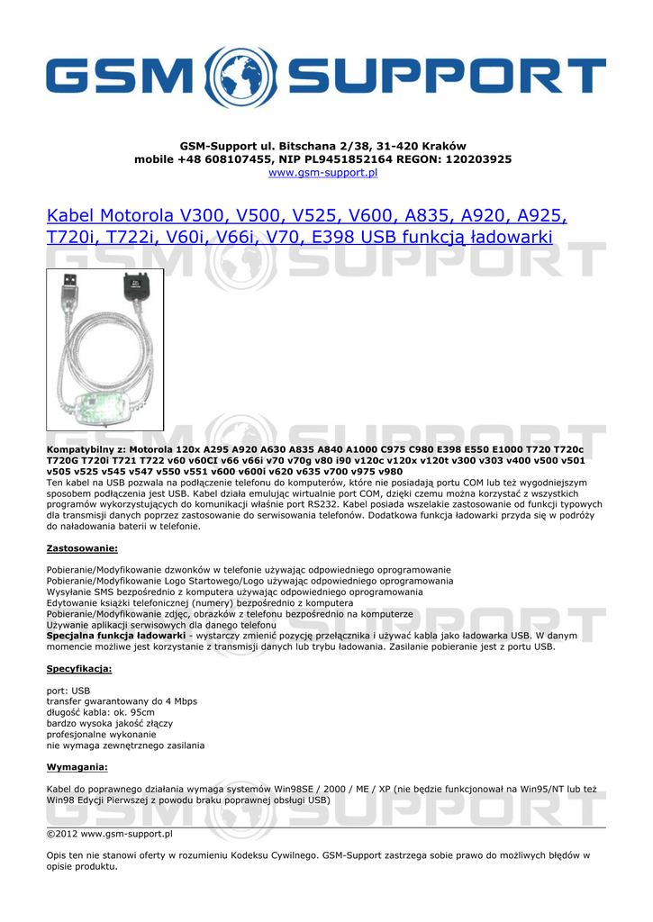 GSM-Support ul. Bitschana 2/38, 31-420 Kraków mobile +48 608107455, NIP PL9451852164 REGON: 120203925 www.gsm-support.pl Kabel Motorola V300, V500, V525, V600, A835, A920, A925, T720i, T722i, V60i, V66i, V70, E398 USB funkcją ładowarki Kompatybilny z: Motorola 120x A295 A920 A630 A835 A840 A1000 C975 C980 E398 E550 E1000 T720 T720c T720G T720i T721 T722 v60 v60CI v66 v66i v70 v70g v80 i90 v120c v120x v120t v300 v303 v400 v500 v501 v505 v525 v545 v547 v550 v551 v600 v600i v620 v635 v700 v975 v980 Ten kabel na USB pozwala na podłączenie telefonu do komputerów, które nie posiadają portu COM lub też wygodniejszym sposobem podłączenia jest USB. Kabel działa emulując wirtualnie port COM, dzięki czemu można korzystać z wszystkich programów wykorzystujących do komunikacji właśnie port RS232. Kabel posiada wszelakie zastosowanie od funkcji typowych dla transmisji danych poprzez zastosowanie do serwisowania telefonów. Dodatkowa funkcja ładowarki przyda się w podróży do naładowania baterii w telefonie. Zastosowanie: Pobieranie/Modyfikowanie dzwonków w telefonie używając odpowiedniego oprogramowanie Pobieranie/Modyfikowanie Logo Startowego/Logo używając odpowiedniego oprogramowania Wysyłanie SMS bezpośrednio z komputera używając odpowiedniego oprogramowania Edytowanie książki telefonicznej (numery) bezpośrednio z komputera Pobieranie/Modyfikowanie zdjęc, obrazków z telefonu bezpośrednio na komputerze Używanie aplikacji serwisowych dla danego telefonu Specjalna funkcja ładowarki - wystarczy zmienić pozycję przełącznika i używać kabla jako ładowarka USB. W danym momencie możliwe jest korzystanie z transmisji danych lub trybu ładowania. Zasilanie pobieranie jest z portu USB. Specyfikacja: port: USB transfer gwarantowany do 4 Mbps długość kabla: ok. 95cm bardzo wysoka jakość złączy profesjonalne wykonanie nie wymaga zewnętrznego zasilania Wymagania: Kabel do poprawnego działania wymaga systemów Win98SE / 2000 / ME / XP (nie będzie funkcjonował na Win95/NT lub też Win98 Edycji Pierwszej z powodu braku poprawnej obsługi USB) ©2012 www.gsm-support.pl Opis ten nie stanowi oferty w rozumieniu Kodeksu Cywilnego. GSM-Support zastrzega sobie prawo do możliwych błędów w opisie produktu. Prosimy o weryfikację z Państwa strony, a w razie wątpliwości o kontakt. GSM-Support ul. Bitschana 2/38 31-420 Kraków POLSKA tel. 608107455 e-mail: [email protected] Powered by TCPDF (www.tcpdf.org)