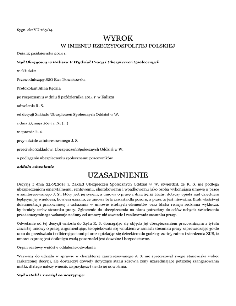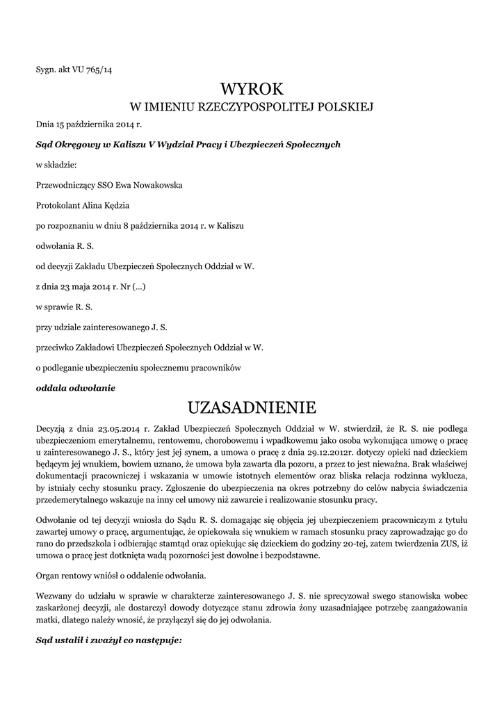 Sygn. akt VU 765/14 WYROK W IMIENIU RZECZYPOSPOLITEJ POLSKIEJ Dnia 15 października 2014 r. Sąd Okręgowy w Kaliszu V Wydział Pracy i Ubezpieczeń Społecznych w składzie: Przewodniczący SSO Ewa Nowakowska Protokolant Alina Kędzia po rozpoznaniu w dniu 8 października 2014 r. w Kaliszu odwołania R. S. od decyzji Zakładu Ubezpieczeń Społecznych Oddział w W. z dnia 23 maja 2014 r. Nr (...) w sprawie R. S. przy udziale zainteresowanego J. S. przeciwko Zakładowi Ubezpieczeń Społecznych Oddział w W. o podleganie ubezpieczeniu społecznemu pracowników oddala odwołanie UZASADNIENIE Decyzją z dnia 23.05.2014 r. Zakład Ubezpieczeń Społecznych Oddział w W. stwierdził, że R. S. nie podlega ubezpieczeniom emerytalnemu, rentowemu, chorobowemu i wpadkowemu jako osoba wykonująca umowę o pracę u zainteresowanego J. S., który jest jej synem, a umowa o pracę z dnia 29.12.2012r. dotyczy opieki nad dzieckiem będącym jej wnukiem, bowiem uznano, że umowa była zawarta dla pozoru, a przez to jest nieważna. Brak właściwej dokumentacji pracowniczej i wskazania w umowie istotnych elementów oraz bliska relacja rodzinna wyklucza, by istniały cechy stosunku pracy. Zgłoszenie do ubezpieczenia na okres potrzebny do celów nabycia świadczenia przedemerytalnego wskazuje na inny cel umowy niż zawarcie i realizowanie stosunku pracy. Odwołanie od tej decyzji wniosła do Sądu R. S. domagając się objęcia jej ubezpieczeniem pracowniczym z tytułu zawartej umowy o pracę, argumentując, że opiekowała się wnukiem w ramach stosunku pracy zaprowadzając go do rano do przedszkola i odbierając stamtąd oraz opiekując się dzieckiem do godziny 20-tej, zatem twierdzenia ZUS, iż umowa o pracę jest dotknięta wadą pozorności jest dowolne i bezpodstawne. Organ rentowy wniósł o oddalenie odwołania. Wezwany do udziału w sprawie w charakterze zainteresowanego J. S. nie sprecyzował swego stanowiska wobec zaskarżonej decyzji, ale dostarczył dowody dotyczące stanu zdrowia żony uzasadniające potrzebę zaangażowania matki, dlatego należy wnosić, że przyłączył się do jej odwołania. Sąd ustalił i zważył co następuje: R. S. na stałe zamieszkuje w P., gdzie prowadziła działalność gospodarczą w zakresie fotografiki i z tego tytułu podlegała ubezpieczeniom społecznym do 11.12.2013r., po czym zakład fotograficzny przekazała córce. Jej syn J. S., zamieszkały w W. jako płatnik składek dokonał zgłoszenia jej do ubezpieczenia z tytułu zatrudnienia na podstawie umowy o pracę w pełnym wymiarze czasu pracy w okresie od 29.12.2012r. do 15.07.2013r. W raportach imiennych rozliczeniowych do ZUS wskazał jako podstawę wymiaru składek za grudzień 2012r. kwotę 1500,00zł, od stycznia do czerwca po 1600zł i za lipiec 2013r. kwotę 800zł. Następnie odwołująca się została zgłoszenia do ubezpieczeń przez Powiatowy Urząd Pracy w P. od 22.07.2013r. do 30.07.2013r. jako osoba bezrobotna bez prawa do zasiłku dla bezrobotnych, a od 31.07.2013r. z prawem do zasiłku. Po rocznym okresie pobierania zasiłku wystąpiła o świadczenie przedemerytalne. J. S. od 01.03.2012r. prowadzi działalność gospodarczą w zakresie sprzedaży ubezpieczeń, rekrutacji, wdrażania i szkolenia nowo pozyskanych osób obecnie dla (...). Prowadzi ją sam, nie zatrudniając pracowników. Zgłoszenie do ubezpieczeń społecznych matki wiązało się z zawarciem z nią umowy o pracę z dnia 29.12.2012r.na czas nieokreślony, z wynagrodzenie 1500zł miesięcznie. Jako miejsce świadczenia pracy wskazano W., a jako przedmiot obowiązków opieka nad dzieckiem. (dowód- kserokopia umowy o prace w aktach ZUS) Praca miała polegać na sprawowaniu opieki nad dzieckiem J. S., odprowadzaniu go do przedszkola na godzinę 8 rano, odbierania o 14,30 i zajmowania się nim do godzin wieczornych, do czasu powrotu ojca do domu. Jak wyjaśnił przed organem rentowym J. S. na czas świadczenia pracy matka zamieszkała w wynajętym pokoju, w mieszkaniu należącym do jego znajomych. Potrzeba jej pomocy przy opiece nad dzieckiem wynikała z problemów zdrowotnych jego żony, a zaangażowanie w tym celu matki miało służyć odseparowaniu jej od środowiska w P. i zapewnienia zajęcia. Jego żona B. S. jest po udarze mózgu w 2001r. i od tego czasu jest leczona psychiatrycznie z powodu zaburzeń depresyjnych. Pobierała rentę z tytułu niezdolności do pracy od 05.10.2001r. do 31.05.2010r., ponownie uzyskała prawo do renty od 1.11.2013r. (dowód- zaświadczenie o stanie zdrowia z 15.01.2013r., kserokopia dokumentacji leczenia i zaświadczenia ZUS Oddział w T.z 29.01.2013. i ZUS Oddział w W.z 05.09.2014r. K: 15- 20) J. S. w dniu 15.07.2013. wystawił świadectwo pracy wskazując jako przyczynę rozwiązania stosunku pracy likwidację stanowiska pracy. (dowód- kserokopia świadectw w aktach ZUS) W postępowaniu przed organem rentowym w wyjaśnieniach z dnia 23.04.2014r. podał natomiast, że po półrocznym okresie pracy matka poinformowała go, że wraca do P.. Z kolei R. S. podała natomiast przed ZUS, że zarejestrowała się w Urzędzie Pracy ze względu na pogarszająca się sytuację finansową syna. Poza sporem jest, że przed zatrudnieniem odwołująca się nie przedstawiła zaświadczenia o zdolności do pracy, nie sporządzono dla niej zakresu obowiązków, nie prowadzono list obecności, wynagrodzenia za pracę nie przekazywano na konto bankowe. Polecenia syna jako pracodawcy sprowadzały się do przekazania planu zajęć dziecka na dany tydzień w celu zaprowadzenia go na ćwiczenia korekcyjne lub na basen. Z zeznań odwołującej się wynika, w czasie pobytu w W. nie mogła zamieszkać z rodziną syna, gdyż zajmują oni jednopokojowe mieszkanie więc nieodpłatnie korzystała z pokoju u znajomych syna, mających dom jednorodzinny. W pokoju tym jednak tylko nocowała, a czas między odprowadzeniem wnuka do przedszkola i jego odebraniem spędzała w mieszkaniu syna wykonując tam prace domowe
