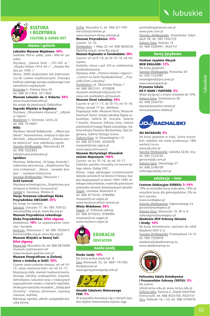 KULTURA I ROZRYWKA CULTURE & GOING OUT muzea i galerie Lubuskie Muzeum Wojskowe: 50% Siedziba: XIX-w. pa³ac, park i 600-m2 pawilon. Wystawy: „Dawna broñ – XVI–XIX w.”, „Wojsko Polskie 1914–45 r.”, „Wojsko Polskie po 1945 r.”. Zbiory: 3000 eksponatów (od œredniowiecza do czasów wspó³czesnych). Znacz¹ca kolekcja ciê¿kiego sprzêtu wojskowego oraz samolotów wojskowych. Drzonów k. Zielonej Góry 45 tel. 068 3211829, 3211856 Muzeum Lubuskie im. J. Dekerta: 50% www.muzeumlubuskie.pl Na wstêp do poni¿szych Oddzia³ów: Zagroda M³yñska w Bogdañcu Wystawy: „Mieszkanie m³ynarza”, „M³ynki w m³ynie”. Bogdaniec k. Gorzowa, Leœna 22 tel. 095 7510007 Willa Wystawy: Henryk Rodakowski – „Album pa³ahicki”, konwisarstwo, wnêtrza w stylu biedermeier, „Sala portretowa”, „Dawna sztuka zdobnicza” oraz zabytkowy ogród. Gorzów Wielkopolski, Warszawska 35 tel. 095 7322843 [email protected] Spichlerz Wystawy: Malarstwo „W krêgu Arsena³u”, malarstwo Jana Korcza, „Wspó³czesna Tkanina Unikatowa”, „Warta – œwiadek dziejów” – wystawa historyczna. Gorzów Wielkopolski, Fabryczna 1 Gród Santocki Wystawa archeologiczna „Osadnictwo pradziejowe w Kotlinie Gorzowskiej”. Santok k. Gorzowa, Wodna 4 Stacja Terenowa Lubuskiego Klubu Przyrodników OWCZARY: 25% Na wstêp na wystawy. Górzyca, Owczary 17, tel. 095 759122 [email protected], www.lkp.org.pl Muzeum Przyrodnicze Lubuskiego Klubu Przyrodników: bilet ulgowy Dodatkowo 10% na wypo¿yczanie rowerów i lornetek. Kostrzyn, Dworcowa 7, tel. 095 7523673 [email protected], www.lkp.org.pl Muzeum Miejskie w Nowej Soli: bilet ulgowy Nowa Sól, Muzealna 20, tel. 068 3873640 [email protected] www.muzeum.gamma.com.pl Muzeum Etnograficzne w Zielonej Górze z siedzib¹ w Ochli: 50% Czynne: sezon jesienno-zimowy: wt–nd 10– 15, sezon wiosenno-letni: wt–nd 10–17. Ekspozycja sta³a: skansen budownictwa ludowego (obiekty wielkopolskie, ³u¿yckie, dolnoœl¹skie, lubuskie) wraz z tradycyjnym wyposa¿eniem wnêtrz z ró¿nych regionów. Atrakcyjne warsztaty muzealne: „Szko³y pod Strzech¹”. Imprezy plenerowe, wystawy czasowe, wyk³ady. Rekreacja: ognisko, pikniki, przeja¿d¿ki bryczk¹ konn¹. Ochla, Muzealna 5, tel. 068 3211591 [email protected] www.muzeum-etnog.zielman.pl Muzeum Przyrodnicze: 25% Czynne: 10–16. Œwiebodzin, 1 Maja 22, tel. 068 3828236 [email protected], www.lkp.org.pl Muzeum Regionalne w Œwiebodzinie: 50% Czynne: wt–pt 9–16, pt–sb 10–16, nd nieczynne. Siedziba: ratusz z po³. XVI w. wielokrotnie przebudowywany. Wystawy sta³e: „Historia miasta i regionu”, „Cystersi na Ziemi Œwiebodziñskiej”, „Przyroda Ziemi Lubuskiej”. Œwiebodzin, pl. Obroñców Pokoju 1 tel. 068 3823101, 4750838 [email protected] www.um.swiebodzin.pl/muzeum Muzeum Ziemi Lubuskiej: 50% Czynne: œr–pt 11–17, sb 10–15, nd 10–16. Zbiory: ponad 17 tys. obiektów. Ekspozycje sta³e: Muzeum Wina, Muzeum Dawnych Tortur, Sztuka sakralna Œl¹ska Lubuskiego, Galeria M. Kruczka, Galeria T. Kuntze, Muzeum Zielonej Góry, Galeria piastowskich ksi¹¿¹t Œl¹ska Lubuskiego, Galeria witra¿y Powalisz-Bardoñskiej, Sala Zegarowa, Galeria Z³otego Grona. Zielona Góra, al. Niepodleg³oœci 15 tel. 068 3272345, 3202678 [email protected] www.zgora.pl/muzeum Muzeum Martyrologii Alianckich Jeñców Wojennych: 100% Czynne: wt–pt 10–16, sb–nd 10–17. Siedziba: pawilon muzealny na terenie by³ego obozu Stalag VIIIC. Zbiory: mapy obrazuj¹ce rozmieszczenie obozów jenieckich na terenie III Rzeszy i krajów okupowanych w latach 1939–1945, fotokopie dokumentów, materia³y procesowe przeciwko winnym dokonywanych zbrodni. ¯agañ, Lotników Alianckich 6 tel. 068 4775333, 4784994 [email protected] www.muzeum.eline2.serwery.pl Wie¿a Widokowa: 50% ¯agañ, pl. Królowej Jadwigi tel. 068 4775333, 4784994 [email protected] www.muzeum.zagan.pl EDUKACJA EDUCATION nauka jazdy [email protected] www.pzm.com.pl Gorzów Wielkopolski, Kosynierów Gdyñskich 78, tel. 095 7202723 Zielona Góra, Wiejska 10 tel. 068 3260491, 4533131 kursy jêzykowe Studium Jêzyków Obcych NEW ENGLAND: 12% Na kursy jêzykowe. Gorzów Wielkopolski, Pomorska 34 tel. 095 7323087 [email protected] www.newengland.pl Prywatna Szko³a DR P. RAHN i PARTNER: 5% Mo¿e siê ³¹czyæ z innymi zni¿kami do 10%. Zielona Góra, Sienkiewicza 36 tel. 068 3243791 [email protected] www.prywatna-szkola.pl JDJ BACHALSKI: 5% Na kursy jêzykowe w kraju. Suma wszystkich rabatów nie mo¿e przekroczyæ 18% wartoœci kursu. www.jdj.com.pl Gorzów Wielkopolski, £okietka 32/33, III p. tel. 095 7224143 [email protected] Zielona Góra, Sikorskiego 27 tel. 068 3246109 [email protected] edukacja – inne Centrum Edukacyjne EUREKA: 5–10% 10% na wszystkie kursy maturalne, 10% na wszystkie kursy dla gimnazjalistów, 5% na kurs rysunku. www.eurekaplus.pl Gorzów Wielkopolski, D¹browskiego 23 [email protected] Zielona Góra, Moniuszki 19, SP nr 6 [email protected] Akademia MSP Ochrony Zdrowia i Urody: 10% Na kursy kosmetyczne; wpisowe do szkó³ Akademii MSP 0 z³. Gorzów Wielkopolski, Przemys³owa 14-15 tel. 095 7354918 [email protected] www.akademiamsp.eu Nauka Jazdy: 10% Na kursy prawa jazdy kat. B. ¯ary, Moniuszki 33, tel. 0601 741592 [email protected] www.gorny.prawojazdy.com.pl Oœrodki Szkolenia Motorowego PZM: 5% W przypadku kumulacji ulg z ró¿nych tytu³ów bêdzie honorowana wy¿sza ulga. Policealna Szko³a Detektywów i Pracowników Ochrony CERTUS: 5% Na czesne. [email protected], www.certus.edu.pl Zielona Góra, Staszica 2, Zespó³ Szkó³ Elektronicznych, tel. 068 4525100, 4525101 ¯ary, Podwale 16, I LO, tel. 068 3743676 63 zakwaterowanie – inne Centrum Nauki i Biznesu ¯AK: 5% Na czesne. Zakres dzia³ania CNiB ¯ak: licea ogólnokszta³c¹ce dla pracuj¹cych, policealne szko³y jednoroczne i 2-letnie, kursy jêzykowe, zawodowe i dokszta³caj¹ce. www.zak.edu.pl Gorzów Wielkopolski, Sikorskiego 8 tel. 095 7352653 [email protecte