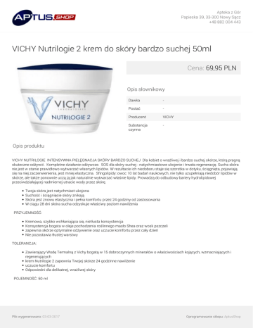 Apteka z Gór Papieska 39, 33-300 Nowy Sącz +48 882 004 443 VICHY Nutrilogie 2 krem do skóry bardzo suchej 50ml Cena: 69,95 PLN Opis słownikowy Dawka - Postać - Producent VICHY Substancja czynna - Opis produktu VICHY NUTRILOGIE INTENSYWNA PIELĘGNACJA SKÓRY BARDZO SUCHEJ Dla kobiet o wrażliwej i bardzo suchej skórze, którą pragną skuteczne odżywić. Kompletne działanie odżywcze. SOS dla skóry suchej - natychmiastowe ukojenie i trwała regenerację. Sucha skóra nie jest w stanie prawidłowo wytwarzać własnych lipidów. W rezultacie ich niedoboru staje się szorstka w dotyku, ściągnięta, pojawiają się na niej zaczerwienienia, jest mniej elastyczna. Sfingolipidy: owoc 10 lat badań naukowych, nie tylko uzupełniają niedobór lipidów w skórze, ale także ponownie uczą ją jak naturalnie wytwarzać właśnie lipidy. Prowadzą do odbudowy bariery hydrolipidowej przeciwdziałającej nadmiernej utracie wody przez skórę. Twoja skóra jest natychmiast ukojona Suchość i ściągnięcie skóry znikają Skóra jest znowu elastyczna i pełna komfortu przez 24 godziny od zastosowania W ciągu 28 dni skóra sucha odzyskuje właściwy poziom nawilżenia PRZYJEMNOŚĆ: Kremowa, szybko wchłaniająca się, nietłusta konsystencja Konsystencja bogata w oleje pochodzenia roślinnego masło Shea oraz wosk pszczeli zapewnia skórze optymalne odżywienie oraz uczucie komfortu przez cały dzień Nie pozostawia tłustej warstwy TOLERANCJA: Zawierający Wodę Termalną z Vichy bogatą w 15 dobroczynnych minerałów o właściwościach kojących, wzmacniających i regenerujących krem Nutrilogie 2 zapewnia Twojej skórze 24 godzinne nawilżenie uczucie komfortu Odpowiedni dla delikatnej, wrażliwej skóry POJEMNOŚĆ: 50 ml Plik wygenerowano: 03-03-2017 Powered by TCPDF (www.tcpdf.org) Oprogramowanie sklepu: AptusShop