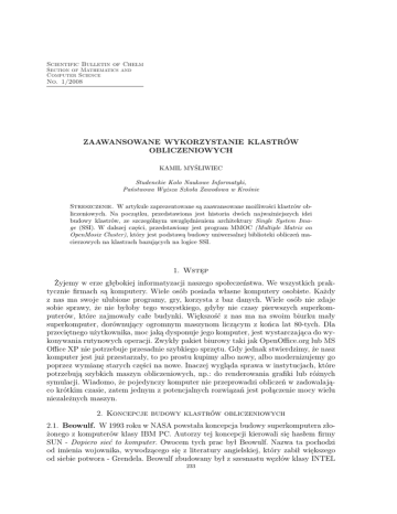 Scientific Bulletin of Chelm Section of Mathematics and Computer Science No. 1/2008 ZAAWANSOWANE WYKORZYSTANIE KLASTRÓW OBLICZENIOWYCH KAMIL MYŚLIWIEC Studenckie Koło Naukowe Informatyki, Państwowa Wyższa Szkoła Zawodowa w Krośnie Streszczenie. W artykule zaprezentowane są zaawansowane możliwości klastrów obliczeniowych. Na początku, przedstawiona jest historia dwóch najważniejszych idei budowy klastrów, ze szczególnym uwzględnieniem architektury Single System Image (SSI). W dalszej części, przedstawiony jest program MMOC (Multiple Matrix on OpenMosix Cluster), który jest podstawą budowy uniwersalnej biblioteki obliczeń macierzowych na klastrach bazujących na logice SSI. 1. Wstęp Żyjemy w erze głębokiej informatyzacji naszego społeczeństwa. We wszystkich praktycznie firmach są komputery. Wiele osób posiada własne komputery osobiste. Każdy z nas ma swoje ulubione programy, gry, korzysta z baz danych. Wiele osób nie zdaje sobie sprawy, że nie byłoby tego wszystkiego, gdyby nie czasy pierwszych superkomputerów, które zajmowały całe budynki. Większość z nas ma na swoim biurku mały superkomputer, dorównujący ogromnym maszynom liczącym z końca lat 80-tych. Dla przeciętnego użytkownika, moc jaką dysponuje jego komputer, jest wystarczająca do wykonywania rutynowych operacji. Zwykły pakiet biurowy taki jak OpenOffice.org lub MS Office XP nie potrzebuje przesadnie szybkiego sprzętu. Gdy jednak stwierdzimy, że nasz komputer jest już przestarzały, to po prostu kupimy albo nowy, albo modernizujemy go poprzez wymianę starych części na nowe. Inaczej wygląda sprawa w instytucjach, które potrzebują szybkich maszyn obliczeniowych, np.: do renderowania grafiki lub różnych symulacji. Wiadomo, że pojedynczy komputer nie przeprowadzi obliczeń w zadowalająco krótkim czasie, zatem jednym z potencjalnych rozwiązań jest połączenie mocy wielu niezależnych maszyn. 2. Koncepcje budowy klastrów obliczeniowych 2.1. Beowulf. W 1993 roku w NASA powstała koncepcja budowy superkomputera złożonego z komputerów klasy IBM PC. Autorzy tej koncepcji kierowali się hasłem firmy SUN - Dopiero sieć to komputer. Owocem tych prac był Beowulf. Nazwa ta pochodzi od imienia wojownika, wywodzącego się z literatury angielskiej, który zabił większego od siebie potwora - Grendela. Beowulf zbudowany był z szesnastu węzłów klasy INTEL 233 234 KAMIL MYŚLIWIEC 486 DX4, które były połączone ze sobą przez 10 megabitową sieć typu Ethernet. Opracowany system okazał się bardzo wydajnym i zarazem tanim rozwiązaniem na tworzenie własnych systemów obliczeń rozproszonych. Po prezentacji Beowulfa nastała era klastrów obliczeniowych, tworzonych z wielu tanich węzłów. Wiele instytucji, które chciały zminimalizować koszty związane z kupnem jednego, firmowego, dużego komputera do zaawansowanych i czasochłonnych obliczeń, skoncentrowało się na budowie własnych systemów rozproszonych. Klastry mógł budować każdy, kto miał co najmniej dwa komputery połączone w jakąkolwiek sieć, dzięki której węzły mogłyby się wymieniać informacjami. Beowulf opierał się na zdalnym wywoływaniu poleceń za pomocą protokołu RSH lub, w nowszych wersjach, za pomocą SSH. W systemie był jeden główny węzeł, tzw. MASTER, z którego można było uruchamiać wszelkie zadania na systemie, który najczęściej posiadał bezpośredni dostęp do zewnętrznej sieci, w odróżnieniu od węzłów SLAVE - rysunek 1. Rysunek 1. Architektura klastra Beowulf Węzły nie musiały mieć żadnych pamięci masowych, kart graficznych i interfejsów I/O - administrowane były zdalnie, przez sieć. Standardowo, każdy komputer pobierał, za pomocą protokołu BOOTP lub DHCP, kopie systemu operacyjnego, następnie jądro montowało za pomocą NFS główne drzewo systemu plików i od tego momentu można było uruchamiać na danym węźle programy. Dane wymieniało się za pomocą podmontowanej partycji NFS, która fizycznie znajdowała się na węźle głównym. Aby wykonać jakikolwiek program, należało skopiować plik wykonywalny do obszaru widocznego przez wszystkie węzły, następnie zbudować skrypt, który uruchamiałby na każdym węźle ten program, a potem wyniki zapisywał do pliku. Na końcu, węzeł główny (MASTER) odczytywał wyniki, łączył je w całość i kończył działanie. ZAAWANSOWANE WYKORZYSTANIE KLASTRÓW OBLICZENIOWYCH ... 235 Po wielu latach powstało wiele bibliotek, które pomagały w komunikacji pomiędzy węzłami, wysyłaniu sygnałów i pobieraniu wyników. Najbardziej znanymi bibliotekami są: - MPI, - PVM. Wymienione oprogramowanie umożliwia bezpośrednie wysyłanie wyników, sygnałów itp. informacji do węzła głównego i węzłów podrzędnych, bez potrzeby zapisu na dysku twardym i tym samym straty wydajności. 2.1.1. MOSIX (oraz OpenMosix). Następną koncepcją systemów klastrowych, nazwaną SSI (Single System Image), był MOSIX (Multicomputer Operating System for UNIX). MOSIX powstał na Uniwersytecie Hebrajskim w Jerozolimie na zlecenie izraelskiego wojska. Miał to być system, w którym nie potrzeba wielkiej znajomości różnych aspektów konfiguracji i użytkowania Beowulfa. Jak sama nazwa wskazuje, MOSIX miał udostępniać Pojedynczy Obraz Systemu i nie posiadał wyróżnionych węzłów, na których można było jedynie inicjować obliczenia. W założeniu MOSIX miał być prostym w konfiguracji systemem klastrowym, na którym każdy znający podstawy systemów UNIX lub Linux, mógłby wykonywać zaawansowane obliczenia. Systemy SSI w swojej budowie są zorientowane właśnie na proste wykonywanie trudnych i pracochłonnych zadań, w przyjazny i prosty sposób. Rysunek 2. Architektura klastra Single System Image Każdy węzeł miał takie same prawa, z każdego można było uruchamiać różne procesy, które następnie były rozprowadzane po klastrze. W odróżnieniu od Beowulfa, MOSIX i jego wolny odpo