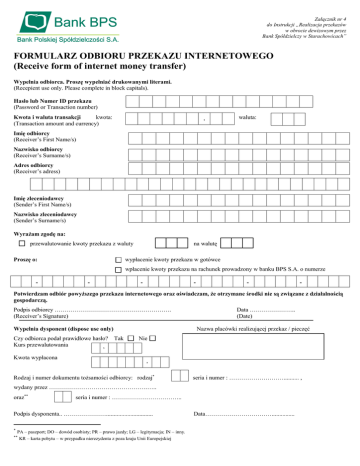 Załącznik nr 4 do Instrukcji „Realizacja przekazów w obrocie dewizowym przez Bank Spółdzielczy w Starachowicach” FORMULARZ ODBIORU PRZEKAZU INTERNETOWEGO (Receive form of internet money transfer) Wypełnia odbiorca. Proszę wypełniać drukowanymi literami. (Recepient use only. Please complete in block capitals). Hasło lub Numer ID przekazu (Password or Transaction number) Kwota i waluta transakcji kwota: (Transaction amount and currency) , waluta: Imię odbiorcy (Receiver’s First Name/s) Nazwisko odbiorcy (Receiver’s Surname/s) Adres odbiorcy (Receiver’s adress) Imię zleceniodawcy (Sender’s First Name/s) Nazwisko zleceniodawcy (Sender’s Surname/s) WyraŜam zgodę na: przewalutowanie kwoty przekazu z waluty Proszę o: na walutę wypłacenie kwoty przekazu w gotówce wpłacenie kwoty przekazu na rachunek prowadzony w banku BPS S.A. o numerze - - - - - - Potwierdzam odbiór powyŜszego przekazu internetowego oraz oświadczam, Ŝe otrzymane środki nie są związane z działalnością gospodarczą. Podpis odbiorcy …………………………………………………. (Receiver’s Signature) Wypełnia dysponent (dispose use only) Czy odbiorca podał prawidłowe hasło? Kurs przewalutowania , Kwota wypłacona Data ………………….. (Date) Nazwa placówki realizującej przekaz / pieczęć Tak Nie , Rodzaj i numer dokumentu toŜsamości odbiorcy: rodzaj∗ seria i numer : ……………………….......... , wydany przez ………………………………………….….. oraz∗∗ seria i numer : …………………………….. Podpis dysponenta.. …………………............................... ∗ PA – paszport; DO – dowód osobisty; PR – prawo jazdy; LG – legitymacja; IN – inny. ∗∗ KR – karta pobytu – w przypadku nierezydenta z poza kraju Unii Europejskiej Data……………………………............... WARUNKI WYKONYWANIA PRZEZ BANK SPÓŁDZIELCZY PRZEKAZÓW INTERNETOWYCH 1. Przez uŜyte w niniejszych Warunkach pojęcia naleŜy rozumieć: 1) Bank – Bank Spółdzielczy w Starachowicach, którego siedziba mieści się pod następującym adresem: 27-200 Starachowice ul. Kilińskiego 1, wpisany do rejestru przedsiębiorców pod numerem KRS 0000145623; 2) Bank BPS SA – Bank Polskiej Spółdzielczości S.A. z siedzibą w Warszawie, ul. Płocka 9/11B, 01-231 Warszawa, e-mail: [email protected], którego dokumentacja jest przechowywana w Sądzie Rejonowym dla m.st. Warszawy, XII Wydział Gospodarczy Krajowego Rejestru Sądowego, wpisanym do rejestru przedsiębiorców pod numerem KRS 0000069229, NIP 896-00-01-959, o kapitale zakładowym 315.331.204,00 zł, który został w pełni wpłacony; 3) dokument toŜsamości – w przypadku odbiorców - rezydentów to dowód osobisty, tymczasowy dowód osobisty lub paszport polski; w przypadku odbiorców - nierezydentów z kraju UE to paszport zagraniczny; w przypadku odbiorców - nierezydentów spoza UE to paszport zagraniczny lub karta pobytu, bądź inny dokument ze zdjęciem wydawany przez Rzeczpospolitą Polską cudzoziemcom, a w przypadku wypłat kwoty będącej równowartością co najmniej 20.000 złotych polskich według kursu średniego NBP obowiązującego w dniu dokonywania wypłaty, dodatkowo, dokument potwierdzający toŜsamość; 4) dokument potwierdzający toŜsamość – inny dokument niŜ dokument toŜsamości, który zawiera fotografię i podstawowe dane osobowe (nazwisko, imię, adres), a mianowicie, m.in.: prawo jazdy, legitymacja ubezpieczeniowa, ksiąŜeczka wojskowa, a w przypadku odbiorców - emerytów i rencistów powyŜej 60 roku Ŝycia jako dokument potwierdzający toŜsamość uznaje się decyzję o waloryzacji świadczenia i odcinek świadczenia oraz w przypadku osób małoletnich legitymację szkolną; 5) firma zlecająca – zagraniczny dostawca usług płatniczych, współpracujący na podstawie stosownych umów z Bankiem BPS SA, z którym Bank realizuje współpracę w zakresie przesłania środków do wypłaty w kasie Banku lub na rachunek bankowy odbiorcy; 6) kurs walutowy – kurs wymiany, wg którego Bank dokonuje przeliczenia walut dostępny w kaŜdej placówce Banku; 7) numer ID przekazu – jednostkowy numer Przekazu Internetowego nadawany przez firmę zlecającą; 8) odbiorca – podmiot będący osobą fizyczną, wskazany na Przekazie Internetowym przez zleceniodawcę/płatnika, upowaŜniony do odbioru środków z Przekazu Internetowego; 9) Przekazy Internetowe - usługa płatnicza przekazów pienięŜnych w walutach obcych: euro (EUR), dolar amerykański (USD), funt brytyjski (GBP), frank szwajcarski (CHF) lub w złotych polskich (PLN), skierowanych do wypłaty w kasie lub na rachunek odbiorcy, wpływających do Banku drogą elektroniczną w formie depesz z firm zlecających za pośrednictwem Banku BPS SA, z którym Bank Realizuje współpracę w tym zakresie; 10) zleceniodawca/płatnik – osoba fizyczna składająca zlecenie przekazania środków pienięŜnych na rzecz wskazanego w treści Przekazu Internetowego odbiorcy, będący rezydentem lub nierezydentem; 11) dzień roboczy – dzień, w którym Bank lub firma zlecająca prowadzi działalność wymaganą do wykonania Przekazu Internetowego; 12) autoryzacja – złoŜenie przez odbiorcę podpisu na Formularzu Odbioru Przekazu Internetowego § 2. Opłaty. 1. Odbiorca nie ponosi opłat z tytułu realizacji Przekazów Internetowych oraz związanych z nimi reklamacji i zwrotów. 2. Bank jest uprawniony do jednostronnej zmiany kursu walutowego. Zmiana nie wymaga uprzedniego zawiadomienia odbiorcy. Zmiany wchodzą w Ŝycie w momencie ogłoszenia Tabeli kursowej. § 3. Warunki realizacji. 1. Przekazy Internetowe wpływające do Banku do godziny 16:00 w danym dniu roboczym są stawiane do dyspozycji odbiorcy w tym samym dniu, z wyjątkiem sytuacji, gdy: 1) Przekaz Internetowy nie zawiera niezbędnych danych do jego realizacji lub dane są sprzeczne bądź niepełne; 2) firma zlecająca nie za