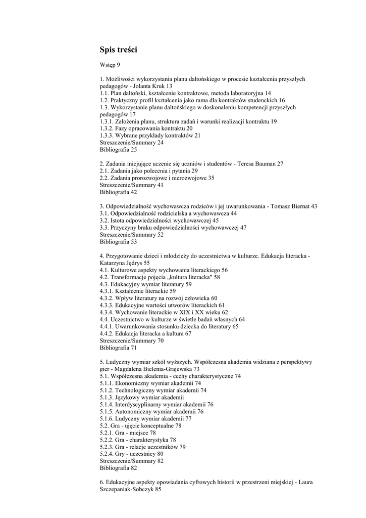 Spis treści Wstęp 9 1. Możliwości wykorzystania planu daltońskiego w procesie kształcenia przyszłych pedagogów - Jolanta Kruk 13 1.1. Plan daltoński, kształcenie kontraktowe, metoda laboratoryjna 14 1.2. Praktyczny profil kształcenia jako rama dla kontraktów studenckich 16 1.3. Wykorzystanie planu daltońskiego w doskonaleniu kompetencji przyszłych pedagogów 17 1.3.1. Założenia planu, struktura zadań i warunki realizacji kontraktu 19 1.3.2. Fazy opracowania kontraktu 20 1.3.3. Wybrane przykłady kontraktów 21 Streszczenie/Summary 24 Bibliografia 25 2. Zadania inicjujące uczenie się uczniów i studentów - Teresa Bauman 27 2.1. Zadania jako polecenia i pytania 29 2.2. Zadania prorozwojowe i nierozwojowe 35 Streszczenie/Summary 41 Bibliografia 42 3. Odpowiedzialność wychowawcza rodziców i jej uwarunkowania - Tomasz Biernat 43 3.1. Odpowiedzialność rodzicielska a wychowawcza 44 3.2. Istota odpowiedzialności wychowawczej 45 3.3. Przyczyny braku odpowiedzialności wychowawczej 47 Streszczenie/Summary 52 Bibliografia 53 4. Przygotowanie dzieci i młodzieży do uczestnictwa w kulturze. Edukacja literacka Katarzyna Jędrys 55 4.1. Kulturowe aspekty wychowania literackiego 56 4.2. Transformacje pojęcia „kultura literacka" 58 4.3. Edukacyjny wymiar literatury 59 4.3.1. Kształcenie literackie 59 4.3.2. Wpływ literatury na rozwój człowieka 60 4.3.3. Edukacyjne wartości utworów literackich 61 4.3.4. Wychowanie literackie w XIX i XX wieku 62 4.4. Uczestnictwo w kulturze w świetle badań własnych 64 4.4.1. Uwarunkowania stosunku dziecka do literatury 65 4.4.2. Edukacja literacka a kultura 67 Streszczenie/Summary 70 Bibliografia 71 5. Ludyczny wymiar szkół wyższych. Współczesna akademia widziana z perspektywy gier - Magdalena Bielenia-Grajewska 73 5.1. Współczesna akademia - cechy charakterystyczne 74 5.1.1. Ekonomiczny wymiar akademii 74 5.1.2. Technologiczny wymiar akademii 74 5.1.3. Językowy wymiar akademii 5.1.4. Interdyscyplinarny wymiar akademii 76 5.1.5. Autonomiczny wymiar akademii 76 5.1.6. Ludyczny wymiar akademii 77 5.2. Gra - ujęcie konceptualne 78 5.2.1. Gra - miejsce 78 5.2.2. Gra - charakterystyka 78 5.2.3. Gra - relacje uczestników 79 5.2.4. Gry - uczestnicy 80 Streszczenie/Summary 82 Bibliografia 82 6. Edukacyjne aspekty opowiadania cyfrowych historii w przestrzeni miejskiej - Laura Szczepaniak-Sobczyk 85 6.1. Pedagogika miejsca 85 6.2. Cyfrowe historie 88 6.3. Technologie mobilne w edukacji 90 Streszczenie/Summary 99 Bibliografia 99 7. Karta pracy - narzędzie w praktyce zawodowej wychowawcy - Katarzyna Krella, Rafał Jan Krause 101 7.1. Pierwsze karty pracy 102 7.2. Karty pracy w dziennej placówce interwencyjnej (DPI) 103 7.3. Znaczenie praktyczne karty pracy w placówce edukacyjno-wychowawczej 106 7.4. Cele krótkoterminowe i długoterminowe w pracy z młodzieżą zagrożoną w Indywidualnym Programie Edukacyjno-Terapeutycznym (IPET) 112 7.5. Jak i kiedy analizować zapisy karty pracy? 114 7.6. Analiza „0÷1", czyli katalogi wychowawcze i przedmiotowe. Bilans otwarcia i zamknięcia 116 Streszczenie/Summary 122 Bibliografia 124 8. Rola szkoły i Związku Ukraińców w Polsce w przekazie kultury narodowej młodemu pokoleniu pomorskich Ukraińców w okresie transformacji ustrojowej - Lidia Burzyńska-Wentland 125 8.1. Nowe wyzwania dla szkolnictwa i Związku Ukraińców w Polsce po 1989 roku 127 8.2. Obchody ważnych rocznic związanych z historią i kulturą narodu ukraińskiego 129 8.3. Formy przekazu kultury narodowej 132 Streszczenie/Summary 135 Bibliografia 136 9. Rola aktywności obywatelskiej w procesie rozwiązywania problemów społecznych Svitlana Lizakowska 139 9.1. Ustalenia i rezultaty 140 9.2. Problem nierówności społecznej w państwie 141 9.3. Główne problemy społeczne związane z rozwojem społeczeństwa obywatelskiego 142 Streszczenie/Summary 150 Bibliografia 151 10. Zjawiska patologii społecznej wśród młodzieży w Polsce - przegląd zagadnień Daria Becker-Pestka 153 10.1. Analiza najważniejszych pojęć 154 10.2. Zjawiska patologii społecznej wśród młodzieży w Polsce 156 Streszczenie/Summary 167 Bibliografia 168 11. Perspektywy polskich uczelni w zakresie kształcenia na rzecz transportu lotniczego Jakub Marszałkiewicz 171 11.1. Perspektywy rozwoju inżynierii lotniczej w Polsce 172 11.2. Potencjalne możliwości wdrażania i rozwoju inżynierii lotniczej na polskich politechnikach 179 Streszczenie/Summary 182 Bibliografia 182 12. Przyczyny i konsekwencje zmieniającej się roli ojca - Magdalena Giers, Jarosław Kowal 185 12.1. Historyczne i kulturowe konteksty wizerunku ojca 186 12.2. Przyczyny dezaktualizacji stereotypu „surowego ojca" 190 12.3. Współczesny ojciec w konflikcie z konserwatywnym społeczeństwem 192 12.4. Potrzeby współczesnych ojców w relacji z dziećmi 194 Streszczenie/Summary 196 Bibliografia 197 13. Diagnostyka edukacyjna w edukacji wczesnoszkolnej - Elżbieta Kowalik 199 13.1. Diagnostyka edukacyjna jako istotna składowa warsztatu pracy nauczyciela 199 13.2. Dziedziny zdobywania informacji o uczniach w edukacji wczesnoszkolnej 200 13.3. Metody diagnostyczne na użytek nauczyciela w edukacji wczesnoszkolnej 202 13.4. Diagnostyka edukacyjna a ocenianie szkolne 205 13.4.1. Ocena opisowa 205 13.4.2. Ocena zachowania 205 13.4.3. Ocenianie wewnątrzszkolne - wspierające ucznia 206 13.4.4. Pomiar dydaktyczny w edukacji wczesnoszkolnej na przykładzie badań OBUT 207 13.5. Opinie uczniów, rodziców i nauczycieli o ocenianiu szkolnym w edukacji wczesnej 208 Streszczenie/Summary 211 Bibliografia 211 14. Pomiar motywacji uczniów wobec środowiska przyrodniczego i zdrowia - Liliana Hoppe 213 14.1. Znaczenie motywacji w edukacji 213 14.2. Metodologiczne podstawy badań własnych. Zastosowane techniki i narzędzia badawcze 215 14.2.1. Kwestionariusz ankiety Moje zachowanie wobec środowiska 215 14.2.2. Kwestionariusz ankiety Moje zachowanie wobec zdrowia 216 14.2.3 Analiza dokumentó