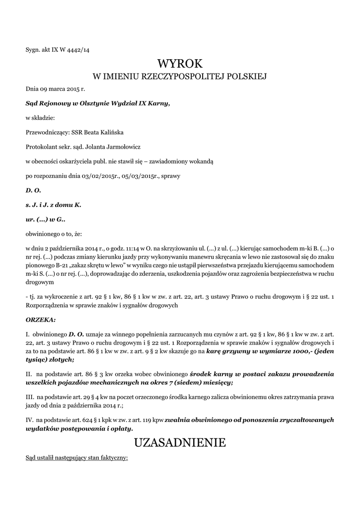 Sygn. akt IX W 4442/14 WYROK W IMIENIU RZECZYPOSPOLITEJ POLSKIEJ Dnia 09 marca 2015 r. Sąd Rejonowy w Olsztynie Wydział IX Karny, w składzie: Przewodniczący: SSR Beata Kalińska Protokolant sekr. sąd. Jolanta Jarmołowicz w obecności oskarżyciela publ. nie stawił się – zawiadomiony wokandą po rozpoznaniu dnia 03/02/2015r., 05/03/2015r., sprawy D. O. s. J. i J. z domu K. ur. (...) w G.. obwinionego o to, że: w dniu 2 października 2014 r., o godz. 11:14 w O. na skrzyżowaniu ul. (...) z ul. (...) kierując samochodem m-ki B. (...) o nr rej. (...) podczas zmiany kierunku jazdy przy wykonywaniu manewru skręcania w lewo nie zastosował się do znaku pionowego B-21 „zakaz skrętu w lewo” w wyniku czego nie ustąpił pierwszeństwa przejazdu kierującemu samochodem m-ki S. (...) o nr rej. (...), doprowadzając do zderzenia, uszkodzenia pojazdów oraz zagrożenia bezpieczeństwa w ruchu drogowym - tj. za wykroczenie z art. 92 § 1 kw, 86 § 1 kw w zw. z art. 22, art. 3 ustawy Prawo o ruchu drogowym i § 22 ust. 1 Rozporządzenia w sprawie znaków i sygnałów drogowych ORZEKA: I. obwinionego D. O. uznaje za winnego popełnienia zarzucanych mu czynów z art. 92 § 1 kw, 86 § 1 kw w zw. z art. 22, art. 3 ustawy Prawo o ruchu drogowym i § 22 ust. 1 Rozporządzenia w sprawie znaków i sygnałów drogowych i za to na podstawie art. 86 § 1 kw w zw. z art. 9 § 2 kw skazuje go na karę grzywny w wymiarze 1000,- (jeden tysiąc) złotych; II. na podstawie art. 86 § 3 kw orzeka wobec obwinionego środek karny w postaci zakazu prowadzenia wszelkich pojazdów mechanicznych na okres 7 (siedem) miesięcy; III. na podstawie art. 29 § 4 kw na poczet orzeczonego środka karnego zalicza obwinionemu okres zatrzymania prawa jazdy od dnia 2 października 2014 r.; IV. na podstawie art. 624 § 1 kpk w zw. z art. 119 kpw zwalnia obwinionego od ponoszenia zryczałtowanych wydatków postępowania i opłaty. UZASADNIENIE Sąd ustalił następujący stan faktyczny: Sąd Rejonowy w Olsztynie wyrokiem z dnia 09 marca 2015r. uznał obwinionego D. O. za winnego tego , w dniu 2 października 2014 r., o godz. 11:14 w O. na skrzyżowaniu ul. (...) z ul. (...) kierując samochodem m-ki B. (...) o nr rej. (...) podczas zmiany kierunku jazdy przy wykonywaniu manewru skręcania w lewo nie zastosował się do znaku pionowego B-21 „zakaz skrętu w lewo” w wyniku czego nie ustąpił pierwszeństwa przejazdu kierującemu samochodem m-ki S. (...) o nr rej. (...), doprowadzając do zderzenia, uszkodzenia pojazdów oraz zagrożenia bezpieczeństwa w ruchu drogowym, tj. popełnienia wykroczeń z art. 92 § 1 kw, 86 § 1 kw w zw. z art. 22, art. 3 ustawy Prawo o ruchu drogowym i § 22 ust. 1 Rozporządzenia w sprawie znaków i sygnałów drogowych i za to skazał go na karę grzywny w wymiarze 1000złotych oraz orzekł zakaz prowadzenia pojazdów mechanicznych w ruchu lądowym na okres 7 miesięcy , zaliczając na poczet orzeczonego środka karnego okres zatrzymania prawa jazdy od dnia 2paździoernika 2014r.i zwolnił obwinionego od ponoszenia kosztów postępowania i opłaty. W przedmiotowej sprawie obwiniony w toku czynności wyjaśniających poddał się dobrowolnie karze grzywny oraz zakazowi prowadzenia pojazdów na okres 12 miesięcy. Na posiedzeniu w dniu 17 grudnia 2014r. obwiniony przy udziale obrońcy z wyboru ,wycofał się z dotychczas proponowanych kar ,wnosząc o cofnięcie środka karnego w postaci zakazu prowadzenia pojazdów mechanicznych .Prawo jazdy zostało obwinionemu zatrzymane w dniu zdarzenia tj. 2.10.2014r. Obwiniony D. O. wykształcenie średnie ,jest studentem I roku studiów dziennych . Pozostaje na utrzymaniu rodziców , niepracującej matki i ojca prowadzącego firmę budowlaną . Jest kawalerem, nie ma nikogo na swoim utrzymaniu .Nie był uprzednio karany. ( dane osobopoznawcze k.64) Z dokonanych w sprawie ustaleń wynika , że w dniu 02października 2014r. obwiniony jechał lewym pasem ul. (...) , pojazdem m-ki B. (...) o nr rej. (...). Zamierzał skręcić w lewo na skrzyżowaniu ul. (...). Nie zastosował się do czytelnego , widocznego oznakowania poziomego i pionowego .Jechał na pamięć ,mimo obowiązywania zakazu skrętu w lewo ,widocznego przekreślenia znaku skrętu w lewo linią żółtą. Obwiniony kontynuował manewr i nie ustąpił pierwszeństwa prawidłowo jadącemu, ul. (...) od centrum w kierunku O. ,pojazdowi m-ki S. (...) nr rej. (...) , kierowanemu przez A. G.. Na miejscu pokrzywdzony poprosił kobietę z pojazdu jadącego z tego samego kierunku ,by była świadkiem w sprawie. Naocznym świadkiem był E. B.. Zdarzenie to zostało również zarejestrowane przez kamery systemu (...). Na skutek kolizji obydwa pojazdy zostały poważnie uszkodzone , rozmiar uszkodzeń został opisany w protokołach oględzin Policji. W następstwie kolizji auto pokrzywdzonego m-ki S. (...) nadawało się do kasacji. Warunki drogowe w dniu zdarzenia były dobre, dobra widoczność, bez opadów, jezdnia sucha ,działała sprawna sygnalizacja świetlna oraz widoczne było aktualne oznakowanie pionowe i poziome. ( d.notatka służbowa k.8- 8 verte, szkic sytuacyjny k.9, protokoły oględzin k.10,11, protokół pomiaru na zawartość alkoholu k.18,19,,20, płyta CD k.21, wydruk z bazy (...) k.30, postanowienie o zatrzymaniu prawa jazdy k.41, ,zeznania A. G. k.61-61verte, 25-26,E. B. k.61 verte , wyjaśnienia obwinionego k.64-64 verte) Obwiniony przyznał się do popełnienia zarzucanych mu czynów podając , że dawno nie jeździł tą trasą . Widział z jednej strony zapalone światło zielone ,z drugiej czerwone i stwierdził , że można skręcić . Widział światła jadącego z daleka samochodu ,ale pojechał na pamięć, bo jak stwierdził ,kiedyś zakazu skrętu w lewo nie było. Potwierdził , że nie ustąpił pierwszeństwa przejazdu i spowodował kolizje . Podał , że jego pojazd został zezłomowany. Domagał się pozostawienia mu prawa jazdy ,ponieważ na stale mieszka w R. 