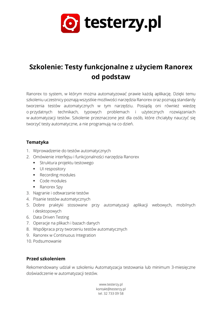Szkolenie: Testy funkcjonalne z użyciem Ranorex od podstaw Ranorex to system, w którym można automatyzować prawie każdą aplikację. Dzięki temu szkoleniu uczestnicy poznają wszystkie możliwości narzędzia Ranorex oraz poznają standardy tworzenia testów automatycznych w tym narzędziu. Posiądą oni również wiedzę o przydatnych technikach, typowych problemach i użytecznych rozwiązaniach w automatyzacji testów. Szkolenie przeznaczone jest dla osób, które chciałyby nauczyć się tworzyć testy automatyczne, a nie programują na co dzień. Tematyka 1. Wprowadzenie do testów automatycznych 2. Omówienie interfejsu i funkcjonalności narzędzia Ranorex Struktura projektu testowego UI respository Recording modules Code modules Ranorex Spy 3. Nagranie i odtwarzanie testów 4. Pisanie testów automatycznych 5. Dobre praktyki stosowane przy automatyzacji aplikacji i desktopowych 6. Data Driven Testing 7. Operacje na plikach i bazach danych 8. Współpraca przy tworzeniu testów automatycznych 9. Ranorex w Continuous Integration 10. Podsumowanie webowych, mobilnych Przed szkoleniem Rekomendowany udział w szkoleniu Automatyzacja testowania lub minimum 3-miesięczne doświadczenie w automatyzacji testów. www.testerzy.pl [email protected] tel. 32 733 09 58 Metody szkolenia Kurs jest warsztatem praktycznym z wieloma przykładami, ćwiczeniami oraz zadaniami. Prowadzący to jedynie praktycy o umiejętnościach mentorskich i coachingowych - teoretyków brak. Materiały szkoleniowe Będąc uczestnikiem szkolenia „Testy funkcjonalne z użyciem Ranorex od podstaw” otrzymasz komplet starannie opracowanych materiałów szkoleniowych w formie podręcznika opisującego zagadnienia omawiane podczas szkolenia oraz pełen dostęp do materiałów elektronicznych na platformie EDU. Po szkoleniu Uczestnik kursu posiądzie umiejętność instalacji i obsługi Ranorexa. Nauczy się optymalnie przygotowywać skrypty testowe. Będzie gotowy do podjęcia pracy z narzędziem. Certyfikat Po ukończonym kursie otrzymasz certyfikat potwierdzający kwalifikacje zdobyte podczas szkolenia. Certyfikat ma formę elektroniczną, co umożliwia łatwe udostępnianie go drogą internetową. Rozmiar i rozdzielczość pliku umożliwia wysokiej jakości wydruk. Opieka poszkoleniowa Po zakończonym szkoleniu dajemy Ci możliwość korzystania z merytorycznej pomocy trenera. Jeżeli masz pytania lub jakiekolwiek wątpliwości związane z tematyką odbytego szkolenia, skontaktuj się z trenerem, który będzie do Twojej dyspozycji. Materiały po szkoleniu Po szkoleniu będziesz miał stały i nieograniczony dostęp do elektronicznych materiałów szkoleniowych oraz ich nowszych, zaktualizowanych wersji. Pomoże Ci to utrwalić wiedzę zdobytą w trakcie kursu czy sięgnąć po nią ponownie w razie potrzeby. Czas trwania 2 dni (2 x 8 h) Cena 1 600,00 PLN netto www.testerzy.pl [email protected] tel. 32 733 09 58 Ścieżka rozwoju kompetencji i umiejętności Poniższy schemat obrazuje możliwe ścieżki doskonalenia umiejętności i kompetencji z zakresu testowania oprogramowania. Agendy szkoleń zostały tak skonstruowane, aby nie pokrywać i nie powielać informacji. Na każdym ze szkoleń otrzymasz nową dawkę wiedzy. Poniższy wykres sugeruje jedynie ścieżkę rozwoju w ramach udziału w szkoleniach. Na każdy kurs możesz przyjść bez udziału w innym. W przypadku chęci podejścia do egzaminów ISTQB Poziomu Zaawansowanego (ISTQB Advanced Level) wymagane jest posiadanie certyfikatu na Poziomie Podstawowym (ISTQB Foundation Level). www.testerzy.pl [email protected] tel. 32 733 09 58 Referencje Nasze szkolenia dostarczyliśmy między innymi do: www.testerzy.pl [email protected] tel. 32 733 09 58