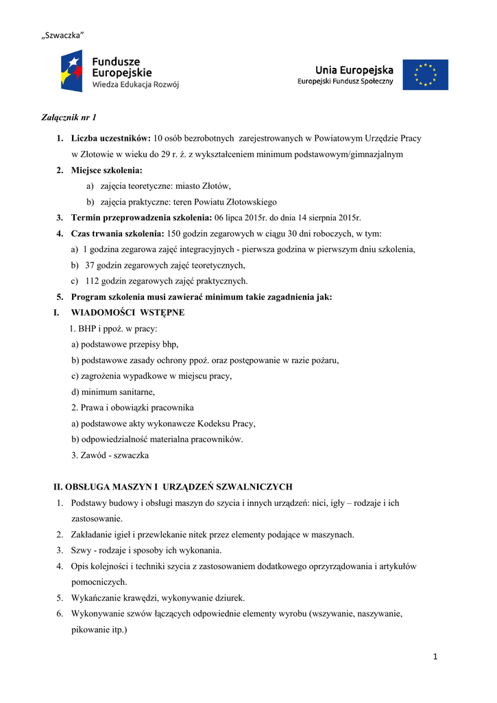 „Szwaczka” Załącznik nr 1 1. Liczba uczestników: 10 osób bezrobotnych zarejestrowanych w Powiatowym Urzędzie Pracy w Złotowie w wieku do 29 r. ż. z wykształceniem minimum podstawowym/gimnazjalnym 2. Miejsce szkolenia: a) zajęcia teoretyczne: miasto Złotów, b) zajęcia praktyczne: teren Powiatu Złotowskiego 3. Termin przeprowadzenia szkolenia: 06 lipca 2015r. do dnia 14 sierpnia 2015r. 4. Czas trwania szkolenia: 150 godzin zegarowych w ciągu 30 dni roboczych, w tym: a) 1 godzina zegarowa zajęć integracyjnych - pierwsza godzina w pierwszym dniu szkolenia, b) 37 godzin zegarowych zajęć teoretycznych, c) 112 godzin zegarowych zajęć praktycznych. 5. Program szkolenia musi zawierać minimum takie zagadnienia jak: I. WIADOMOŚCI WSTĘPNE 1. BHP i ppoż. w pracy: a) podstawowe przepisy bhp, b) podstawowe zasady ochrony ppoż. oraz postępowanie w razie pożaru, c) zagrożenia wypadkowe w miejscu pracy, d) minimum sanitarne, 2. Prawa i obowiązki pracownika a) podstawowe akty wykonawcze Kodeksu Pracy, b) odpowiedzialność materialna pracowników. 3. Zawód - szwaczka II. OBSŁUGA MASZYN I URZĄDZEŃ SZWALNICZYCH 1. Podstawy budowy i obsługi maszyn do szycia i innych urządzeń: nici, igły – rodzaje i ich zastosowanie. 2. Zakładanie igieł i przewlekanie nitek przez elementy podające w maszynach. 3. Szwy - rodzaje i sposoby ich wykonania. 4. Opis kolejności i techniki szycia z zastosowaniem dodatkowego oprzyrządowania i artykułów pomocniczych. 5. Wykańczanie krawędzi, wykonywanie dziurek. 6. Wykonywanie szwów łączących odpowiednie elementy wyrobu (wszywanie, naszywanie, pikowanie itp.) 1 „Szwaczka” 7. Obsługa maszyny do szycia typu: min. owerlok, stębnówka, maszyny 1 i 2-igłowe 6. Organizacja zajęć: 1) warunki ogólne: a) zajęcia będą trwały nie mniej niż 5 godzin zegarowych dziennie w każdym dniu szkolenia, ponadto musi zostać przeprowadzona 1 godzina zajęć integracyjnych w pierwszym dniu szkolenia, b) zajęcia odbywać się będą według planu nauczania obejmującego przeciętnie nie mniej niż 25 godzin zegarowych w tygodniu, c) zajęcia nie mogą trwać dłużej niż do godziny 16:00. każdy uczestnik szkolenia musi zostać wyposażony w materiały szkoleniowe tj. d) brulion 16 kartkowy formatu A5, długopis, skrypty tematyczne zgodne z zakresem szkolenia, przekazane uczestnikom szkolenia za potwierdzeniem odbioru, z wyszczególnieniem przekazanych materiałów szkoleniowych na własność. e) pomieszczenia, w których odbywać się będzie szkolenie powinno być oznaczone poprzez wywieszenie plakatu, tablicy, naklejki lub innego rodzaju materiału zawierającego dwa podstawowe logotypy: Logo Programu Operacyjnego Wiedza Edukacja Rozwój 20142020 oraz logotyp Unii Europejskiej z odwołaniem słownym do Unii Europejskiej i Europejskiego Funduszu Społecznego oraz informację o realizowaniu szkolenia współfinansowanego ze środków Unii Europejskiej w ramach Europejskiego Funduszu Społecznego zgodnie z wytycznymi dotyczącymi oznaczenia projektów w ramach Programu Operacyjnego Wiedza Edukacja Rozwój 2014-2020. 2) organizacja zajęć teoretycznych: a) miejsce: miasto Złotów, b) zajęcia teoretyczne muszą odbywać się w sali szkoleniowej o powierzchni minimum 25m2, spełniającej wymagania ergonomiczne i bhp, wyposażone w odpowiednią ilość miejsc i stolików, dla każdego uczestnika odrębne miejsce tj. 10 stanowisk szkoleniowych; c) uczestnicy szkolenia muszą mieć możliwość skorzystania z pomieszczeń sanitarnych i socjalnych; d) pomieszczenie musi być wyposażone w narzędzia i sprzęt umożliwiający przeprowadzenie szkolenia tj. tablice, projektor multimedialny, ekran oraz niezbędne materiały do szycia w trakcie realizacji zajęć praktycznych, w tym: tkaniny, skóry, igły, nici, nożyce. 3) organizacja zajęć praktycznych: a) miejsce: teren Powiatu Złotowskiego; 2 „Szwaczka” b) miejsce odbywania zajęć praktycznych zgodne z preferencjami i oczekiwaniami kandydata; c) zajęcia praktyczne muszą odbywać się w miejscu wyposażonym w sprawny sprzęt i urządzenia niezbędne do nabycia umiejętności praktycznych maszyny do szycia - różne rodzaje (min. owerlok, stębnówka, maszyna 1i 2-igłowa), w ilości zapewniającej odbycie części praktycznej szkolenia, przez każdego uczestnika szkolenia, tak aby każdy z uczestników miał zapewnione indywidualne odbycie części praktycznej szkolenia; d) uczestnicy szkolenia muszą mieć możliwość skorzystania z pomieszczeń sanitarnych i socjalnych, spełniających wymagania ergonomiczne i bhp; e) pomieszczenia, w których odbywać się będą zajęcia praktyczne, muszą być wyposażone w odpowiednie narzędzia, urządzenia, materiały niezbędne do realizacji części praktycznej szkolenia; f) każdy uczestnik szkolenia musi zostać wyposażony w pierwszym dniu szkolenia praktycznego w odzież ochronną, przekazaną na własność, za pisemnym potwierdzeniem odbioru, z zachowaniem przepisów bhp w tym zakresie, a w szczególności należy przekazać fartuch ochronny. Używane materiały, sprzęt, urządzenia itp. wykorzystywane przy realizacji szkolenia muszą być zgodne z normami polskimi, posiadać stosowne atesty, aprobaty techniczne, certyfikaty i dopuszczenia do użytkowania oraz być zgodne z zaleceniami inspektorów nadzoru. Każdy z uczestników na zajęciach praktycznych musi być wyposażony w równej ilości w odpowiedni sprzęt, materiały i produkty (jeżeli to konieczne w ilości większej), niezbędne w celu zdobycia wymaganych umiejętności. 7. Wymagania kwalifikacyjne stawiane wykładowcom: 1) do realizacji zajęć teoretycznych jednostka szkoleniowa musi wskazać: a) minimum jednego wykładowcę z wykształceniem minimum średnim technicznym, z co najmniej dwuletnim doświadczeniem zawodowym związanym z tematyką szkolenia uzyskanym w okresie ostatnich pięciu lat przed upływem terminu składania ofert, b) minimum jednego wykładowcę 