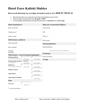 Hotel Euro Kaliski Słubice Rezerwacji dokonuje się wysyłając formularz pod nr fax: 0048 95 758 84 16 Rezerwacja dla swej ważności musi być potwierdzona prze hotel. Rezerwacja jest gwarantowana do godz. 19:00. W przypadku późniejszego przyjazdu prosimy to zaznaczyć w rezerwacji. Dane kontaktowe Dane do wystawienia faktury Imię i nazwisko* Nazwa firmy Telefon kom.* NIP Adres e-mail* Ulica, nr Informacje o pobycie Kod, miasto Data przyjazdu* Forma płatności Data wyjazdu* Sposób płatności (gotówka/przelew/karta płatnicza) Godzina przyjazdu Informacje o rezerwowanych pokojach Pokój Standard (1/2/3 lub 4 osobowy) Pokój Standard Plus (1 osobowy) Pokój Lux (1/2/3 lub 4 osobowy) (ile osób) (ile sztuk) Promocje Nazwa promocji Uwagi 1-osobow y (ile osób) (ile sztuk) (ile osób) (ile sztuk) Pokój z Jacuzzi (ile sztuk) Apartament (ile sztuk) Apartament rodzinny (ile sztuk) Inne Śniadania (tak/nie) * - pola obowiązkowe ……………………………………………………............................................... Data i miejscowość Imię, nazwisko i podpis osoby rezerwującej