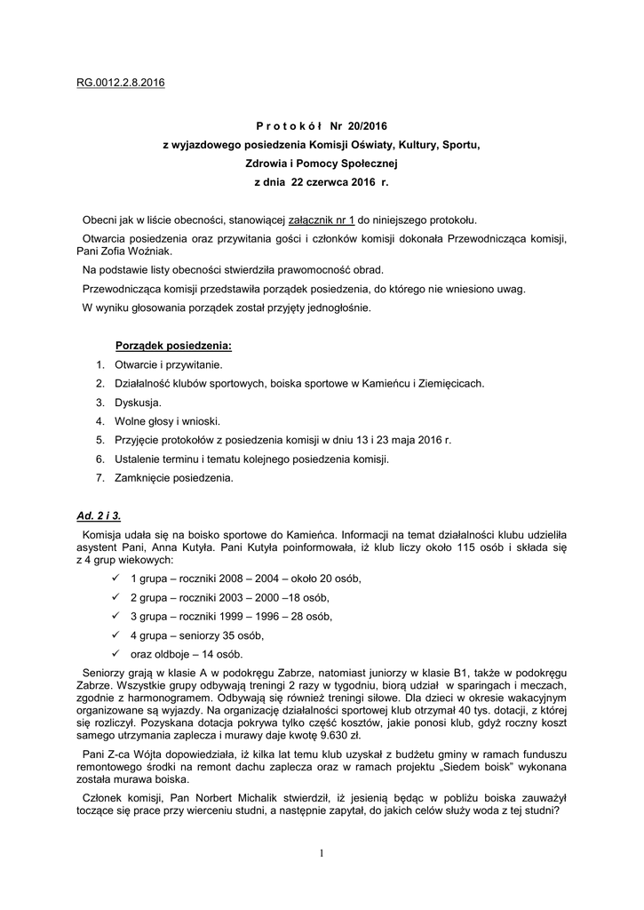 RG.0012.2.8.2016 P r o t o k ó ł Nr 20/2016 z wyjazdowego posiedzenia Komisji Oświaty, Kultury, Sportu, Zdrowia i Pomocy Społecznej z dnia 22 czerwca 2016 r. Obecni jak w liście obecności, stanowiącej załącznik nr 1 do niniejszego protokołu. Otwarcia posiedzenia oraz przywitania gości i członków komisji dokonała Przewodnicząca komisji, Pani Zofia Woźniak. Na podstawie listy obecności stwierdziła prawomocność obrad. Przewodnicząca komisji przedstawiła porządek posiedzenia, do którego nie wniesiono uwag. W wyniku głosowania porządek został przyjęty jednogłośnie. Porządek posiedzenia: 1. Otwarcie i przywitanie. 2. Działalność klubów sportowych, boiska sportowe w Kamieńcu i Ziemięcicach. 3. Dyskusja. 4. Wolne głosy i wnioski. 5. Przyjęcie protokołów z posiedzenia komisji w dniu 13 i 23 maja 2016 r. 6. Ustalenie terminu i tematu kolejnego posiedzenia komisji. 7. Zamknięcie posiedzenia. Ad. 2 i 3. Komisja udała się na boisko sportowe do Kamieńca. Informacji na temat działalności klubu udzieliła asystent Pani, Anna Kutyła. Pani Kutyła poinformowała, iż klub liczy około 115 osób i składa się z 4 grup wiekowych: 1 grupa – roczniki 2008 – 2004 – około 20 osób, 2 grupa – roczniki 2003 – 2000 –18 osób, 3 grupa – roczniki 1999 – 1996 – 28 osób, 4 grupa – seniorzy 35 osób, oraz oldboje – 14 osób. Seniorzy grają w klasie A w podokręgu Zabrze, natomiast juniorzy w klasie B1, także w podokręgu Zabrze. Wszystkie grupy odbywają treningi 2 razy w tygodniu, biorą udział w sparingach i meczach, zgodnie z harmonogramem. Odbywają się również treningi siłowe. Dla dzieci w okresie wakacyjnym organizowane są wyjazdy. Na organizację działalności sportowej klub otrzymał 40 tys. dotacji, z której się rozliczył. Pozyskana dotacja pokrywa tylko część kosztów, jakie ponosi klub, gdyż roczny koszt samego utrzymania zaplecza i murawy daje kwotę 9.630 zł. Pani Z-ca Wójta dopowiedziała, iż kilka lat temu klub uzyskał z budżetu gminy w ramach funduszu remontowego środki na remont dachu zaplecza oraz w ramach projektu „Siedem boisk” wykonana została murawa boiska. Członek komisji, Pan Norbert Michalik stwierdził, iż jesienią będąc w pobliżu boiska zauważył toczące się prace przy wierceniu studni, a następnie zapytał, do jakich celów służy woda z tej studni? 1 W odpowiedzi Z-ca Wójta stwierdziła, iż woda ze studni służy do nawadniania murawy boiska, gdyż jest ona tańsza od wody zakupywanej z sieci wodociągowej. Następnie Komisja udała się do Ziemięcic, celem zobaczenia nowo wybudowanego zaplecza sportowego przy boisku sportowym. Po budynku Komisję oprowadził prezes klubu Pan, Joachim Szczeponik. Z kolei głos zabrała asystent, Pani Anna Kutyła, która przedstawiła krótką informację nt. działalności klubu. Pani Kutyła poinformowała, iż klub LKS składa się z 4 grup: 1 grupa – do lat 13 – 50 osób, 2 grupa – do lat 19 – 30 osób, 3 grupa – od lat 19 – 35 osób, 4 grupa – powyżej 35 lat – 25 osób. Każda grupa trenuje 2 razy w tygodniu, oprócz tego odbywają się rozgrywki i mecze sparingowe. LKS „Pogoń" jest w klasie B w podokręgu Zabrze. Koszt budowy zaplecza wyniósł 331.349 zł, z czego pozyskane z PROW-u dofinansowanie wyniosło 121.952 zł, natomiast koszt dodatkowych zadań wyniósł 43.512 zł. W tamtym roku klub uzyskał dofinansowanie w wysokości 25 tys. zł, z których w całości się rozliczył. Członek komisji, Pani Krystyna Graca zapytała, czy klub lub sołtys zgłaszają jeszcze jakieś potrzeby w ramach klubu, na co Pani Kutyła odpowiedziała, iż nie. Członek komisji, Pan Alojzy Szyguła stwierdził, iż nareszcie powstało zaplecze sportowe, o budowę którego zabiegano od 20 lat. W końcu bez wstydu można przyjmować zawodników, z którymi rozgrywa się mecze oraz sędziów, oferując im właściwe warunki. Nowo powstałym budynkiem będzie można się również pochwalić podczas festynu zorganizowanego z okazji 70-lecia powstania LKS „Pogoń”, który odbędzie się w najbliższych dniach. Budynek powstał dzięki staraniom Wójtów oraz Rady Gminy i będzie służył kolejnym pokoleniom. Mając teraz tak piękne zaplecze piłkarze powinni się zmobilizować do lepszej gry, by możliwy był awans do klasy A. Oficjalne otwarcie nowego zaplecza sportowego przy boisku odbędzie się w najbliższą sobotę o godz. 16:30. Następnie Pan Szyguła zaprosił na festyn z okazji 70-lecia klubu LKS Pogoń Ziemięcice. Członek komisji, Pan Grzegorz Kłaczek zapytał, czy z piłkarzami z Przezchlebia prowadzone są rozmowy w temacie połączenia się z klubem w Ziemięcicach? Członek komisji, Pan Alojzy Szyguła odpowiedział, iż były prowadzone rozmowy, jednakże do porozumienia nie doszło. Pomimo, iż działalność klubu w Przezchlebiu została zawieszona zawodnicy tego klubu nie chcą grać w klubie w Ziemięcicach. Dopowiedział, iż kiedyś w Pogoni głównie grali zawodnicy z innych miejscowości, co teraz się zmieniło. Obecnie większość zawodników stanowią mieszkańcy Ziemięcic. Członek komisji, Pan Klaudiusz Aplik dopowiedział, iż chłopcy, którzy mają jakieś predyspozycje do gry w piłkę nożną zapisują się do profesjonalnych szkółek lub do klubu Piast Gliwice, czy Górnika Zabrze. Członek komisji, Pani Krystyna Graca zapytała, jak zakończyła się sprawa wynajmu boiska sportowego w Przezchlebiu pod działalność sportową, podobną do działalności prowadzonej w Czekanowie? Pani Z-ca Wójta wyjaśniła, iż boisko w Przezchlebiu planowała wynająć ta sama osoba, która prowadzi działalność w Czekanowie, z czego jednak zrezygnowała. Powodem rezygnacji było duże oddalenie Przezchlebia, gdyż może to być przeszkodą do przywożenia dzieci na zajęcia. Członek komisji, Pani Krystyna Graca zapytała, czy klub będzie w stanie utrzymać boisko i zaplecze sportowe, czy klub posiada 