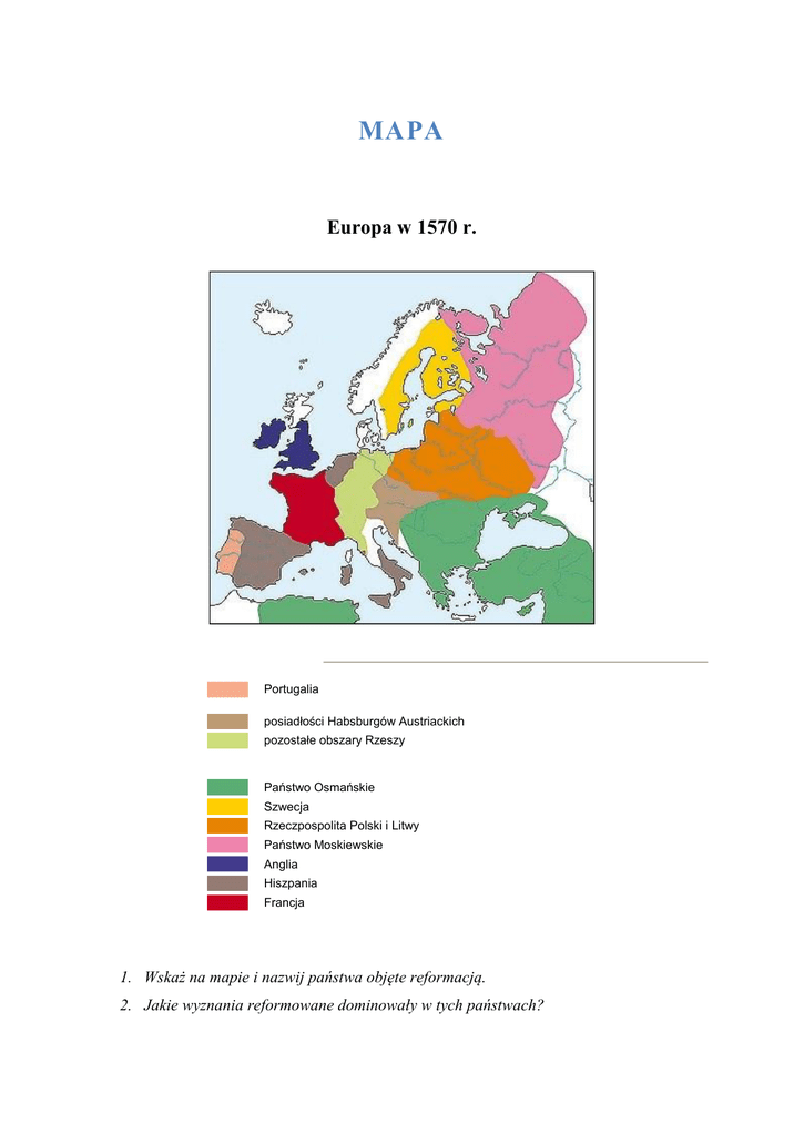 MAPA Europa w 1570 r. Portugalia posiadłości Habsburgów Austriackich pozostałe obszary Rzeszy Państwo Osmańskie Szwecja Rzeczpospolita Polski i Litwy Państwo Moskiewskie Anglia Hiszpania Francja 1. Wskaż na mapie i nazwij państwa objęte reformacją. 2. Jakie wyznania reformowane dominowały w tych państwach? Ad.1. Państwa objęte reformacją to: Anglia, Francja, Państwa Niemieckie, Szwajcaria, Państwa Skandynawskie, Rzeczpospolita Polski i Litwy. Ad.2. Anglia – anglikanizm i kalwinizm Francja – kalwinizm Państwa Niemieckie – luteranizm i kalwinizm Szwajcaria – kalwinizm Państwa Skandynawskie – luteranizm Rzeczpospolita Polski i Litwy – kalwinizm i luteranizm