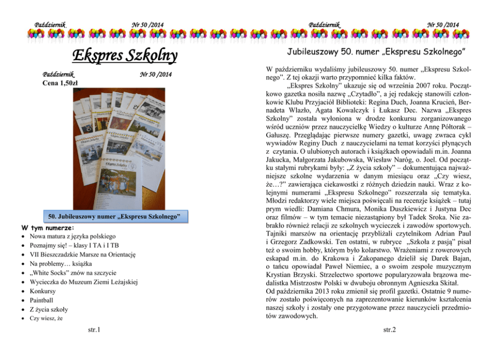 Październik Nr 50 /2014 Ekspres Szkolny Październik Cena 1,50zł Nr 50 /2014 50. Jubileuszowy numer „Ekspresu Szkolnego” W tym numerze: Nowa matura z języka polskiego Poznajmy się! – klasy I TA i I TB VII Bieszczadzkie Marsze na Orientację Na problemy… książka „White Socks” znów na szczycie Wycieczka do Muzeum Ziemi Leżajskiej Konkursy Paintball Z życia szkoły Czy wiesz, że str.1 Październik Nr 50 /2014 Jubileuszowy 50. numer „Ekspresu Szkolnego” W październiku wydaliśmy jubileuszowy 50. numer „Ekspresu Szkolnego”. Z tej okazji warto przypomnieć kilka faktów. „Ekspres Szkolny” ukazuje się od września 2007 roku. Początkowo gazetka nosiła nazwę „Czytadło”, a jej redakcję stanowili członkowie Klubu Przyjaciół Biblioteki: Regina Duch, Joanna Krucień, Bernadeta Wlazło, Agata Kowalczyk i Łukasz Dec. Nazwa „Ekspres Szkolny” została wyłoniona w drodze konkursu zorganizowanego wśród uczniów przez nauczycielkę Wiedzy o kulturze Annę Półtorak – Gałuszę. Przeglądając pierwsze numery gazetki, uwagę zwraca cykl wywiadów Reginy Duch z nauczycielami na temat korzyści płynących z czytania. O ulubionych autorach i książkach opowiadali m.in. Joanna Jakucka, Małgorzata Jakubowska, Wiesław Naróg, o. Joel. Od początku stałymi rubrykami były: „Z życia szkoły” – dokumentująca najważniejsze szkolne wydarzenia w danym miesiącu oraz „Czy wiesz, że…?” zawierająca ciekawostki z różnych dziedzin nauki. Wraz z kolejnymi numerami „Ekspresu Szkolnego” rozszerzała się tematyka. Młodzi redaktorzy wiele miejsca poświęcali na recenzje książek – tutaj prym wiedli: Damiana Chmura, Monika Duszkiewicz i Justyna Dec oraz filmów – w tym temacie niezastąpiony był Tadek Sroka. Nie zabrakło również relacji ze szkolnych wycieczek i zawodów sportowych. Tajniki marszów na orientację przybliżali czytelnikom Adrian Paul i Grzegorz Zadkowski. Ten ostatni, w rubryce „Szkoła z pasją” pisał też o swoim hobby, którym było kolarstwo. Wrażeniami z rowerowych eskapad m.in. do Krakowa i Zakopanego dzielił się Darek Bajan, o tańcu opowiadał Paweł Niemiec, a o swoim zespole muzycznym Krystian Brzyski. Strzelectwo sportowe popularyzowała brązowa medalistka Mistrzostw Polski w dwuboju obronnym Agnieszka Skitał. Od października 2013 roku zmienił się profil gazetki. Ostatnie 9 numerów zostało poświęconych na zaprezentowanie kierunków kształcenia naszej szkoły i zostały one przygotowane przez nauczycieli przedmiotów zawodowych. str.2 Październik Nr 50 /2014 Październik Nr 50 /2014 Na koniec kilka słów o szacie graficznej „Ekspresu Szkolnego”. Pierwsze kilkanaście numerów zostało wydanych w wersji czarno – białej. Pierwszy numer w „kolorze” ukazał się w 2009 roku . Od października ubiegłego roku gazetka dostępna jest także w wersji on – line na stronie: www.zstlezajsk.pl Działania „Fabryki życzliwości” można śledzić na fanpage’u. Przyłączmy się do akcji łańcuszka pozytywnych emocji. Zacznijmy od siebie (Na podstawie artykułu „Fabryka życzliwości” w „Cogito” nr 20/2014r.) „Fabryka życzliwości” „Oswajamy” nową maturę z języka polskiego Przemoc w szkole jest faktem. Według badań Najwyższej Izby Kontroli (NIK) w polskich szkołach są patologie. Najwięcej agresji i przemocy jest w gimnazjach (8,8% uczniów), w szkołach średnich przemoc też występuje, choć na mniejszą skalę (2,2%). Największym problemem jest przemoc słowna, którą wymieniło 74% uczniów i 43% nauczycieli objętych badaniem ankietowym NIK. Na agresję fizyczną wskazało 58% uczniów i 15% nauczycieli. Badania profilaktyczne realizowane przez rządowy program „Bezpieczna i przyjazna szkoła” nie przyniosły oczekiwanych rezultatów. Dlatego młodzi ludzie ze szkół średnich w walce z przemocą mają broń: życzliwość! Uczennice z XXII LO im. José Marti w Warszawie, w ramach akcji „Zwolnieni z Teorii” stworzyły projekt, który ma pokazać, że życzliwość nie musi być wymuszona, a życie niekoniecznie oznacza walkę o przetrwanie. Dziewczyny zaczęły pracę od siebie – na początek częściej uśmiechały się do kolegów i koleżanek, mając w zamiarze zarazić ich dobrym humorem. Rekcje na to zachowanie były różne, ale ich celem było to, aby reakcja łańcuszkowa życzliwości poszła dalej. Do kolejnej akcji dołączyło Regionalne Centrum Krwiodawstwa i Krwiolecznictwa, stwarzając punkt poboru krwi w tej szkole. Młodzież miała okazję podarować komuś więcej niż dobre słowo – krew dla potrzebujących. Uczennice planują kolejne akcje propagujące życzliwość. Egzamin maturalny z języka polskiego od 2015r. przebiegać będzie w zupełnie nowej formule. Budzi to wiele emocji i obaw wśród uczniów. Rzeczywiście, wymagał on będzie większego zaangażowania zdającego, to znaczy pokazania, że jest świadomym odbiorcą literatury i kultury oraz że potrafi tworzyć własną wypowiedź, zarówno ustną, jak i pisemną. Część ustna egzaminu sprawdza umiejętność tworzenia wypowiedzi na określony temat, zgodnej z zasadami poprawności językowej, logiki i retoryki. Zdający losuje zadanie egzaminacyjne zawierające tekst kultury( literacki , ikoniczny lub też popularnonaukowy z zakresu wiedzy o języku) oraz odnoszące się do niego polecenie i ma nie więcej niż 15 minut na przygotowanie wypowiedzi. Następnie przez około 10 min. wygłasza wypowiedź monologową na zadany temat. Kolejnym etapem jest rozmowa zdającego z zespołem egzaminacyjnym. W trakcie rozmowy członkowie zespołu mogą prosić o dodatkowe wyjaśnienia, zachęcać do pogłębienia wybranych aspektów wypowiedzi itp. Poniżej zamieszczamy przykładowe zadanie wraz z jego realizacją: str.3 Temat: W jaki sposób w utworach literackich bywają przedstawieni intelektualiści? Omów zagadnienie, odwołując się do załączonej bajki Ign
