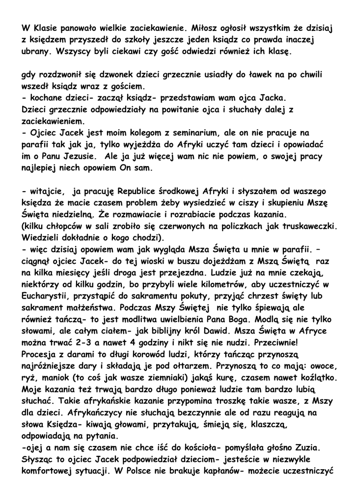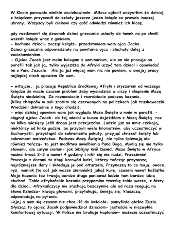 W Klasie panowało wielkie zaciekawienie. Miłosz ogłosił wszystkim że dzisiaj z księdzem przyszedł do szkoły jeszcze jeden ksiądz co prawda inaczej ubrany. Wszyscy byli ciekawi czy gość odwiedzi również ich klasę. gdy rozdzwonił się dzwonek dzieci grzecznie usiadły do ławek na po chwili wszedł ksiądz wraz z gościem. - kochane dzieci- zaczął ksiądz- przedstawiam wam ojca Jacka. Dzieci grzecznie odpowiedziały na powitanie ojca i słuchały dalej z zaciekawieniem. - Ojciec Jacek jest moim kolegom z seminarium, ale on nie pracuje na parafii tak jak ja, tylko wyjeżdża do Afryki uczyć tam dzieci i opowiadać im o Panu Jezusie. Ale ja już więcej wam nic nie powiem, o swojej pracy najlepiej niech opowiem On sam. - witajcie, ja pracuję Republice środkowej Afryki i słyszałem od waszego księdza że macie czasem problem żeby wysiedzieć w ciszy i skupieniu Mszę Święta niedzielną. Że rozmawiacie i rozrabiacie podczas kazania. (kilku chłopców w sali zrobiło się czerwonych na policzkach jak truskaweczki. Wiedzieli dokładnie o kogo chodzi). - więc dzisiaj opowiem wam jak wygląda Msza Święta u mnie w parafii. – ciągnął ojciec Jacek- do tej wioski w buszu dojeżdżam z Mszą Świętą raz na kilka miesięcy jeśli droga jest przejezdna. Ludzie już na mnie czekają, niektórzy od kilku godzin, bo przybyli wiele kilometrów, aby uczestniczyć w Eucharystii, przystąpić do sakramentu pokuty, przyjąć chrzest święty lub sakrament małżeństwa. Podczas Mszy Świętej nie tylko śpiewają ale również tańczą- to jest modlitwa uwielbienia Pana Boga. Modlą się nie tylko słowami, ale całym ciałem- jak biblijny król Dawid. Msza Święta w Afryce można trwać 2-3 a nawet 4 godziny i nikt się nie nudzi. Przeciwnie! Procesja z darami to długi korowód ludzi, którzy tańcząc przynoszą najróżniejsze dary i składają je pod ołtarzem. Przynoszą to co mają: owoce, ryż, maniok (to coś jak wasze ziemniaki) jakąś kurę, czasem nawet koźlątko. Moje kazania też trwają bardzo długo ponieważ ludzie tam bardzo lubią słuchać. Takie afrykańskie kazanie przypomina troszkę takie wasze, z Mszy dla dzieci. Afrykańczycy nie słuchają bezczynnie ale od razu reagują na słowa Księdza- kiwają głowami, przytakują, śmieją się, klaszczą, odpowiadają na pytania. -ojej a nam się czasem nie chce iść do kościoła- pomyślała głośno Zuzia. Słysząc to ojciec Jacek podpowiedział dzieciom- jesteście w niezwykle komfortowej sytuacji. W Polsce nie brakuje kapłanów- możecie uczestniczyć we Mszy Świętej nawet codziennie i już niedługo będziecie mogli korzystać z sakramentu pokuty gdy tego będziecie potrzebować. W Afryce na kapłana czasem ludzie czekają wiele miesięcy. Są też takie miejsca gdzie ludzie, którzy uczestniczą we Mszy Świętej są wyszydzani i prześladowani. Kiedy przygotowujecie się w domu do wyjścia na niedzielną Eucharystie pomyślcie o tym, że jesteście wielkimi szczęściarzami. Tak blisko niemal na wyciągnięcie ręki mamy dostęp do sakramentów świętych na które inni czekają miesiącami, a często i latami. Potem dzieci długo jeszcze zadawały pytania dotyczące życia w Afryce. Dowiedziały się że dzieci tam mają bardzo ciężkie życie, często nie mogą chodzić do szkoły bo muszą pracować jak dorośli albo chodzić bardzo dużo kilometrów po wodę pitną. - mam nadzieje- powiedział na koniec lekcji ojciec Jacek- że od dzisiejszego dnia nie będziecie już rozrabiać w kościele. A ja was proszę pamiętajcie w modlitwie o misjonarzach i dzieciach na misjach.