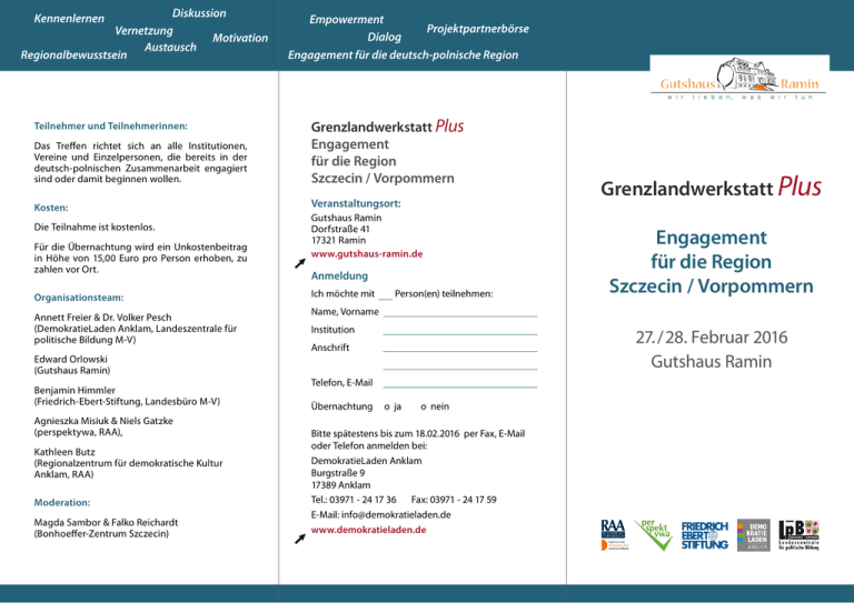 Diskussion Vernetzung Motivation Austausch Regionalbewusstsein Kennenlernen Empowerment Projektpartnerbörse Dialog Engagement für die deutsch-polnische Region Das Treffen richtet sich an alle Institutionen, Vereine und Einzelpersonen, die bereits in der deutsch-polnischen Zusammenarbeit engagiert sind oder damit beginnen wollen. Grenzlandwerkstatt Plus Engagement für die Region Szczecin / Vorpommern Kosten: Veranstaltungsort: Teilnehmer und Teilnehmerinnen: Die Teilnahme ist kostenlos. Für die Übernachtung wird ein Unkostenbeitrag in Höhe von 15,00 Euro pro Person erhoben, zu zahlen vor Ort. Organisationsteam: Annett Freier & Dr. Volker Pesch (DemokratieLaden Anklam, Landeszentrale für politische Bildung M-V) Edward Orlowski (Gutshaus Ramin) Benjamin Himmler (Friedrich-Ebert-Stiftung, Landesbüro M-V) Agnieszka Misiuk & Niels Gatzke (perspektywa, RAA), Kathleen Butz (Regionalzentrum für demokratische Kultur Anklam, RAA) Moderation: Magda Sambor & Falko Reichardt (Bonhoeffer-Zentrum Szczecin) Gutshaus Ramin Dorfstraße 41 17321 Ramin www.gutshaus-ramin.de Anmeldung Ich möchte mit Person(en) teilnehmen: Grenzlandwerkstatt Plus Engagement für die Region Szczecin / Vorpommern Name, Vorname Institution 27. /28. Februar 2016 Gutshaus Ramin Anschrift Telefon, E-Mail Übernachtung o ja o nein Bitte spätestens bis zum 18.02.2016 per Fax, E-Mail oder Telefon anmelden bei: DemokratieLaden Anklam Burgstraße 9 17389 Anklam Tel.: 03971 - 24 17 36 Fax: 03971 - 24 17 59 E-Mail: [email protected] www.demokratieladen.de Grenzlandwerkstatt Plus Engagement für die Region Szczecin / Vorpommern Hintergrund Die Veranstaltung Sonnabend, 27.02.2016 Die Metropole Szczecin dehnt sich aus. Gewerbe, Handel und Industrie siedeln sich auf der grünen Wiese an. Aus Stadtbewohnern werden Vorstädter, aus Dörflern werden Pendler – der ländliche Raum um die Stadt herum entwickelt sich allmählich zum Speckgürtel. Nicht nur die deutsche Seite der Region macht sich Hoffnungen davon wirtschaftlich zu profitieren. Gleichzeitig wachsen aber auch Unsicherheiten und Ängste vor den Transformationsprozessen, die sich in Vorpommern, der Uckermark und Westpommern vollziehen. In der Tradition der in den vergangenen Jahren durchgeführten Grenzlandcafés und Grenzlandwerkstätten möchten wir Sie zu einem Treffen in das Gutshaus Ramin einladen, um wieder einen Schritt weiter zu gehen. ab 09:00 Uhr Über Generationen hatte man es sich beiderseits der Grenze in einem Leben in Randlage eingerichtet. Heute wandern auf der deutschen Seite viele junge Menschen ab, weil sie sich westwärts bessere Chancen für ein erfülltes Leben erhoffen. Zugleich ziehen polnische Neubürger in die Region. Sie bringen häufig eine eher pragmatisch-wirtschaftsliberale Einstellung mit und eine wertvolle, bisher nicht existierende StadtLand-Beziehung. Diese Entwicklung bringt viele Herausforderungen für die gesamte Region mit sich. Eine davon ist der weitere Auf- und Ausbau einer starken Zivilgesellschaft, die Landes- und Sprachgrenzen überwindet. In moderierten Arbeitsgruppen sollen verschiedene grenzüberschreitende Lebensbereiche betrachtet und jeweils ausgehend von einer ersten Ideensammlung konkrete Netzwerkprojekte entwickelt werden. Sprachmittler unterstützen die Arbeitsgruppen. Die Ergebnisse werden im Plenum vorgestellt und Kooperationsmöglichkeiten ausgelotet. Anreise, Zimmerbelegung 10:00 – 12:30 Uhr Einführungsphase Begrüßung, Orientierung, Vorstellung, Kennenlernen, Formulierung von Erwartungen, Ideensammlung (dazwischen gegen 11.15 Kaffeepause) 12:30 Uhr Mittagessen 13:30 – 19:00 Uhr Erarbeitungsphase Entwicklung konkreter Projektideen in den Arbeitsgruppen, Sammlung und Zusammenführung, Klärung der Umsetzungsbedingungen, vorläufige Auswertung (dazwischen gegen 15.00 und 17.00 Pausen) Damit die Ideen und Projekte keine Luftschlösser bleiben, sind auch Vertreterinnen und Vertreter von Stiftungen und anderen Einrichtungen eingeladen, die bei der späteren Umsetzung finanziell und mit ihrem Erfahrungsreichtum helfen können. 19:00 Uhr Abendessen Den ersten Tag beschließen möchten wir gerne mit einem informellen Beisammensein, bei dem wir am Kamin unsere Ideen gemeinsam „weiterspinnen“ können. Wir laden Sie daher herzlich dazu ein, die Option der Übernachtung im Gutshaus Ramin in Anspruch zu nehmen. ab ca. 11:00 Uhr Abschlussphase Abends Gespräche an Kamin und Feuerschale Sonntag, 28.02.2016 09:00 – 13:00 Uhr Polnisch-deutscher Projektbrunch mit Fortsetzung der Erarbeitungsphase und Vorstellung und Diskussion von Projekten und Kooperationen, Abschlussdiskussion, Verabschiedung (Ende der Veranstaltung gegen 13.00 Uhr)