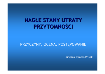 NAGŁE STANY UTRATY PRZYTOMNOŚCI PRZYCZYNY, OCENA, POSTĘPOWANIE Monika Panek-Rosak Najczęstsze przyczyny hipoglikemia przedawkowanie leków urazy głowy udary OUN SAH drgawki zatrucie alkoholem Inne moŜliwe przyczyny niewydolność oddechowa niewydolność krąŜenia wstrząs hipo-/ hipertermia śpiączki cukrzycowe zapalenie opon m-r i mózgu padaczka i inne… MOVE, STUPID! metabolic oxygen deficiency to the brain vascular disorders electrolite/endocrine seizures, structural disorders trauma, tumor, temperature uremic/hepatic encephalopathy porphiria, psychiatric disorders infections drugs, degenerative disorders Pierwszy krok ABC: airway (C-spine) breathing circulation Jak się do tego zabrać??? szybka ocena neurologiczna (GCS, źrenice) ABC jednocześnie !!! •tlenoterapia •monitorowanie •dostęp i.v., podłącz płyny •poziom glikemii A - airway • • • • manewry ręczne (BLS) rurka ustno-gardłowa intubacja dotchawicza* stabilizacja kręgosłupa szyjnego przy podejrzeniu urazu B - breathing • wydolny oddechowo, GCS > 8: – maska twarzowa, tlen 12-15 l/min • niewydolny oddechowo: – intubacja dotchawicza i 100% tlen (respirator) – AMBU z rezerwuarem i max przepływ O2 (do 80% O2 w mieszaninie oddechowej FiO2 – 0.8) – LMA + AMBU – maska twarzowa + AMBU (pomocna rurka u-g) C - circulation • sprawdź: HR, BP, skórę (kolor,ucieplenie, poty) • brak HR ⇒ ALS wg ERC 2005 • dostęp i.v. i płyny • monitorowanie! Ocena neurologiczna skala GCS ocena źrenic – wielkość, symetria, reaktywność poziom glikemii – szybka interwencja w hipoglikemii: 50 ml 40% glukozy i.v. drgawki – diazepam 0,1 mg/kg i.v. podejrzenie zatrucia narkotykami – rozwaŜ naloxon (0,4 mg i.v.) Zbierz wywiad – jak się da… okoliczności znalezienia pacjenta zachowanie pacjenta przed utratą przytomności uraz??? dotychczasowy wywiad chorobowy leki dokumentacja medyczna niedawne pobyty w krajach egzotycznych… BADANIE PRZEDMIOTOWE Układ oddechowy Tachypnoe niedroŜność, aspiracja kwasica ketonowa niewydolność wątroby/nerek zatrucie salicylanami alkohole niespoŜywcze Bradypnoe leki: barbiturany, opioidy, TLPD wzrost ICP Układ krąŜenia Tachykardia niedroŜność d.o. hipowolemia tachyarytmie (SVT, VT) leki antycholinergiczne AF (moŜliwe skojarzenie z udarem OUN) Bradykardia hipoksja blok A-V III st. przedawkowanie ßblokerów, Ca-blokerów zatrucie digoksyną wzrost ICP Układ krąŜenia Hipotensja hipoksja wstrząs zatrucie Hipertensja wzrost ICP Badanie neurologiczne skala GCS, źrenice siła mięśniowa odruchy sztywność karku ocena ciemiączka u małych dzieci objawy ogniskowe ocena dna oka, błony bębenkowej Badania dodatkowe poziom glikemii gazometria krwi tętniczej podstawowe badania laboratoryjne badania toksykologiczne EKG CT OUN RTG klp GLASGOW COMA SCALE Otwieranie oczu spontaniczne 4 na polecenie 3 na bodziec bólowy 2 brak reakcji 1 Reakcja motoryczna poprawna reakcja na polecenie 6 lokalizacja i próba przerwania bodźca bólowego 5 wycofanie ręki po ucisku na płytkę paznokciową 4 nieprawidłowa reakcja zgięciowa 3 nieprawidłowa reakcja wyprostna 2 brak reakcji 1 Odpowiedź słowna: „Który mamy rok?” poprawna 5 błędny rok 4 słowna bez sensu 3 niezrozumiałe dźwięki 2 brak odpowiedzi 1 GLASGOW COMA SCALE max 15 pkt min 3 pkt GCS < 8 pkt nieprzytomny, zabezpiecz drogi oddechowe POZYCJA BEZPIECZNA • • • • nieprzytomny wydolny oddechowo wydolny krąŜeniowo weryfikacja oceny ABC
