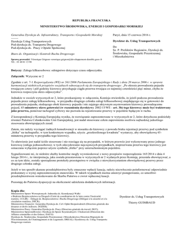 REPUBLIKA FRANCUSKA MINISTERSTWO ŚRODOWISKA, ENERGII I GOSPODARKI MORSKIEJ Generalna Dyrekcja ds. Infrastruktury, Transportu i Gospodarki Morskiej ------Dyrekcja Usług Transportowych Pod-dyrekcja ds. Transportu Drogowego Pod-dyrekcja ds. Pracy i Opieki Społecznej Biuro ds. Organizacji i Kontroli Ruchu Drogowego Paryż, dnia 15 czerwca 2016 r. Dyrektor ds. Usług Transportowych Do Sz. P. Prefektów Regionów, Dyrekcji ds. Środowiska, Gospodarki Przestrzennej i Mieszkalnictwa Sprawę prowadzi: Véronique Grignon [email protected] Tél. : 01 40 81 13 90 Dotyczy: Załoga kilkuosobowa: odstępstwo dotyczące czasu odpoczynku. Załącznik: Wytyczne nr 2 Zgodnie z art. 7-1 Rozporządzenia (WE) nr 561/2006 Parlamentu Europejskiego i Rady z dnia 20 marca 2006 r. w sprawie harmonizacji niektórych przepisów socjalnych odnoszących się do transportu drogowego: „Po okresie prowadzenia pojazdu trwającym cztery i pół godziny kierowcy przysługuje ciągła przerwa trwająca co najmniej czterdzieści pięć minut, chyba że kierowca rozpoczyna okres odpoczynku”. Jednakże w swoich wytycznych nr 2, które przekazujemy w załączeniu, Komisja stwierdziła, że jeżeli podczas prowadzenia pojazdu przez załogę kilkuosobową, w przypadku drugiego członka załogi kilkuosobowej znajdującego się w gotowości do prowadzenia pojazdu, siedzącego obok kierowcy pojazdu i nie zajętego aktywnym asystowaniem kierowcy prowadzącemu pojazd, 45-minutowy okres gotowości (w rozumieniu dyrektywy 2002/15/WE - art. 3b) tego kierowcy może być traktowany jako przerwa, ponieważ tachograf cyfrowy nie pozwala na rejestrowanie przerwy w pojeździe będącym w ruchu. Z korespondencji z Komisją Europejską wynika, że rozwiązanie zaprezentowane w wytycznych nr 2, które dotychczas podzielały również Państwa Członkowskie Unii Europejskiej, jest nadal stosowane celem zapewnienia możliwie najbardziej jednolitego stosowania obowiązujących zasad. Zatem, nie należy wyciągać żadnych konsekwencji w stosunku do kierowcy z powodu braku rejestracji przerwy pod symbolem „łóżka” na tachografie; w tym konkretnym wypadku, użycie „przekreślonego kwadratu” wystarczy, aby obowiązkową 45minutową przerwę w przypadku tego kierowcy. To ułatwienie jest nadal ściśle stosowane i nie rozciąga się na przypadek, w którym przewóz jest wykonywany przez jednego kierowcę (załoga jednoosobowa); w tych zdecydowanie najczęstszych przypadkach, nieprzerwana przerwa tego kierowcy jest oznaczana wyłącznie poprzez użycie symbolu „łóżko” przy unieruchomionym pojeździe. Sygnalizowami mi, że niektóre służby kontrolne mogły wywnioskować z nowy przepisów rozporządzenia 165/2014 z dnia 4 lutego 2014 r., że interpretacja, jaka została przestawiona w wytycznych nr 2 wydanych przez Komisję, przestała obowiązywać, a co za tym idzie, zostały sporządzone protokoły przestępstwa w związku z niewykorzystaniem obowiązkowej przerwy przez drugiego członka załogi. Jeżeli w ten sposób ukarane przedsiębiorstwa były zmuszone wpłacić kaucję, należy niezwłocznie poinformować odpowiednie prokuratury o wyżej zaprezentowanym stanowisku. W takich wypadkach można umorzyć postępowanie, co umożliwi przedsiębiorstwom wnioskowanie do Skarbu Państwa o zwrot wpłaconej kaucji. Pozostaję do Państwa dyspozycji na okoliczność udzielenia dodatkowych informacji. Kopia dla: Ministerstwo Spraw Wewnętrznych: Jednostka ds. Koordynacji Walki z Brakiem Bezpieczeństwa na Drogach (Unité de coordination de la lutte contre l'insécurité routière, UCLIR) – Delegat ds. Bezpieczeństwa i Ruchu Drogowego (Délégué à la sécurité et à la circulation routières, DSCR); Ministerstwo Finansów: Generalna Dyrekcja ds. Ceł i Opłat Bezpośrednich (Direction générale des douanes et droits indirects, DGDDI); Ministerstwo Pracy: Generalna Dyrekcja ds. Pracy (Direction générale du travail, DGT); Ministerstwo Sprawiedliwości: Dyrekcja do Spraw Kryminalnych i Ułaskawień (Direction des Affaires criminelles et des Grâces, DACG) Dyrekcja ds. Środowiska, Gospodarki Przestrzennej i Mieszkalnictwa Direction Régionale de l'Environnement, de l'Aménagement et du Logement; DREAL): Dyrektorzy ds. Usług Transportu Drogowego routiers Dyrektor ds. Usług Transportowych Thierry GUIMBAUD PRZEPISY SOCJALNE ODNOSZĄCE SIĘ DO TRANSPORTU Rozporządzenie (WE) nr 561/2006, dyrektywa 2006/22/WE, rozporządzenie (EWG) nr 3821/85 WYTYCZNE NR 2 Dotyczy: Rejestrowania czasu czas spędzonego na dojeździe do miejsca postoju pojazdu objętego zakresem niniejszego rozporządzenia (WE) nr 561/2006. Art. 9 rozporządzenia (WE) n° 561/2006. Zaproponowane podejście: Kierowca, który udaje się w konkretne miejsce, które zostało mu wskazane przez jego pracodawcę, nie będące bazą pracodawcy, aby zabrać „pojazd z tachografem”, spełnia swoje zobowiązanie wobec pracodawcy i od tego momentu nie ma możliwości dowolnego dysponowania swoim czasem. Zatem, zgodnie z art. 9, ust. 2 i 3: – czas spędzony na dojeździe do miejsca postoju pojazdu objętego zakresem niniejszego rozporządzenia lub powrotu z tego miejsca, jeżeli pojazd nie znajduje się ani w miejscu zamieszkania kierowcy, ani w bazie pracodawcy, w której kierowca zwykle pracuje, niezależnie od tego, czy pracodawca udzielił wskazówek dotyczących momentu i warunków danego przewozu lub czy pozostawił tę decyzję kierowcy, powinien być zaliczany do okresu „gotowości” lub do „innej pracy”, zgodnie z ustawodawstwem krajowym Państwa Członkowskiego; et – czas spędzony przez kierowcę kierującego pojazdem nieobjętym zakresem rozporządzenia, do lub z pojazdu objętego zakresem niniejszego rozporządzenia, który nie znajduje się w miejscu zamieszkania kierowcy ani w bazie pracodawcy, gdzie kierowca zazwyczaj pracuje, jest traktowany jako „inna praca”. Czas spędzony na jeździe może być traktowany jak „odpoczynek” lub „przerwa” 