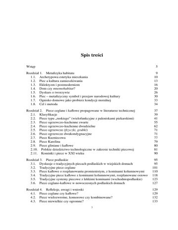 Spis treści Wst˛ep 5 Rozdział 1. Metafizyka habitatu 1.1. Archetypowa estetyka mieszkania 1.2. Piec a kultura zamieszkiwania 1.3. Eklektyzm i postmodernizm 1.4. Dom czy mnemohabitat? 1.5. Dyskurs o tworzywie 1.6. Piec – metafizyczny symbol i przejaw narodowej kultury 1.7. Ognisko domowe jako probierz kondycji moralnej 1.8. Cel i metoda 9 10 13 16 20 26 30 33 34 Rozdział 2. Piece ceglane i kaflowe propagowane w literaturze technicznej 2.1. Klasyfikacje 2.2. Piece typu „ruskiego” (wielofunkcyjne z paleniskami piekarskimi) 2.3. Piece ogrzewczo-kuchenne zwarte 2.4. Piece ogrzewczo-kuchenne dwudzielne 2.5. Piece ogrzewcze (fizyczki, grubki) 2.6. Piece ogrzewcze dwukondygnacyjne 2.7. Piece Kuzniecowa 2.8. Piece Karelina 2.9. Piece gliniane i kaflowe 2.10. Polskie dziedzictwo technologiczne w zakresie techniki piecowej 2.11. Kominki i piece w XXI wieku 37 39 41 55 62 71 71 77 79 80 81 90 Rozdział 3. Piece podlaskie 3.1. Dyskusje o tradycyjnych piecach podlaskich w wiejskich domach 3.2. Tradycyjne piece ceglane 3.3. Piece kaflowe o rozplanowaniu promienistym, z kominami kolumnowymi 3.4. Tradycyjne piece kaflowe z kominami kolumnowymi, rozplanowane osiowo 3.5. Tradycyjne systemy piecowe z lekkimi kominami (wschodniopodlaskie) 3.6. Piece ceglano-kaflowe w nowoczesnych podlaskich domach 95 95 101 110 118 123 127 Rozdział 4. Refleksje, uwagi i wnioski 4.1. Piece ceglane czy kaflowe? 4.2. Piece wielozwrotne, komorowe czy kombinowane? 4.3. Piece niewielkie czy ogromne? 129 129 132 133 3 4 SPIS TREŚCI 4.4. 4.5. 4.6. 4.7. 4.8. Piece jedno- czy wielofunkcyjne? Piece ozdobne czy praktyczne? Próba oceny piecowego dziedzictwa Podlasia Podsumowanie grantu badawczego Wnioski końcowe 135 136 138 142 144 Streszczenie 145 Bibliografia 147