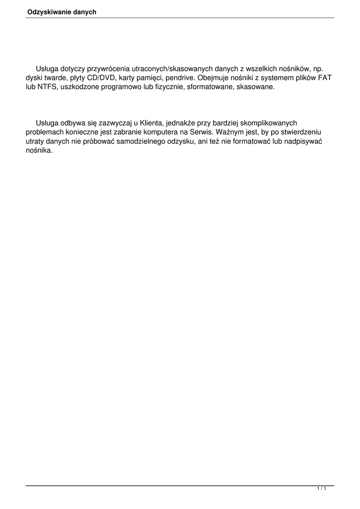 Odzyskiwanie danych Usługa dotyczy przywrócenia utraconych/skasowanych danych z wszelkich nośników, np. dyski twarde, płyty CD/DVD, karty pamięci, pendrive. Obejmuje nośniki z systemem plików FAT lub NTFS, uszkodzone programowo lub fizycznie, sformatowane, skasowane. Usługa odbywa się zazwyczaj u Klienta, jednakże przy bardziej skomplikowanych problemach konieczne jest zabranie komputera na Serwis. Ważnym jest, by po stwierdzeniu utraty danych nie próbować samodzielnego odzysku, ani też nie formatować lub nadpisywać nośnika. 1/1