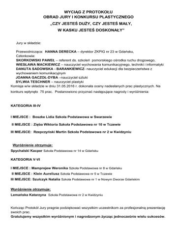 WYCIĄG Z PROTOKOŁU OBRAD JURY I KONKURSU PLASTYCZNEGO „CZY JESTEŚ DUŻY, CZY JESTEŚ MAŁY, W KASKU JESTEŚ DOSKONAŁY” Jury w składzie: Przewodnicząca: HANNA DERECKA – dyrektor ZKPIG nr 23 w Gdańsku, Członkowie: SKORKOWSKI PAWEŁ – referent ds. szkoleń pomorskiego ośrodka ruchu drogowego, WIESŁAWA MACKIEWICZ – nauczyciel wychowania komunikacyjnego, techniki i informatyki DANUTA SADOWSKA - BARANKIEWICZ- nauczyciel edukacji dla bezpieczeństwa z wychowaniem komunikacyjnym JOANNA GACZOŁ-DYBA –nauczyciel sztuki SYLWIA TESCHNER – nauczyciel plastyki Komisja w/w składzie w dniu 31.05.2016 r. dokonała oceny nadesłanych prac plastycznych. Na konkurs wpłynęło 75 prac. Postanowiono przyznać następujące nagrody i wyróżnienia: KATEGORIA III-IV I MIEJSCE : Boszke Lidia Szkoła Podstawowa w Swarzewie II MIEJSCE : Zięba Wiktoria Szkoła Podstawowa nr 10 w Tczewie III MIEJSCE: Rzepczyński Martin Szkoła Podstawowa nr 2 w Kwidzyniu Wyróżnienie otrzymuje: Spychalski Kacper Szkoła Podstawowa nr 14 w Gdańsku KATEGORIA V-VI I MIEJSCE : Mamprejew Weronika Szkoła Podstawowa nr 8 w Gdańsku II MIEJSCE : Klein Aureliusz Szkoła Podstawowa nr 5 w Tczewie III MIEJSCE: Szulczyk Natalia Szkoła Podstawowa nr 1 w Nowym Dworze Gdańskim Wyróżnienie otrzymuje: Lemańska Katarzyna Szkoła Podstawowa nr 2 w Kwidzyniu Kończąc Protokół Jury pragnie podziękować wszystkim uczestnikom za profesjonalną prezentację swoich prac. Gratulujemy wszystkim wyróżnionym i nagrodzonym życząc jednocześnie wielu sukcesów.